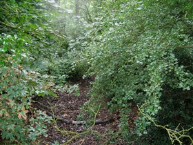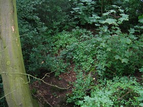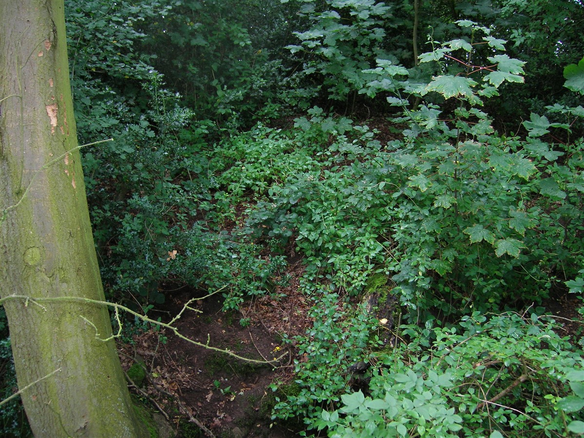 The mound is surrounded by a dry ditch, up to 5m wide, from which material used in the construction of the mound was excavated. Now between 0.5m and 1m in depth, it is crossed on the south side by a causeway which extends further southwards as a ramp, which would have provided vehicular access to the windmill. The ditch is in turn surrounded by an outer bank, also about 5m wide, which stands to a height of about 0.3m. (Scheduling Report)