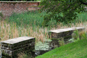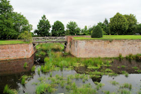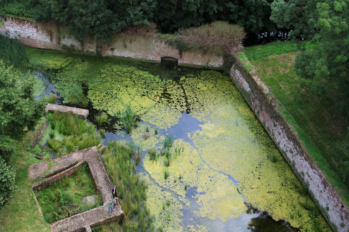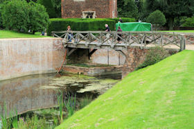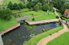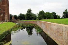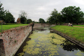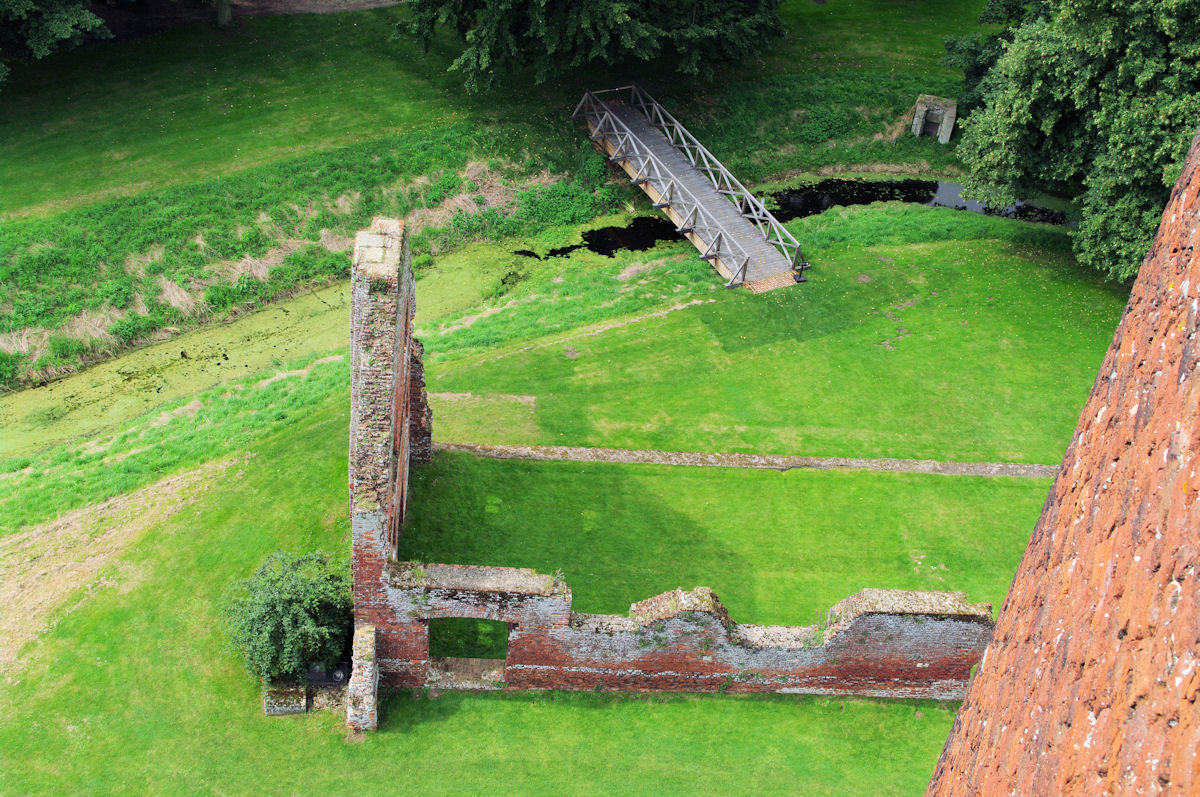 Surrounding the inner moat are the remains of a penannular outer bailey first constructed in the 15th century as part of Cromwell's alterations. The inner and outer moats were originally joined only on the north side, but are now also joined on the east and west sides by modern channels, creating two 'L'-shaped enclosures to the north east and north west. The enclosure to the north east includes the remains of the middle ward, a walled enclosure from which access was gained across the inner moat; within it is the Grade I Listed guardhouse, a small brick building initially converted into a cottage and later into a shop. In the northern part of the ward are the foundations of further buildings including, at the western end, the remains of a gatehouse which guarded the bridge which crossed from the outer ward. The remains of the outer ward are situated in what is now the north western enclosure and include the standing remains of a Grade I Listed rectangular building, thought to have originated as the house of Cromwell's Master of the Horse. On the northern side of this ward are the foundations of a gateway which formerly stood at the south end of a bridge across the outer moat.