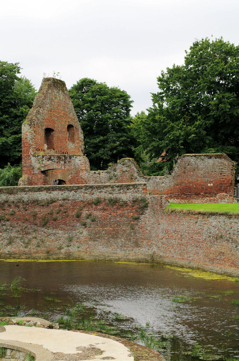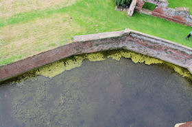 In the western part of the monument are the remains of Tattershall Castle, which now takes the form of an inner moated enclosure with two outer enclosures, also moated, to the north east and north west. The inner moated enclosure originated in about 1231. The first building on the site is thought to have been a stone-built hall located near the western edge of the enclosure, followed by a curtain wall with interval towers, also stone-built, constructed along the inside edge of the moat. The hall survived until the 18th century as a standing ruin but is no longer evident. Parts of the curtain wall survive in the western part of the enclosure adjacent to the later Great Tower, which was built in the 15th century against its outer face. The foundations of two interval towers also survive, one to the north and one to the south of the Great Tower; these are Listed Grade I and take the form of 'D'-shaped projections into the moat, constructed of magnesian limestone, which were later strengthened around the base by the addition of green limestone. The remains of another interval tower have been identified on the south side of the enclosure; there are thought to have been up to eight interval towers originally. The entrance to the early castle is believed to have been from the north east, in the position of the modern bridge, where the foundations of a pier indicate the location of an earlier bridge.