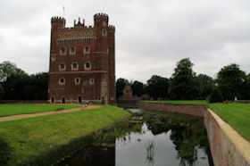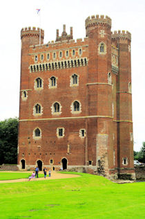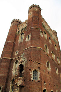 Castle, now monument owned by National Trust. c.1440 built for Ralph Cromwell, Lord High Treasurer, on site of castle built by Robert Tateshale in 1231. Restored in 1911-25 by Lord Curzon. Red brick tower in English bond, with darker lattice lozenge decorations to upper parts, ashlar dressings, leaded roofs. Rectangular plan with facetted angle towers, originally with attached hall to courtyard side. 5 storey with undercroft, irregular 3 bay front with plinth, chamfered ashlar string course and embattled parapet with machicolated base. To ground floor 3 four centred arched doorways. In the plinth a small arched opening to undercroft, and above a small rectangular light. To first floor are 2 two light windows, one with moulded rectangular surround. To second and third floors are 3 two light windows all having cusped heads to the lights, central mullions and 4 centred arched surrounds. Above the machicolations are 8 cusped headed openings in moulded rectangular surrounds. In the tops of the angle towers are single cross shaped arrow loops and the embattled parapets have arcaded brick corbels. On the roof is a bank of 3 tall circular stacks with embattled tops. To either side of the tower can be seen a section of the curtain wall with upper gallery having small rectangular loops with a wall walk above. In the left hand side wall are 3 single large 2 light windows to each floor, having cusped heads to the lights, panel traceried tops and concave moulded surrounds. In the right hand side are 2 large windows matching those to the left. Interior. Undercroft has wide brick segmental tunnel vault, with chambers off. Ground floor parlour has fine chimney piece of Ancaster stone bearing shields of Lord Cromwell and his ancestors. Shallow 4 centred moulded opening with crocketed ogee over. Rectangular shield bearing panel, flanked by half round columns with floriate capitals and having brattished top with frieze of fleurons. 4 centred arched openings to chambers off the parlour. First floor, principal state room is reached by a turning stair in the north east turret with restored inset moulded ashlar handrail. The chimney piece is elaborately carved with grotesque heads on the capitals at either end. In the spandrels are representative carvings, and the panel across the lintel has armorial shields, brattished top with frieze of fleurons. On the north wall are corbels to support a baldequin over the high table. 4 centred brick openings to chambers off. The second floor has a long passage on the east side with fine quadripartite brick vault with moulded ribs and ashlar shield bosses, restored. The Audience Chamber also has a fine chimney piece, bearing shields of arms. On the south wall are corbels to support a canopy over Lord Cromwell's dais. A garderobe chamber on the south side has been converted to a dovecote having side walls lined with mud and lath construction containing circular nesting boxes. The third floor room, the withdrawing Room or Privy Chamber also contains a fine chimney piece. The window recesses in the west wall are elaborately brick vaulted with decorated bosses, and triskeles in the spandrels made of shaped bricks. Above is a roof gallery with covered walkway giving access to the machicolations, and upper walkway behind the embattled parapet, supported on chamfered brick piers with segmental arches. On the rear wall are 2 two light windows to eadch floor, with cusped heads to the lights, panel tracery and 4 centred arched heads. Cromwell employed a German, Baldwin Docheman, to superintend the brickmaking and he worked to foreign, possibly French, designs. The castle was last occupied in the C17, and in the years after 1912 restoration was undertaken by Lord Curzon under the direction of William Weir, architect. (Listed Building Report)