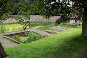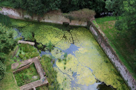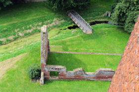 On the south side of the inner moat is a raised area of ground where a garden of the castle is believed to have been located. This area, which lay within the outer bailey of the castle, was formerly approached from the inner ward across a bridge; the foundations of a pier of the bridge survive in the inner moat. To the south and east of the garden area are the buried remains of part of the outer moat which formerly enclosed the garden within the outer bailey. (Scheduling Report)