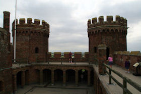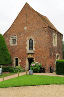 Former guard house, now ticket office and shop. c.1440, altered c.1911. Red brick in English bond, with ashlar dressings, plain tiled roof. 2 storey, 2 bay front with plinth and dentillated eaves course. Off-centre 4 centred arched door, a later insertion in C20, shields in the spandrels and moulded surround. Above the door an ashlar plaque with heraldic shield. To left a single fixed leaded light in 4 centred hollow chamfered arched surround. To first floor, above the door, a taller similar light. To the left, a 2 light window with cusped heads to the lights set in moulded rectangular surround with hood. In the gable an ashlar heraldic shield. In the side walls are single 2 light windows to each floor, and to the rear a doorway with 4 centred head, moulded surround, with to left a 2 light window and to right a single light window. To first floor a further 2 light window. All windows have cusped 4 centred arched heads, concave moulded rectangular surrounds and hoods. Interior retains brick fireplace with chamfered basket arched head. The principal floor joists are on curved braces to the wall posts. The king post roof has arched braces from the tie, 2 tiers of collars, collar purlin and common rafters. On the first floor is garderobe chamber and a further brick arched fireplace. The first floor was originally entered by a set of external steps on the north side. (Listed Building Report)