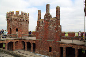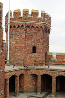 Construction of the Great Tower is believed to have commenced in the 1430s when the castle was converted into a fortified residence by Ralph Lord Cromwell, Treasurer of England. It is a brick-built structure with stone dressings and string-courses, and takes the form of four storeys and a basement on a rectangular plan with octagonal corner turrets. Connected by a passageway to the earlier stone hall, which may have served as an entrance vestibule, the Great Tower contained the private and public apartments of Lord Cromwell. A separate Grade I Listed kitchen block was built adjacent and to the south, also against the outside of the earlier curtain wall and incorporating one of the interval towers; the foundations of these structures have been archaeologically excavated and are now exposed. Other buildings associated with the fortified house, including a chapel, were formerly located in the southern part of the enclosure. In the north eastern corner stood a gatehouse which guarded the bridge across the inner moat. The earlier curtain wall was largely replaced by a brick retaining wall built along the inside edge of the moat, although this was later destroyed and has in turn been replaced by a modern concrete wall. The remains of a similar brick retaining wall on the outer edge of the moat have been restored. The moat wall is Listed Grade I.