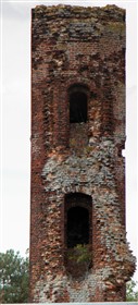 Fragmentary ruin of a tower, only the north west stair tower remains relatively intact. C15, built by the Cromwells of Tattershall Castle. Red brick, originally of 4 storeys, the standing octagonal stair tower is 60 feet high. No details remain but a window opening with semi-circular head can be seen at the top of the tower, some worn stone string courses remain, and the putlog holes are clearly visible. (Listed Building Report)