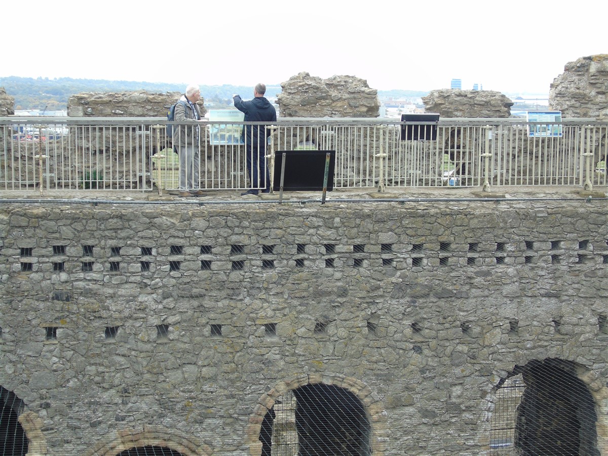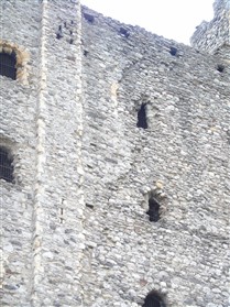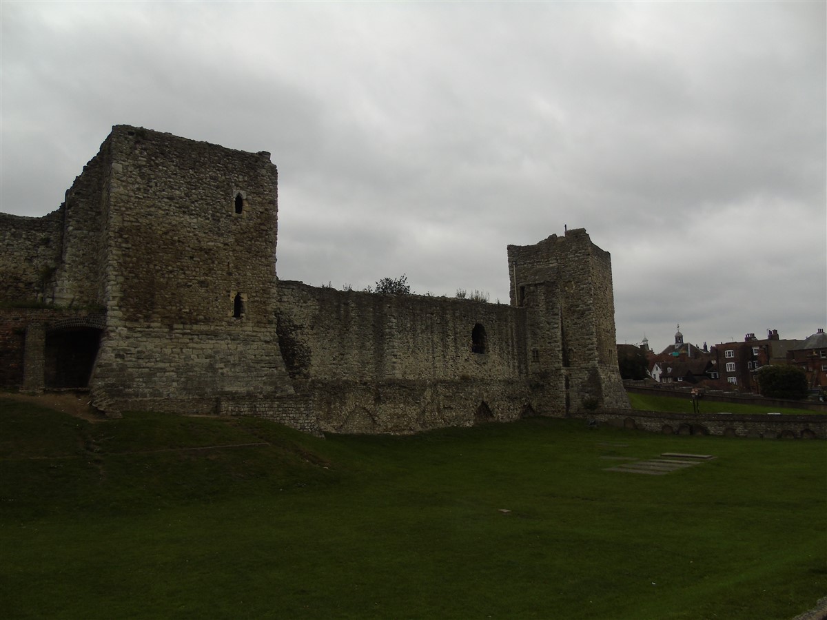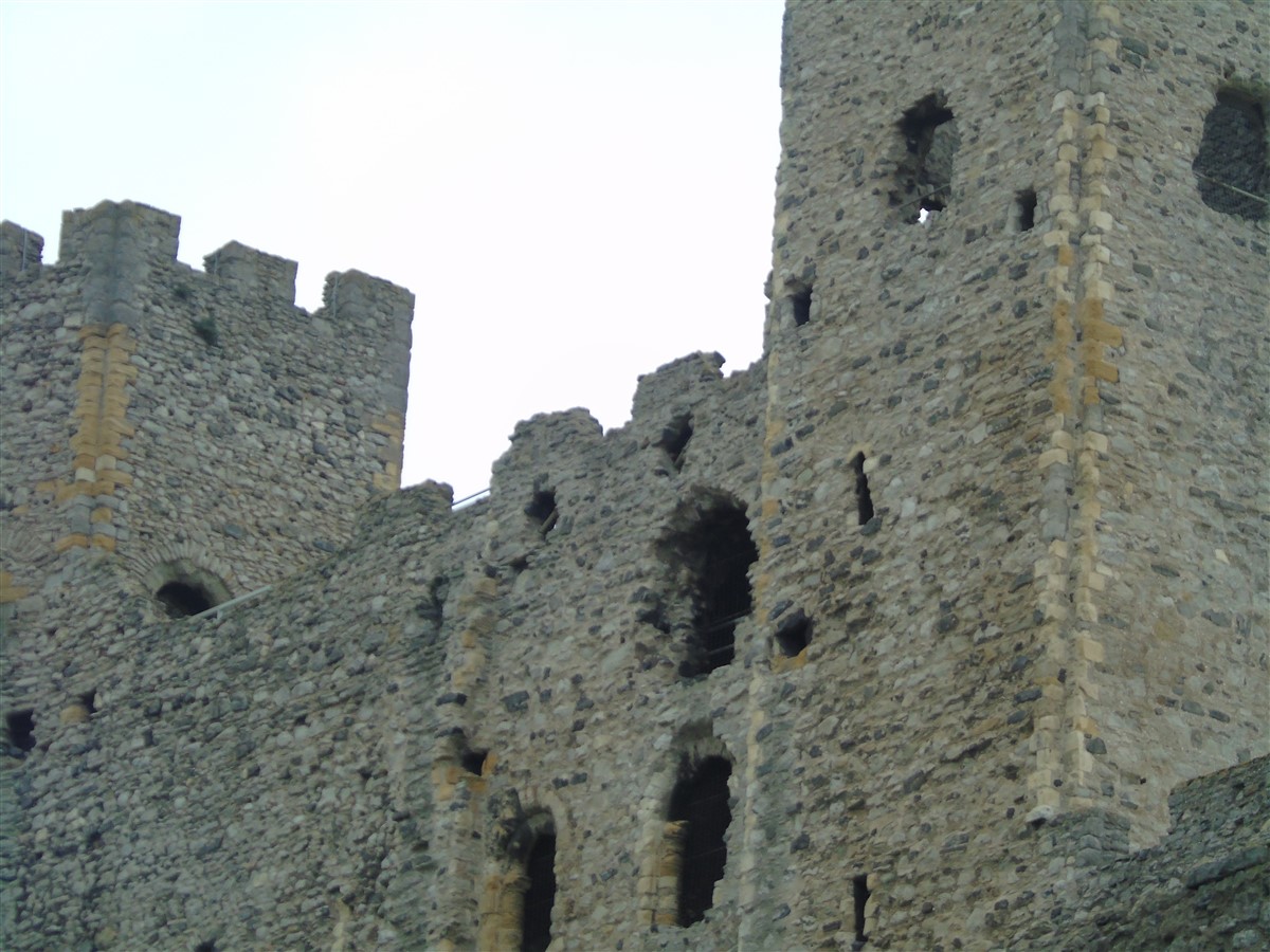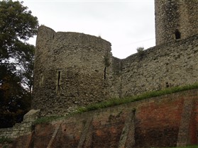 Castle Keep, curtain walls and mural towers to bailey. A building of exceptional significance. Built at the bridging point where Watling Street crosses the Medway. One of the first Norman Castles to be fortified in stone. Bailey walls, 1087-9, built by Gandulf, Bishop of Rochester for William II; keep, 1127, built by Archbishop William of Corbeil, considerable rebuilding and repairs throughout, 1221-32 (after the 1216 siege) and again by Edward III and Richard II, 1367-83; some demolition and alterations, c.1872. Mainly Kentish rag with tufa and chalk rubble. The building is described in detail by R Allen Brown (1986) which should be consulted for further information. Gandulf's curtain wall survives to the W(Mersey side) and incorporates remains of the Roman city wall (see Refs 7/2 and 9/2); strengthened in C13. SE section, including the drum tower, mid-C13; E section (C14) includes 2 curtain walls, one of which (now a cottage) contains vaulted room, spiral stone stair and 2 garderobes. N section of wall, fragmentary, is incorporated into the garden walls to the rear of High Street properties. The N perimeter wall of the present castle precinct is marked by a C20 wall with palings. To the NW, the bastion (1378-83), altered and breached by a prominent Norman-Revival round-headed arched entrance of c1872. Keep, roofless and without principal floors, rectangular on plan with corner turret (that to SE in circular form, Mid C13) and contempotary forebuilding (with chapel and chambers) to N reached from W at 1st floor level. Main building consists of ground-floor basement; 1st floor apartments; great hall and chamber occupying 2 storeys; private apartments above, all divided by massive cross wall pierced by doorways and (at great hall level) a 4-bay arcade. It contains a well shaft. NE stair to all floors; SW stair excludes access to basement. Decoration sparingly applied: externally to principal doorways and upper floor embrasures; internally mainly chevron with some shafting; arcade with scalloped capitals. (Listed Building Report)