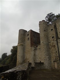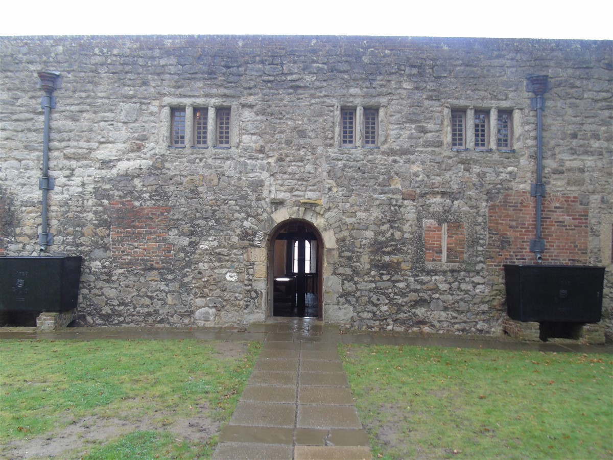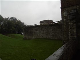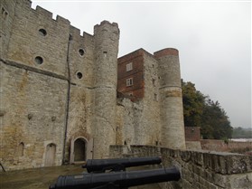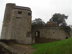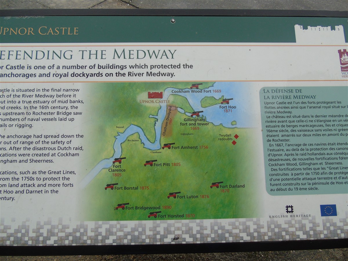 This originally provided accommodation for the garrison, and has a frontage which includes a central, polygonal bay containing a circular staircase, and circular turrets with garderobes, or latrines, projecting from either end. The facade is pierced by original doorways with four-centred heads at ground floor level and by bulls-eye and round headed windows with classical mouldings, inserted during the 18th century, on the first floor. Projecting out over the river from the main building is a low, triangular, open gun platform, known as the water-bastion, which originally housed most of the castle's heavy artillery, now represented by six 19th century guns mounted on their original wooden carriages. The water-bastion receives additional protection from a continually renewed, staked palisade, originally erected in 1600. To the north east and south west are two square, flanking towers linked to the main building by a crenellated curtain wall. These are fronted by semicircular stair turrets which incorporate splayed gun embrasures at first floor level. To the north west the main building is backed by a rectangular courtyard bounded by a stone built curtain wall topped with brick coping. This enclosing wall was largely rebuilt, after being allowed to fall into disrepair, during the 17th century, and is now around 1m thick and c.4m high. Running along the inside of the curtain wall are the brick foundations of now ruined, narrow lean-to buildings, also dating to the 17th century, which were originally used for storage. In the north western corner is a sallyport, with a later inserted oven beside it. The castle's well is situated within the north western quarter of the courtyard. The castle buildings are entered by way of a centrally positioned, four-storeyed gatehouse in the north western side of the curtain wall. This has a central, round-headed gateway, above which is an inserted, late 18th century clock, leading into a wide entrance passage. Flanking the gateway on its inner side are two tall, rectangular corner towers. Gun embrasures pierce the walls of the gatehouse and provide further protection for the entrance. The gatehouse was remodelled during the early 1650's, and heightened in brick after a fire caused substantial damage in 1653. It is now capped by an early 19th century wooden bellcote and modern flagpole. The castle is enclosed on the landward side by a substantial dry ditch, originally 9.8m wide and 5.5m deep, which has become partially infilled over the years. This was originally spanned by a drawbridge, although this no longer survives. By 1588, the year of the Spanish Armada, the castle's garrison included six gunners and a master gunner, and in 1603 it is recorded as housing 19 heavy guns. The castle did not see action until June 1667 when, during the Second Dutch War, an enemy navy squadron under de Ruyter launched a successful surprise attack on the Thames and Medway defences. The squadron broke through the chain boom-defence which had been positioned across the river between Hoo Ness and Gillingham and threatened Chatham dockyard. Much English shipping was destroyed before a hastily organised defence at Upnor stalled the Dutch attack. This episode provoked a radical revision of south eastern coastal defences and the building of new forts along the Medway. These reduced the strategic importance of the by now old fashioned castle and in 1668 it was converted into a magazine and naval storage depot. The depot buildings gradually extended into the area to the north east of the monument which is still used by the Ministry of Defence, disturbing and overlying earlier gun emplacements associated with the castle. The earthwork remains of these are thought to be represented within the monument by a broad bank around 14m wide running parallel with the river from the ground immediately to the north east of the castle towards the adjoining naval depot to the north east. During the 18th century, the castle's accommodation was extended by the construction of a new barracks block and associated storage buildings on land immediately to the south west of the monument. The castle and its depot continued to supply munitions to the navy until 1827, when it was fitted out as an ordnance laboratory. In 1891 responsibilty for the administration of the castle was transferred from the War Office to the Admiralty, and the newly created Naval Armament Supply Department began to use it, amongst other things, as a proofyard. The castle served as part of the Magazine Establishment during World War II, and in 1941 was partially damaged by two bombs which fell in the garden of nearby Upnor House. After 1945 the castle went out of military use and was opened to the public. Upnor Castle continues to form part of the Crown Estate and is now in the care of the Secretary of State. (Scheduling Report)