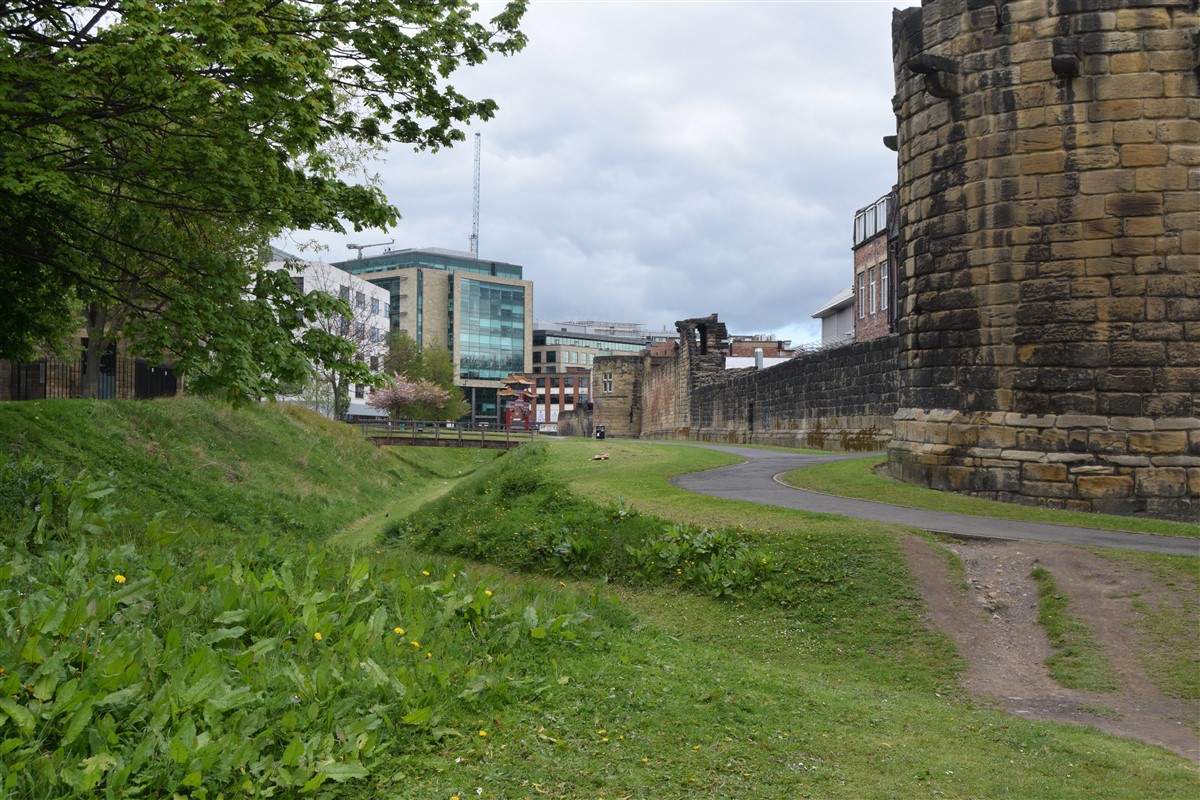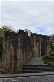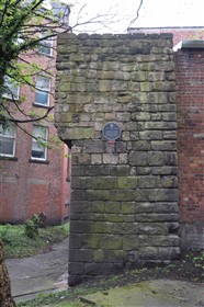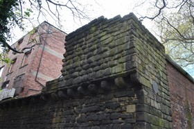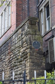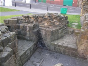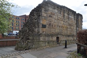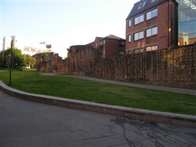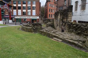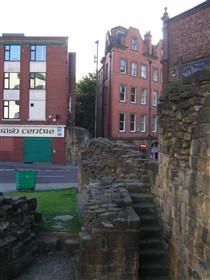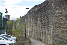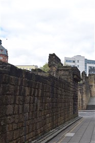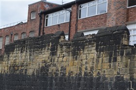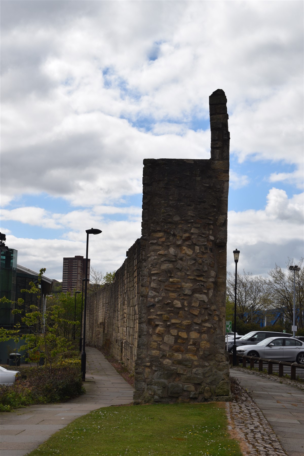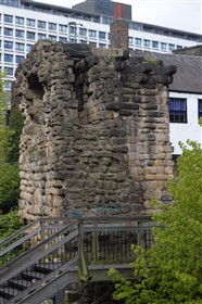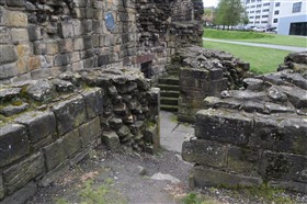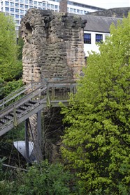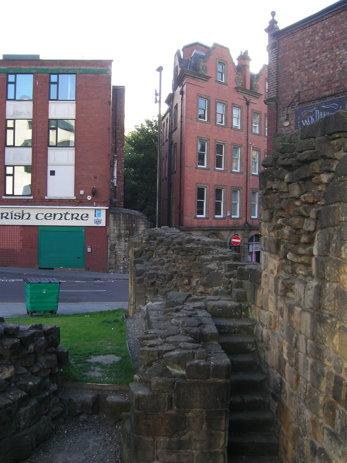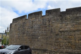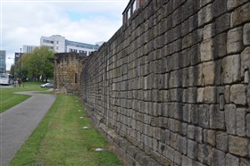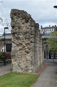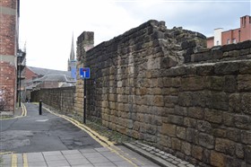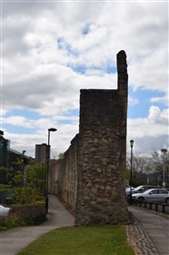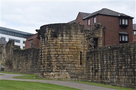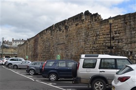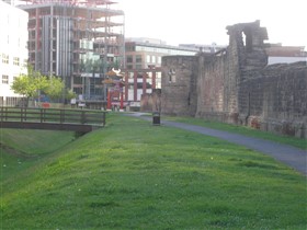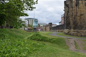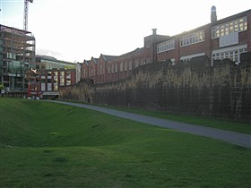 A lesser gateway at Sallyport and two posterns, Blackfriars and Whitefriars, were also built. The wall was strengthened by an external ditch up to 20m wide and 4.5m deep separated from the wall by a berm (a level space between a defensive wall and a ditch in order to defend it). The ditch, known as the King's Dykes was completed in 1316, sometime before completion of the wall. The defences continued to function as the town's main form of defence through to the 19th century. During the 16th and 17th centuries, the towers and some of the gates became the meeting places of a variety of town companies who generally added an upper storey to form a meeting hall. The defences were reinforced during the English Civil War in 1638 when England was threatened by invasion from Scotland. The town was stormed in 1644 by the Scots acting in support of Parliament; the defences were subsequently repaired. In 1745 at the time of the Jacobite uprising the defences were repaired against the rebels which included walling up all of the gateways. The defences were last repaired at the time of the Napoleonic Wars in the early 19th century. Subsequently, when the threat had passed and with the continuing development of Newcastle upon Tyne, their function as a defensive town boundary ceased. The walls were allowed to fall into decay and several sections were levelled in the years following 1823. Newcastle upon Tyne's town defences survive in various states of preservation. Some parts of the curtain wall still stand to full height, and the towers and turrets are also clearly visible. The ditch is also clearly visible for part of the western side as a pronounced earthwork. Other parts of the defences are no longer visible above the present surface of the ground but in these areas, sections of the walls and the ditch survive below ground level as buried features, and sufficient evidence exists for their positions to be accurately identified. Given the role played by the town defences in one of England's major commercial towns and their contribution towards an understanding of medieval and later urban development, all sections of Newcastle's town defences that exhibit significant archaeological remains are considered to be nationally important. The standing remains of the curtain wall between Forth Street and Hanover Street survive well to the height of the parapet walkway. This length of curtain wall is a rare survival, being one of few remaining locations where the curtain wall remains upstanding and highly visible. Taken together with the buried remains of the curtain wall it represents one of the most complete lengths of the circuit. The buried remains of the berm and ditch represent one of few remaining locations where they are thought to survive. The evidence retained by the fabric of the curtain wall for the siege of Newcastle enhances the importance of this section. As a monument which is accessible to the public, this section of Newcastle town defences serves as an important educational and recreational resource which will increase our understanding of how Newcastle's defences developed. The monument is situated on gently sloping ground between Forth Street and Hanover Street and lies parallel to Orchard Street. It includes the upstanding and buried remains of part of the town defences of Newcastle upon Tyne. The section of town defences between Forth Street and Hanover Street represents part of the western re-entrant of the circuit originally constructed between 1311 and 1333 and includes a 122m stretch of curtain wall, a length of berm and infilled and buried ditch. The above ground parts of the curtain wall are a Listed Building Grade I. Further sections of the town defences are the subject of separate schedulings. Newcastle upon Tyne town defences were constructed from the mid-13th century to the middle or late 14th century and enclosed an area of more than 60ha; the riverside lengths of curtain wall were added during the 15th century. The masonry defences were strengthened by a berm and a ditch, except on the south side, where they were bounded by the River Tyne. Gateways were built at the principal points of entry to the town. Internally, a cobbled inter-mural lane followed the line of the defences. The defences were refurbished during the medieval period and were reinforced and repaired several times during the post-medieval period. The curtain wall in this section is largely constructed of coursed, square or rectangular sandstone bonded with mortar with a core of rubble and lime mortar. Where the face of the fabric is best preserved, the medieval masonry is dressed with fine diagonal tooling and some blocks retain mason marks in the form of a simple 'V'-shape. Partial excavation in 1987 showed that the wall has rubble foundations laid within a shallow trench. Above the foundations, the wall has a number of internal offsets and a double chamfer course on its external face. The wall stands to a maximum height of 9.2m including the parapet walkway and parapet; the parapet stands some 1.53m above the level of the walkway and some of the original coping stones are visible. This length of curtain wall was constructed through the precinct of the adjacent Carmelite Friary, in existence until its Dissolution in 1539; excavation revealed that at the time of the wall's construction, this part of the Friary precinct was used as pasture land. Although unconfirmed by analysis of the present wall fabric, the earliest illustrations of this section of the curtain wall show it to contain a tower or two turrets. The excavations identified a thickening and slight offset of the wall footings in two places which it is thought may represent the sites of former wall turrets. Part of a cobbled surface parallel to the inner face of the wall, associated with 14th to late 15th century pottery was uncovered by excavation and interpreted as the remains of the inter-mural lane. A considerable depth of deposits, in some places up t