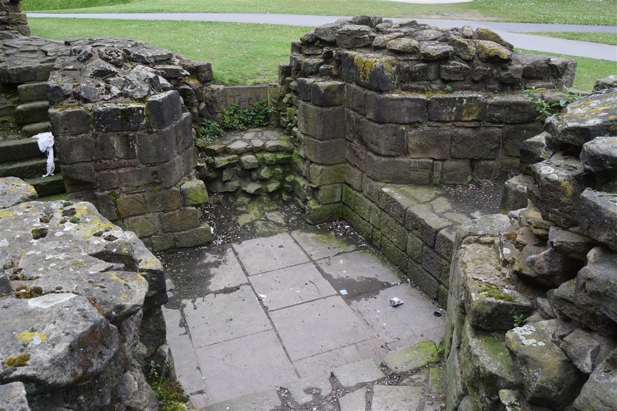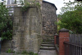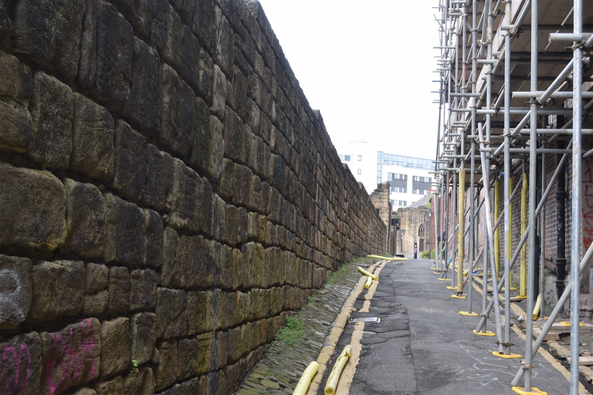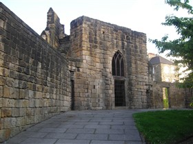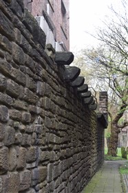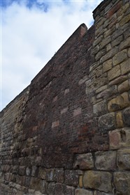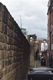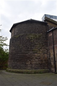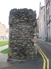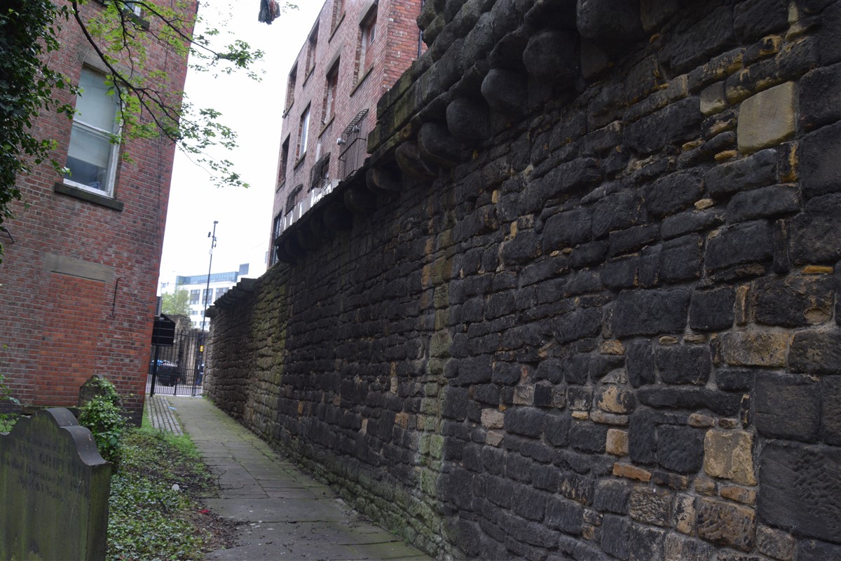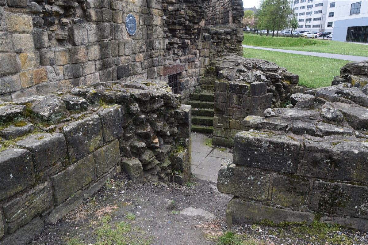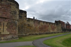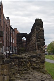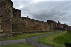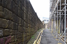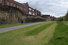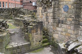 A lesser gateway at Sallyport and two posterns, Blackfriars and Whitefriars, were also built. The wall was strengthened by an external ditch up to 20m wide and 4.5m deep separated from the wall by a berm (a level space between a defensive wall and a ditch in order to defend it). The ditch, known as the King's Dykes was completed in 1316, sometime before completion of the wall. The defences continued to function as the town's main form of defence through to the 19th century. During the 16th and 17th centuries, the towers and some of the gates became the meeting places of a variety of town companies who generally added an upper storey to form a meeting hall. The defences were reinforced during the English Civil War in 1638 when England was threatened by invasion from Scotland. The town was stormed in 1644 by the Scots acting in support of Parliament; the defences were subsequently repaired. In 1745 at the time of the Jacobite uprising the defences were repaired against the rebels which included walling up all of the gateways. The defences were last repaired at the time of the Napoleonic Wars in the early 19th century. Subsequently, when the threat had passed and with the continuing development of Newcastle upon Tyne, their function as a defensive town boundary ceased. The walls were allowed to fall into decay and several sections were levelled in the years following 1823. Newcastle upon Tyne's town defences survive in various states of preservation. Some parts of the curtain wall still stand to full height, and the towers and turrets are also clearly visible. The ditch is also clearly visible for part of the western side as a pronounced earthwork. Other parts of the defences are no longer visible above the present surface of the ground but in these areas, sections of the walls and the ditch survive below ground level as buried features, and sufficient evidence exists for their positions to be accurately identified. Given the role played by the town defences in one of England's major commercial towns and their contribution towards an understanding of medieval and later urban development, all sections of Newcastle's town defences that exhibit significant archaeological remains are considered to be nationally important. The standing remains of the curtain wall between Forth Street and Hanover Street survive well to the height of the parapet walkway. This length of curtain wall is a rare survival, being one of few remaining locations where the curtain wall remains upstanding and highly visible. Taken together with the buried remains of the curtain wall it represents one of the most complete lengths of the circuit. The buried remains of the berm and ditch represent one of few remaining locations where they are thought to survive. The evidence retained by the fabric of the curtain wall for the siege of Newcastle enhances the importance of this section. As a monument which is accessible to the public, this section of Newcastle town defences serves as an important educational and recreational resource which will increase our understanding of how Newcastle's defences developed. The monument is situated on gently sloping ground between Forth Street and Hanover Street and lies parallel to Orchard Street. It includes the upstanding and buried remains of part of the town defences of Newcastle upon Tyne. The section of town defences between Forth Street and Hanover Street represents part of the western re-entrant of the circuit originally constructed between 1311 and 1333 and includes a 122m stretch of curtain wall, a length of berm and infilled and buried ditch. The above ground parts of the curtain wall are a Listed Building Grade I. Further sections of the town defences are the subject of separate schedulings. Newcastle upon Tyne town defences were constructed from the mid-13th century to the middle or late 14th century and enclosed an area of more than 60ha; the riverside lengths of curtain wall were added during the 15th century. The masonry defences were strengthened by a berm and a ditch, except on the south side, where they were bounded by the River Tyne. Gateways were built at the principal points of entry to the town. Internally, a cobbled inter-mural lane followed the line of the defences. The defences were refurbished during the medieval period and were reinforced and repaired several times during the post-medieval period. The curtain wall in this section is largely constructed of coursed, square or rectangular sandstone bonded with mortar with a core of rubble and lime mortar. Where the face of the fabric is best preserved, the medieval masonry is dressed with fine diagonal tooling and some blocks retain mason marks in the form of a simple 'V'-shape. Partial excavation in 1987 showed that the wall has rubble foundations laid within a shallow trench. Above the foundations, the wall has a number of internal offsets and a double chamfer course on its external face. The wall stands to a maximum height of 9.2m including the parapet walkway and parapet; the parapet stands some 1.53m above the level of the walkway and some of the original coping stones are visible. This length of curtain wall was constructed through the precinct of the adjacent Carmelite Friary, in existence until its Dissolution in 1539; excavation revealed that at the time of the wall's construction, this part of the Friary precinct was used as pasture land. Although unconfirmed by analysis of the present wall fabric, the earliest illustrations of this section of the curtain wall show it to contain a tower or two turrets. The excavations identified a thickening and slight offset of the wall footings in two places which it is thought may represent the sites of former wall turrets. Part of a cobbled surface parallel to the inner face of the wall, associated with 14th to late 15th century pottery was uncovered by excavation and interpreted as the remains of the inter-mural lane. A considerable depth of deposits, in some places up t