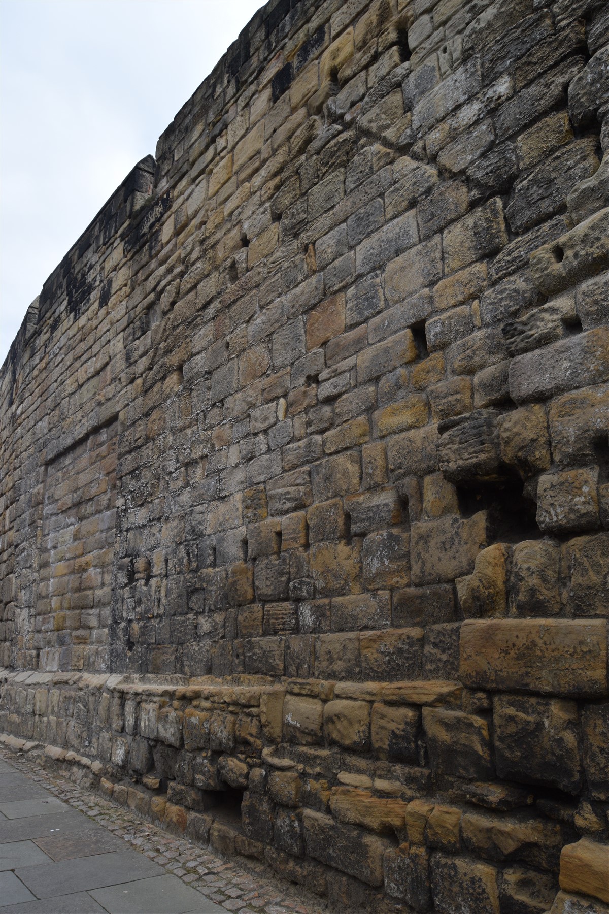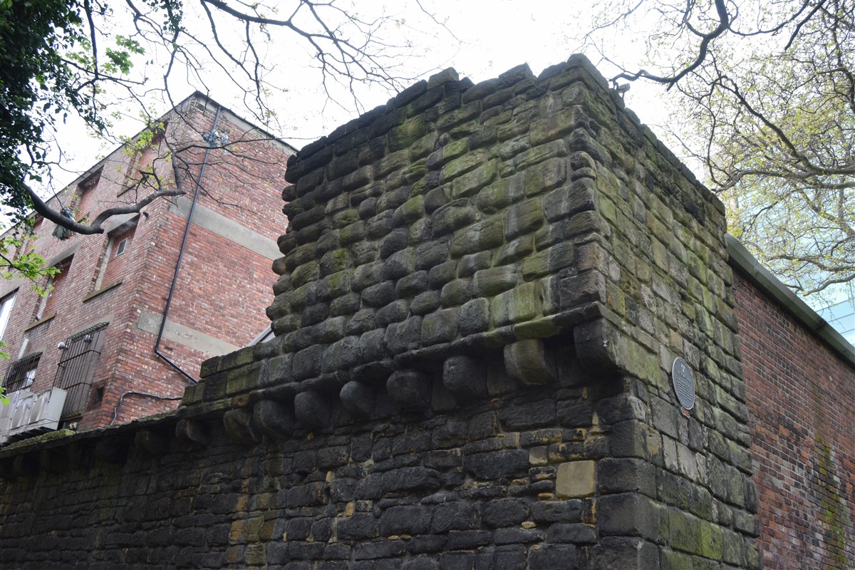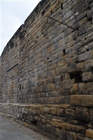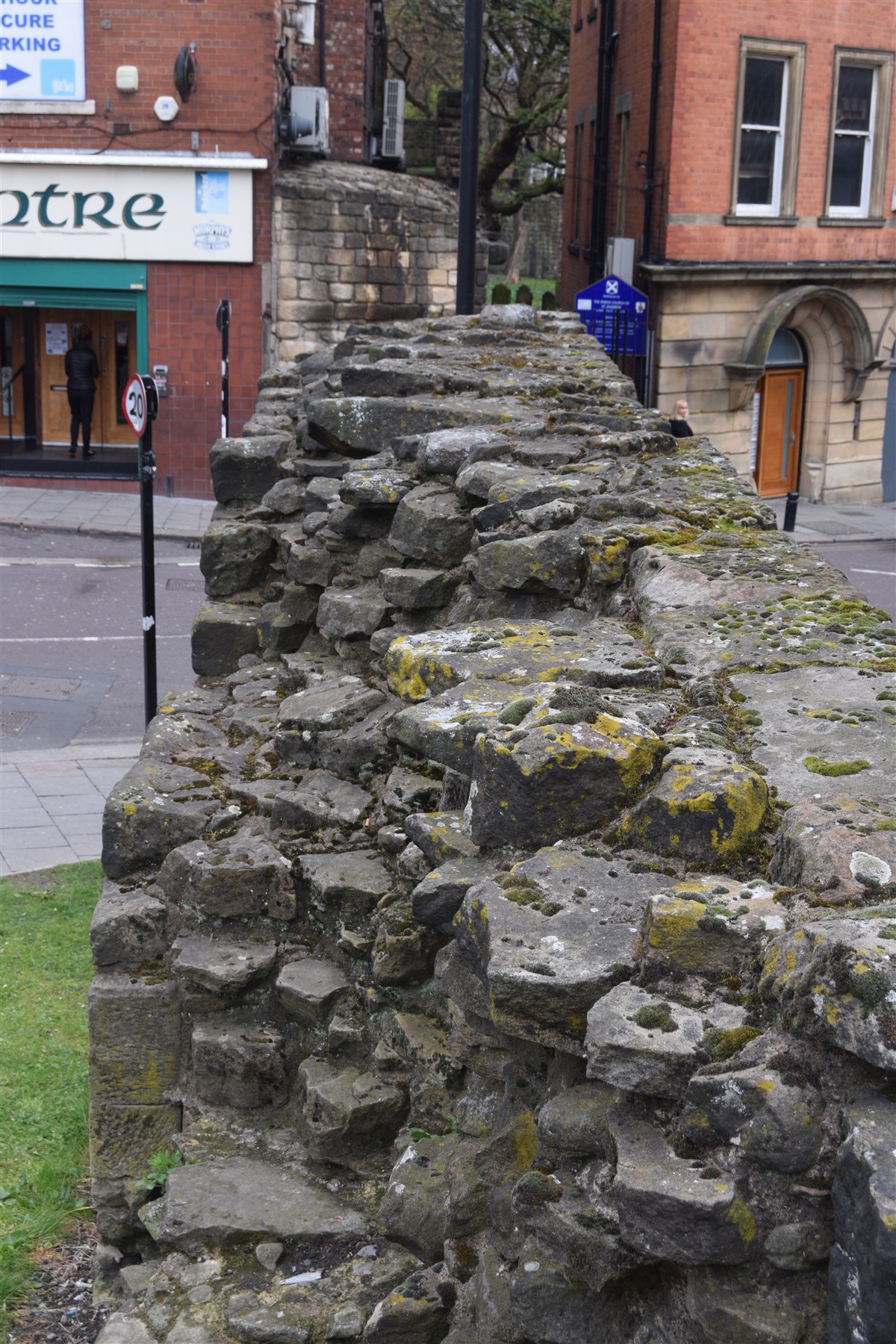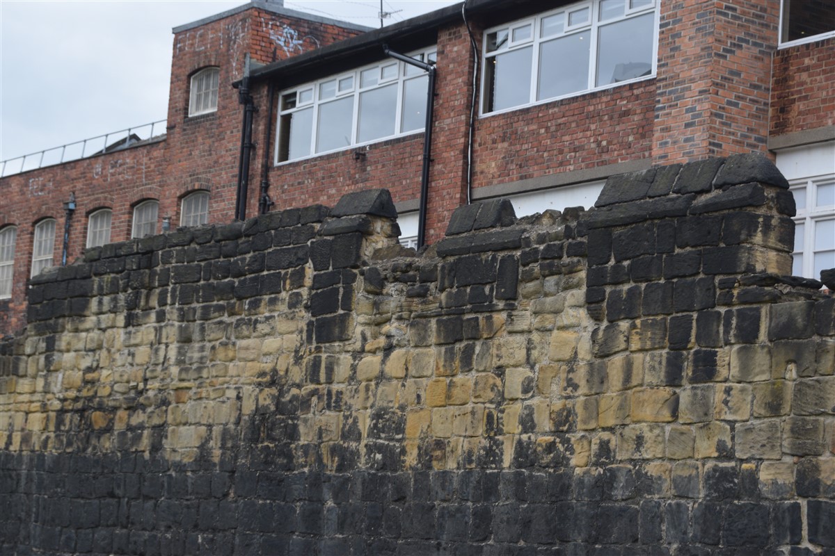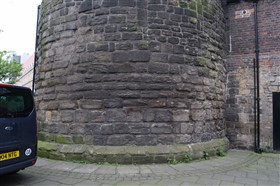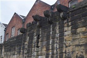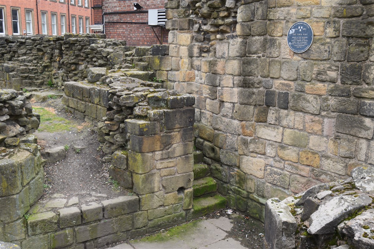 Newcastle was first granted permission to build a town wall in 1265. It enclosed the Roman and medieval core of the town and served to form its protection throughout the medieval and post-medieval periods. Building of the wall began on the north side of the town and continued around the eastern and western sides simultaneously. During its construction, the planned line of the walls was changed; on the west side, where it had been heading towards the castle, the walls turn abruptly south towards the river, and on the east side, they make an eastwards extension in order to enclose the suburb of Pandon, granted to Newcastle upon Tyne in 1298. The curtain wall is of squared and coursed sandstone blocks, although the ashlar varies considerably in character and quality. Where excavation has taken place the wall is seen to have been constructed in a narrow foundation slot, straight onto the ground surface or on a broad raft of sandstone blocks. Above the foundation base there is a double chamfered plinth which in some places is stepped down in order to accommodate a change in the gradient. The wall also displays great variety in thickness and height; the height range from the top of the footings to the wall walk of all the upstanding sections of the curtain wall is from 4.4m to 6.6m. The thickness of the wall immediately above the double chamfered plinth ranges from 1.98m to 3.3m. The curtain wall was surmounted by a parapet walkway, and where it survives it varies in height from 1.53m to 1.68m above the top of the wall walk. The wall contained 17 interval towers which normally projected forwards from the line of the wall and about 40 intermediate turrets, normally flush with the outer face of the curtain wall but overhanging the internal face on a series of corbels. Gateways were built at Newgate, Westgate, Closegate, Sandgate, Pandongate and Pilgrimgate, each defended by a pair of gatehouses