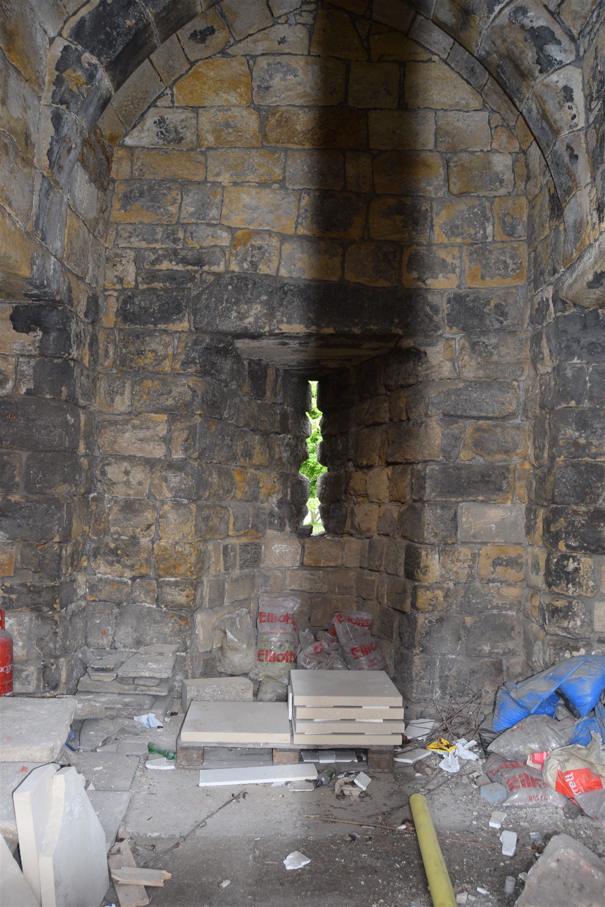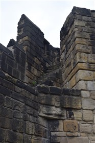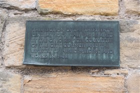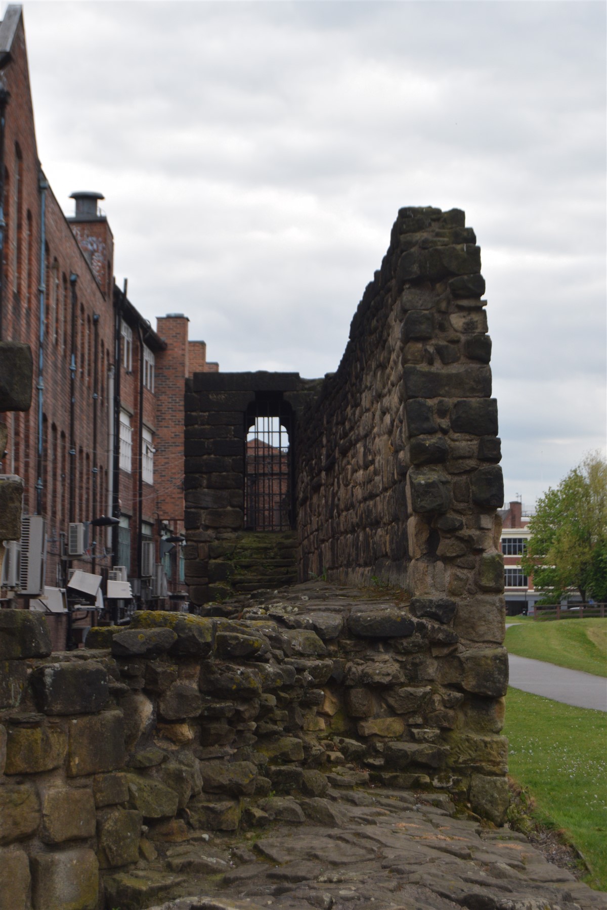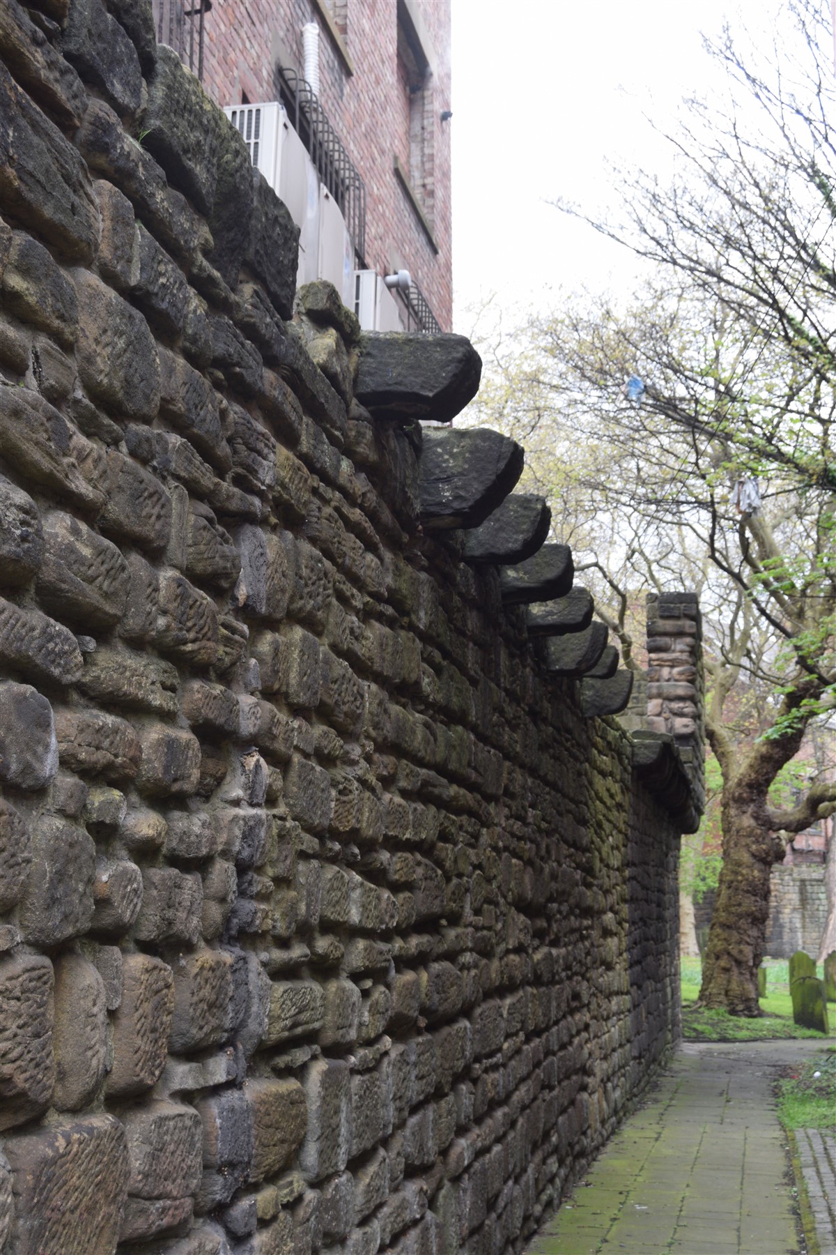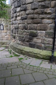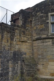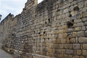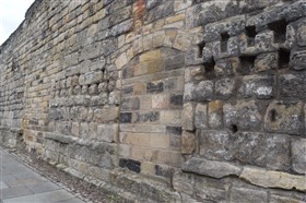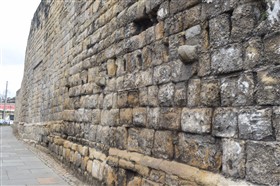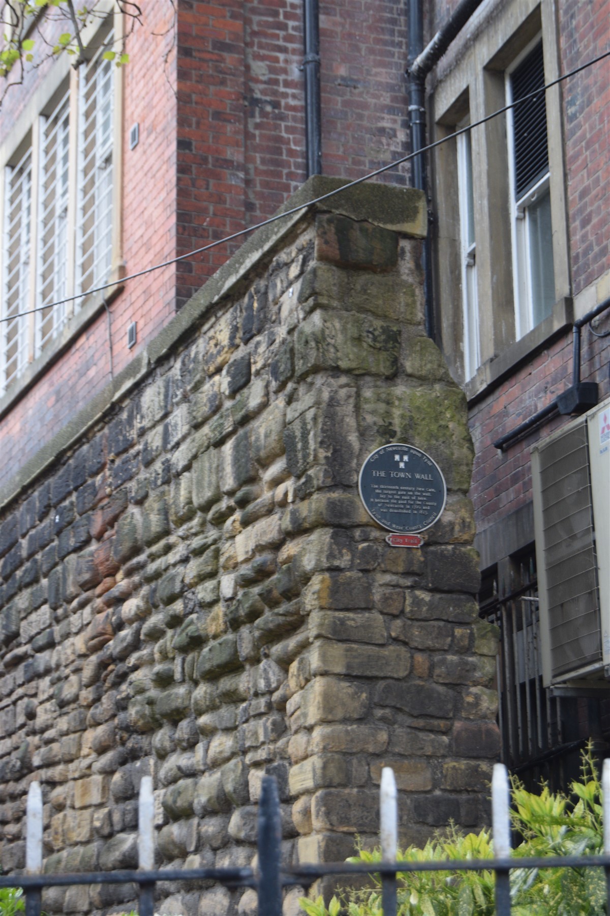 Newcastle was first granted permission to build a town wall in 1265. It enclosed the Roman and medieval core of the town and served to form its protection throughout the medieval and post-medieval periods. Building of the wall began on the north side of the town and continued around the eastern and western sides simultaneously. During its construction, the planned line of the walls was changed; on the west side, where it had been heading towards the castle, the walls turn abruptly south towards the river, and on the east side, they make an eastwards extension in order to enclose the suburb of Pandon, granted to Newcastle upon Tyne in 1298. The curtain wall is of squared and coursed sandstone blocks, although the ashlar varies considerably in character and quality. Where excavation has taken place the wall is seen to have been constructed in a narrow foundation slot, straight onto the ground surface or on a broad raft of sandstone blocks. Above the foundation base there is a double chamfered plinth which in some places is stepped down in order to accommodate a change in the gradient. The wall also displays great variety in thickness and height; the height range from the top of the footings to the wall walk of all the upstanding sections of the curtain wall is from 4.4m to 6.6m. The thickness of the wall immediately above the double chamfered plinth ranges from 1.98m to 3.3m. The curtain wall was surmounted by a parapet walkway, and where it survives it varies in height from 1.53m to 1.68m above the top of the wall walk. The wall contained 17 interval towers which normally projected forwards from the line of the wall and about 40 intermediate turrets, normally flush with the outer face of the curtain wall but overhanging the internal face on a series of corbels. Gateways were built at Newgate, Westgate, Closegate, Sandgate, Pandongate and Pilgrimgate, each defended by a pair of gatehouses
