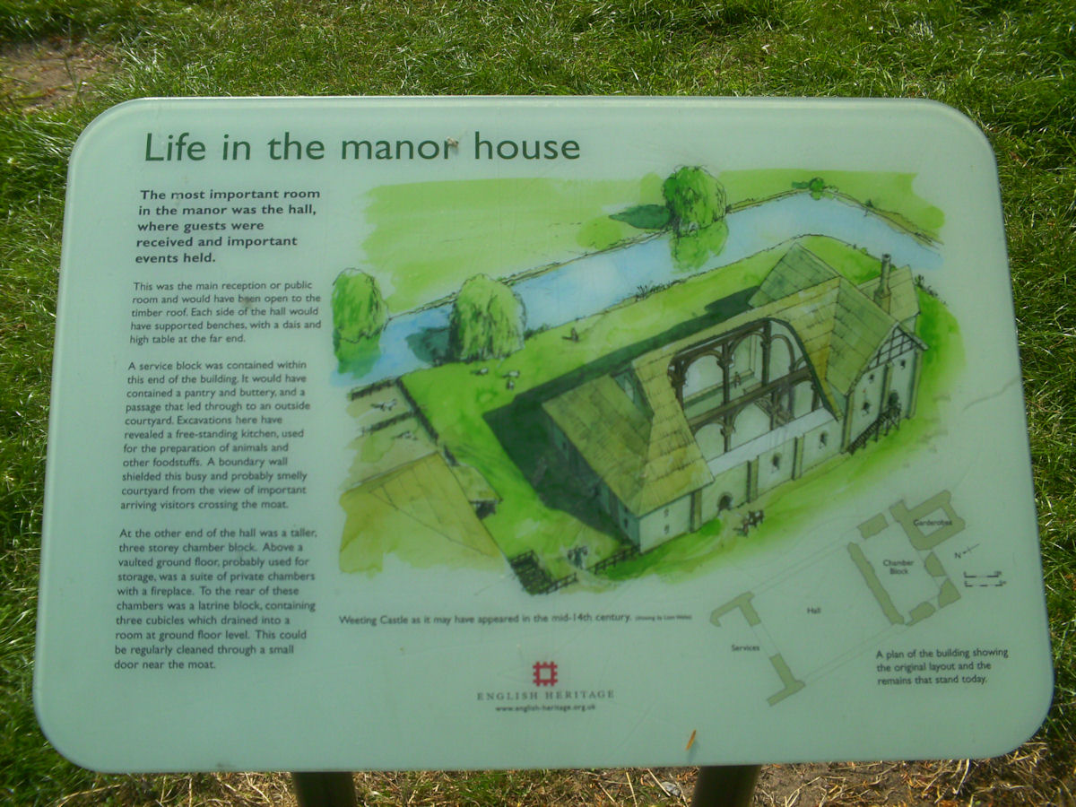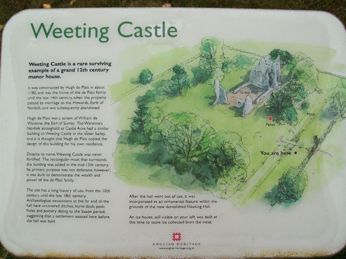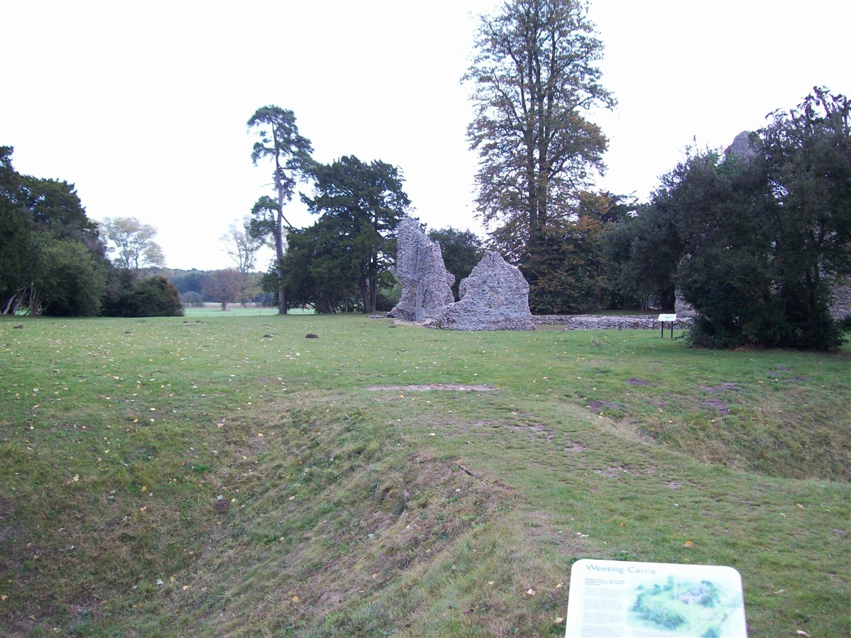The remains of C12 hall house known as Weeting Castle, together with buried remains relating to earlier occupation of the site during the C10 or C11 and a post medieval ice house. The moated site is sub-rectangular in plan and has maximum overall dimensions of circa 105m north-south by circa 79m east-west. The moat, which is now dry, remains open to a depth of 2m and measures up to 10m in width. It surrounds a central island raised 0.4m above the external ground level and with internal dimensions of circa 85m north-south by circa 60m east-west. The remains of the medieval hall house stand in the middle of the southern half of the island. Built circa 1180, the ruined walls, which are constructed of mortared flint rubble with stone dressings, define a rectangular building 30m by 14m, containing a central aisled hall and a substantial three storey tower to the south. Evidence for occupation of the site prior to the construction of the hall house was found during limited excavations below and around the tower and included the buried remains of three successive ditches, dated by finds of pottery of Saxo-Norman type and a coin of the later C10. One of the ditches contained a quantity of burnt daub, possibly from a timber building or buildings. The ice house in the north west corner of the moated site is probably 18th century in date and is presumed to relate to Weeting Hall, which lay circa 225m to the west. It is constructed of brick and covered by an earthen mound circa 2.4m in height and circa 16m in diameter. The entrance is on the north side, facing the moat and comprises an outer doorway, set in a brick retaining wall with butresses to either side. (PastScape)