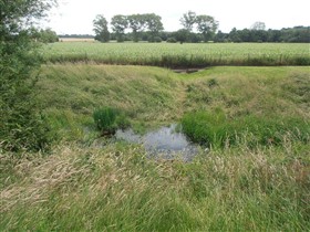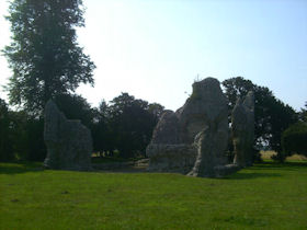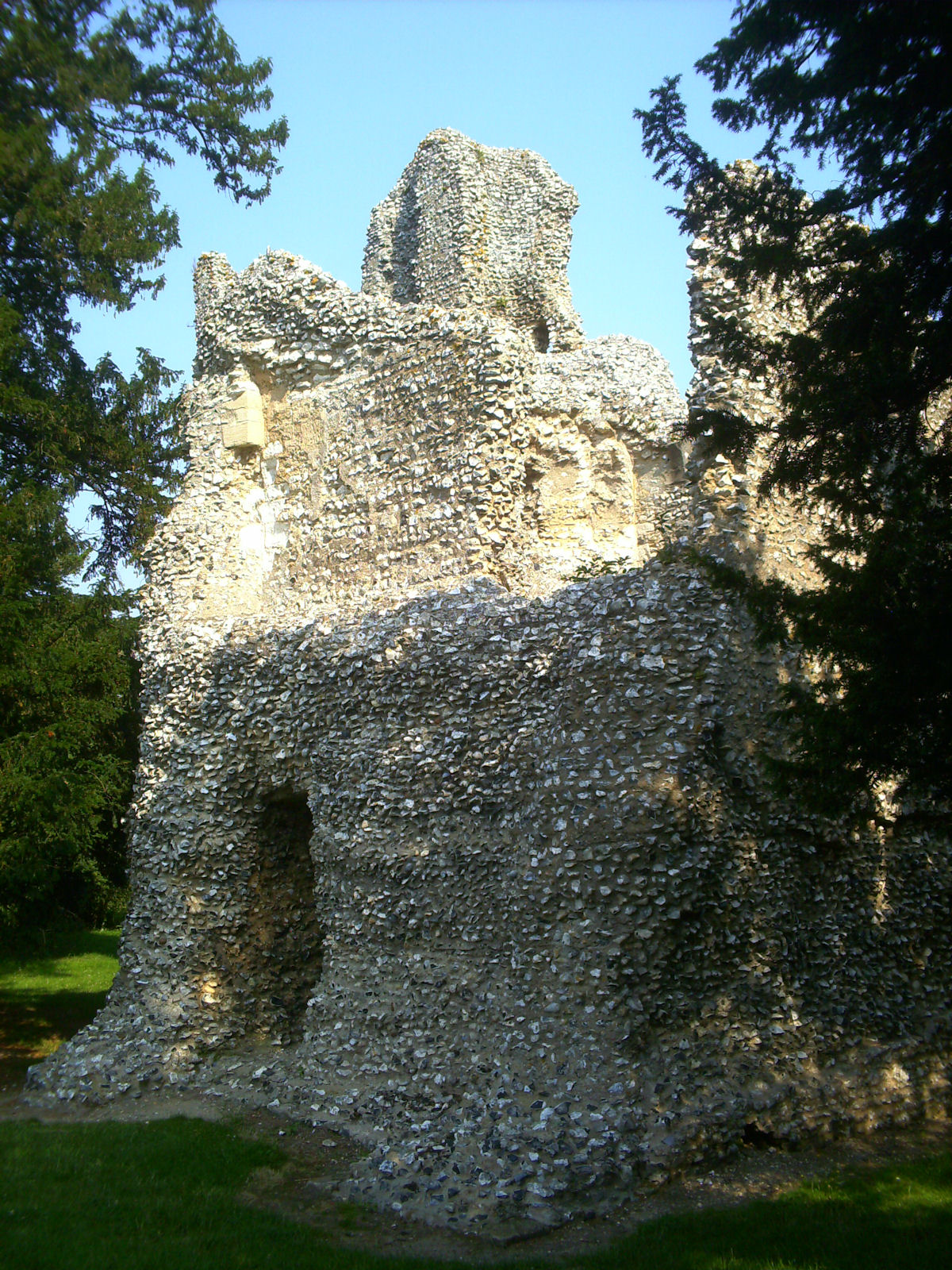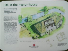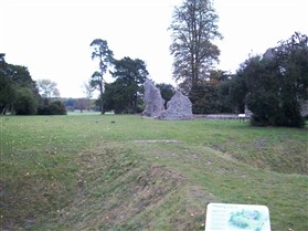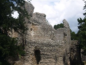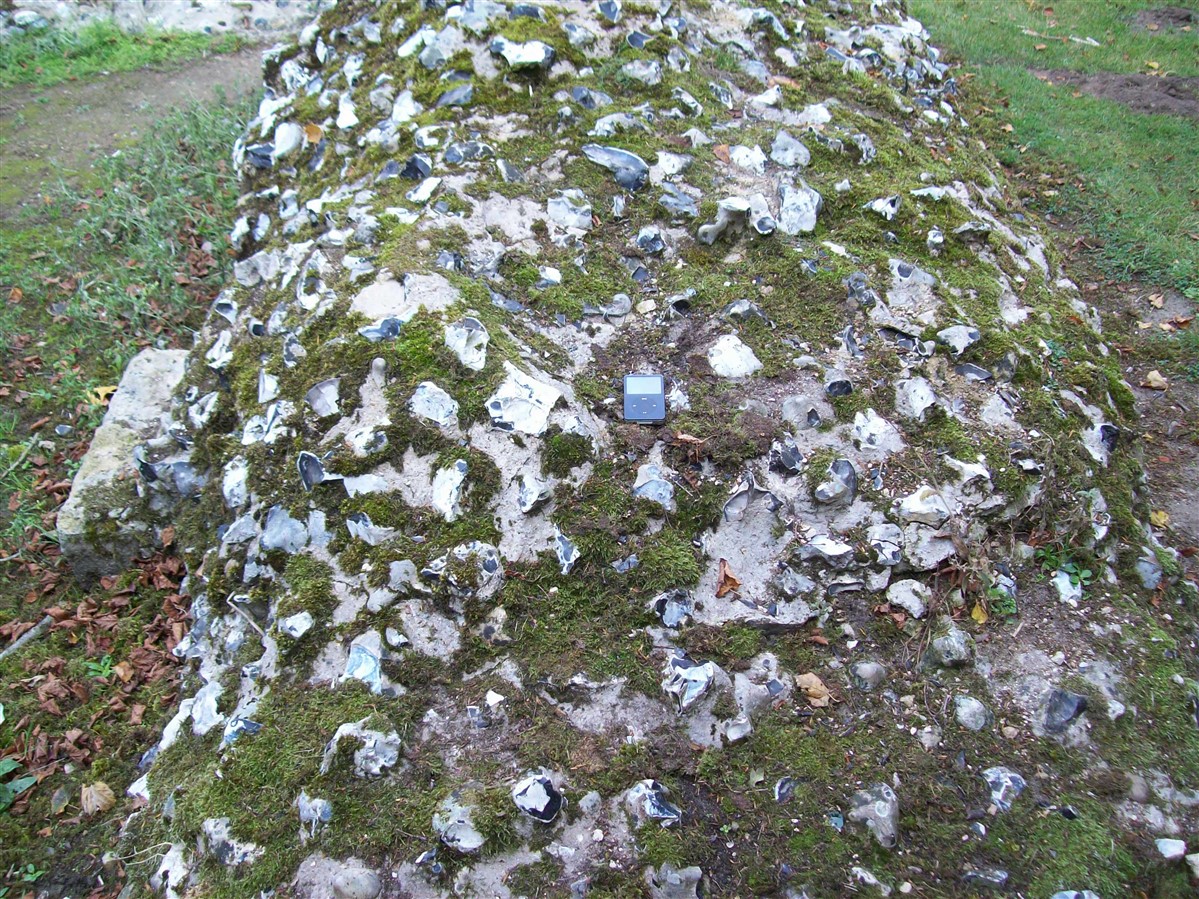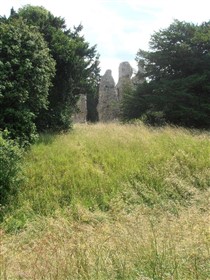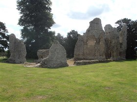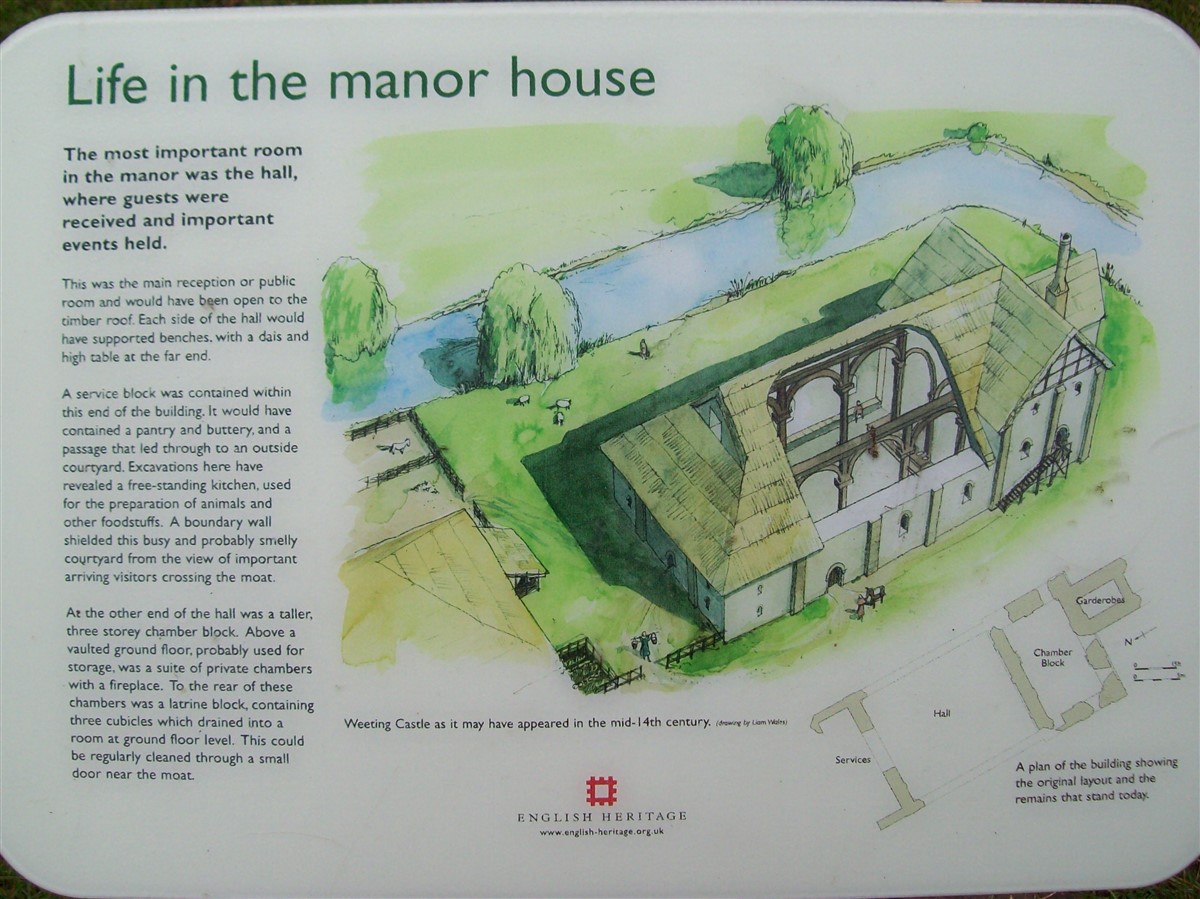 The remains of C12 hall house known as Weeting Castle, together with buried remains relating to earlier occupation of the site during the C10 or C11 and a post medieval ice house. The moated site is sub-rectangular in plan and has maximum overall dimensions of circa 105m north-south by circa 79m east-west. The moat, which is now dry, remains open to a depth of 2m and measures up to 10m in width. It surrounds a central island raised 0.4m above the external ground level and with internal dimensions of circa 85m north-south by circa 60m east-west. The remains of the medieval hall house stand in the middle of the southern half of the island. Built circa 1180, the ruined walls, which are constructed of mortared flint rubble with stone dressings, define a rectangular building 30m by 14m, containing a central aisled hall and a substantial three storey tower to the south. Evidence for occupation of the site prior to the construction of the hall house was found during limited excavations below and around the tower and included the buried remains of three successive ditches, dated by finds of pottery of Saxo-Norman type and a coin of the later C10. One of the ditches contained a quantity of burnt daub, possibly from a timber building or buildings. The ice house in the north west corner of the moated site is probably 18th century in date and is presumed to relate to Weeting Hall, which lay circa 225m to the west. It is constructed of brick and covered by an earthen mound circa 2.4m in height and circa 16m in diameter. The entrance is on the north side, facing the moat and comprises an outer doorway, set in a brick retaining wall with butresses to either side. (PastScape)