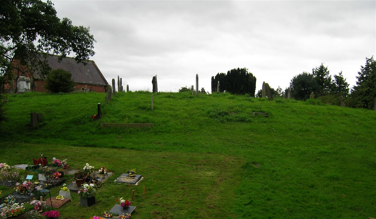 The castle bailey was located to the northern, town side, of the motte. The bailey defences were heavily modified during the construction of the bishops' palace in the late 12th century and consequently the size and form of the original castle bailey is currently unknown. The surviving modified bailey survives as a ditch or moat up to 12m wide and 1m deep which encloses a raised, irregular shaped area measuring a maximum of 140m north west to south east by 90m north east to south west. The moat encloses all but the northern side of the interior. It originally extended across the northern side but was infilled in the 1940s when the current cemetery, located to the north of the monument, was established. There was an entrance through the moat, 15m wide, on the north eastern side, which still survives as the main access into the centre of the old cemetery. There is a reference to there having been a stone built gatehouse but it is unclear whether this was located inside or outside the moat. Outside the moat, on the western side, there is a flat-topped bank 8m wide with a narrow ditch on each side, which extends from the motte as far as the northern angle of the moat. It is thought to be the remains of a formal promenade dating to the time of the bishops' palace. There is no evidence that there was a similar bank on the other sides of the moat. Immediately inside the ditch the ground rises to be approximately 2m above the ground level on the outside of the ditch. It is thought that this was originally an internal bank for the defences of the bishops' palace, however the extent of this has been obscured by later modifications mostly dating to the 19th century landscaping associated with the cemetery.