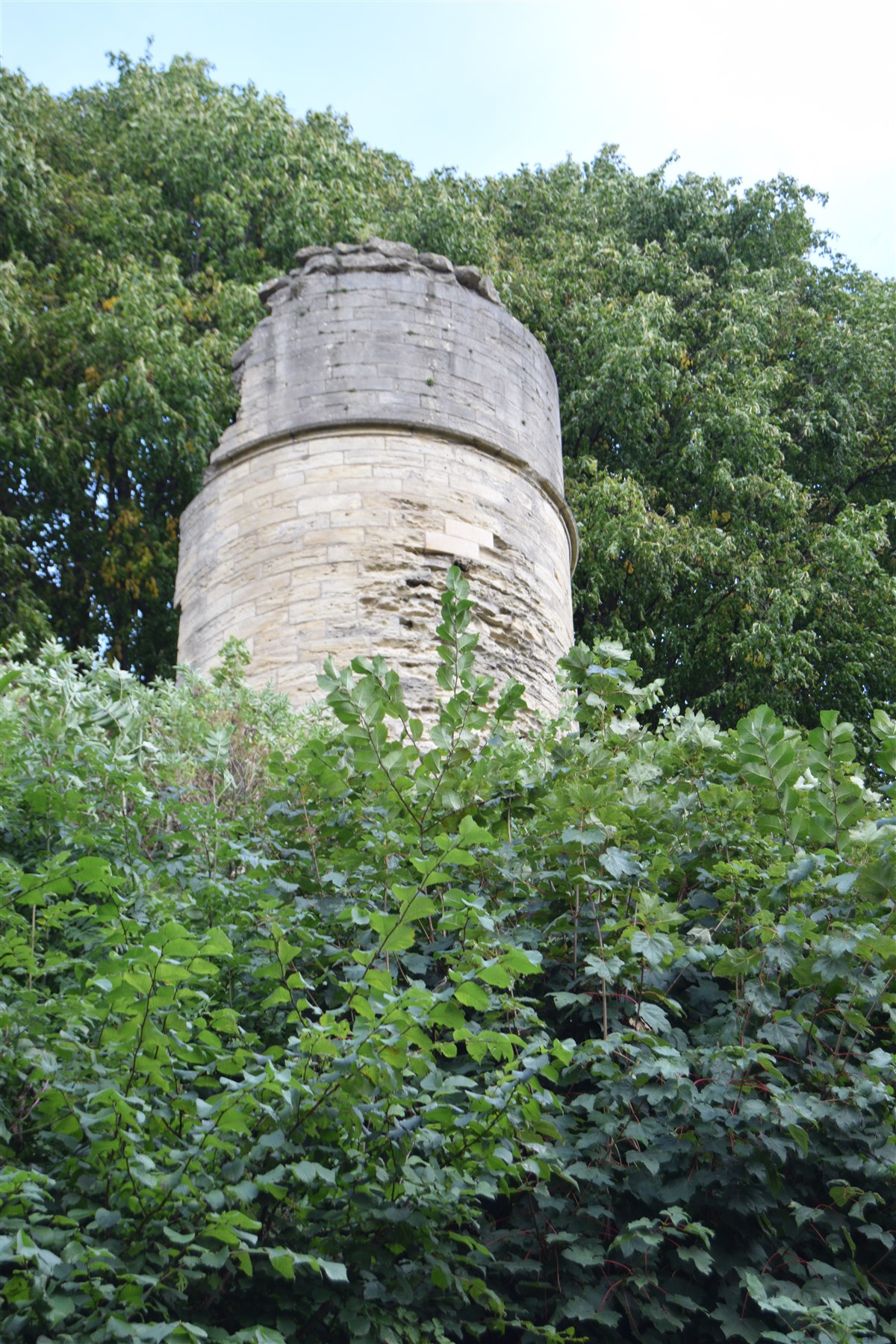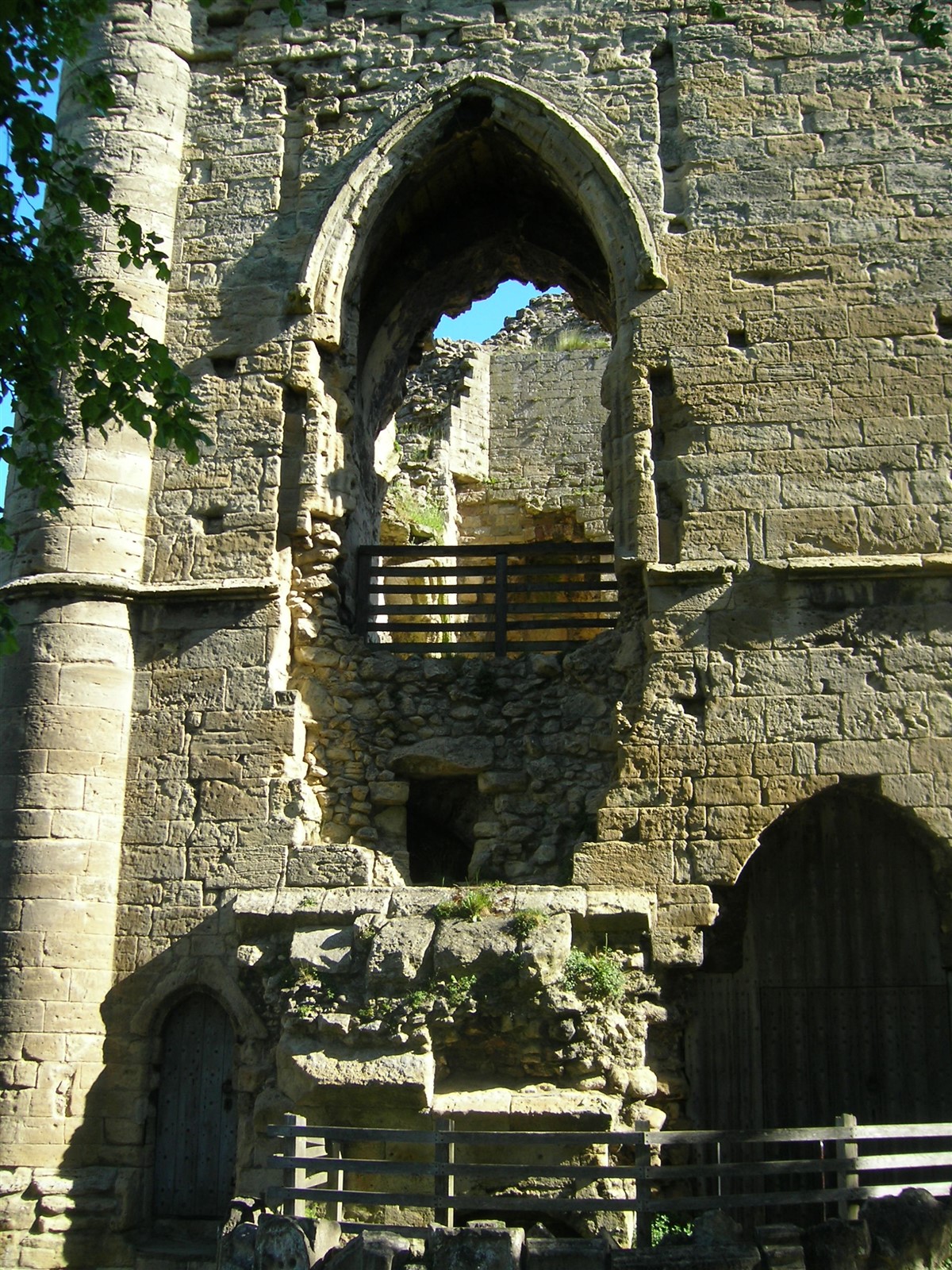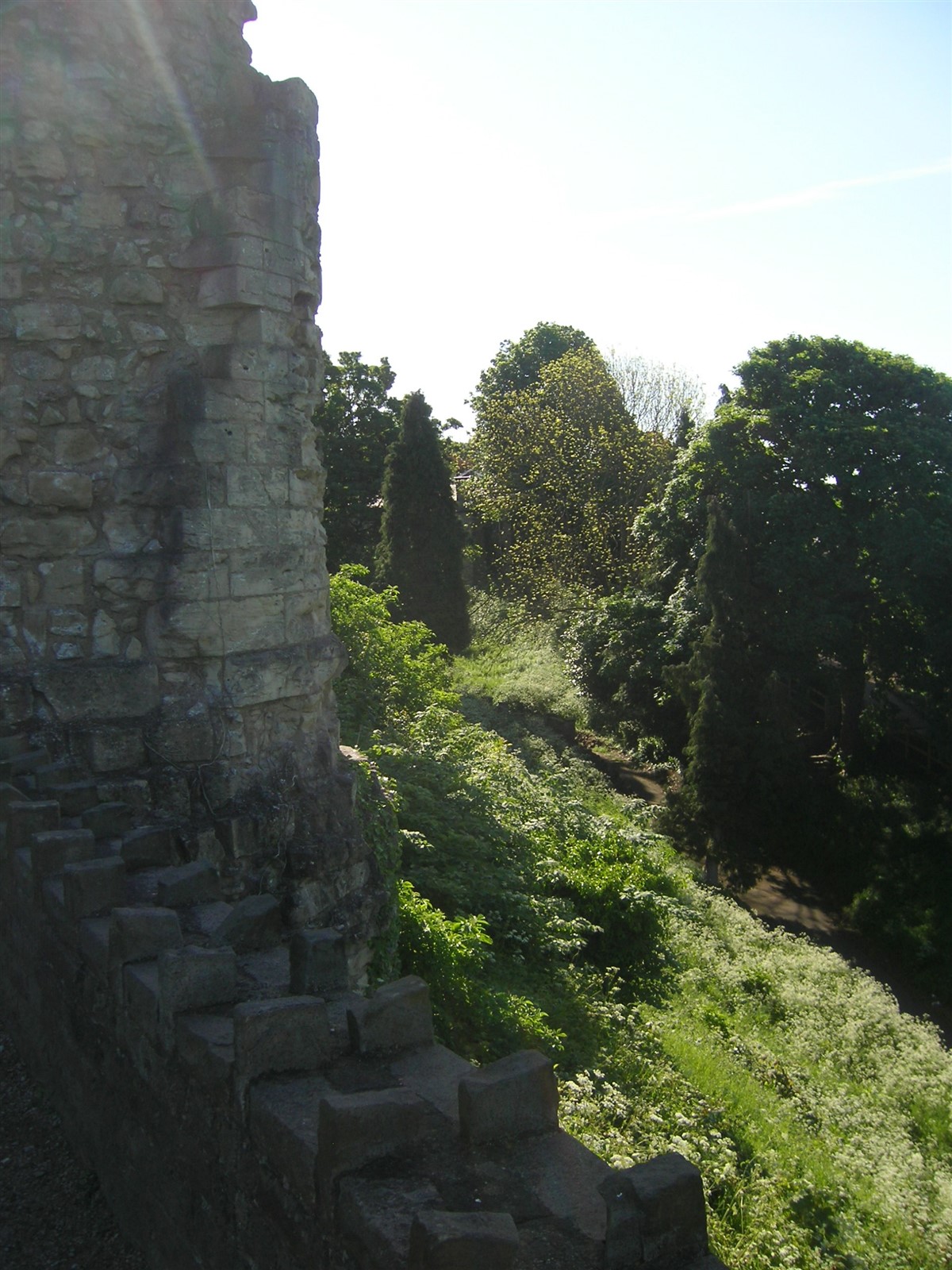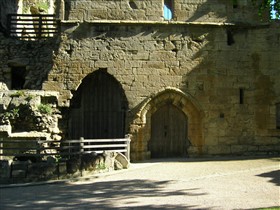 Hidden within the outer ward are two sallyports, underground tunnels which were used for secret entry and exit from the castle. These tunnels are nearly 2.5 metres (8 feet) high and 2 metres (6 feet) wide in places, and are constructed of rough mortared rubble immediately below the ground, and then are hewn through the solid rock. They are easily large enough for a small party of armed men to have secretly left the castle and harass besieging troops. These sallyports slope steeply down to the level of the bottom of the moat, where the soldiers would have emerged secretly under cover of darkness. The exit from the northern sallyport has been completely blocked. by the infill of the moat. The eastern sallyport is now open and accessible by guided tours during the summer season. (Kershaw)