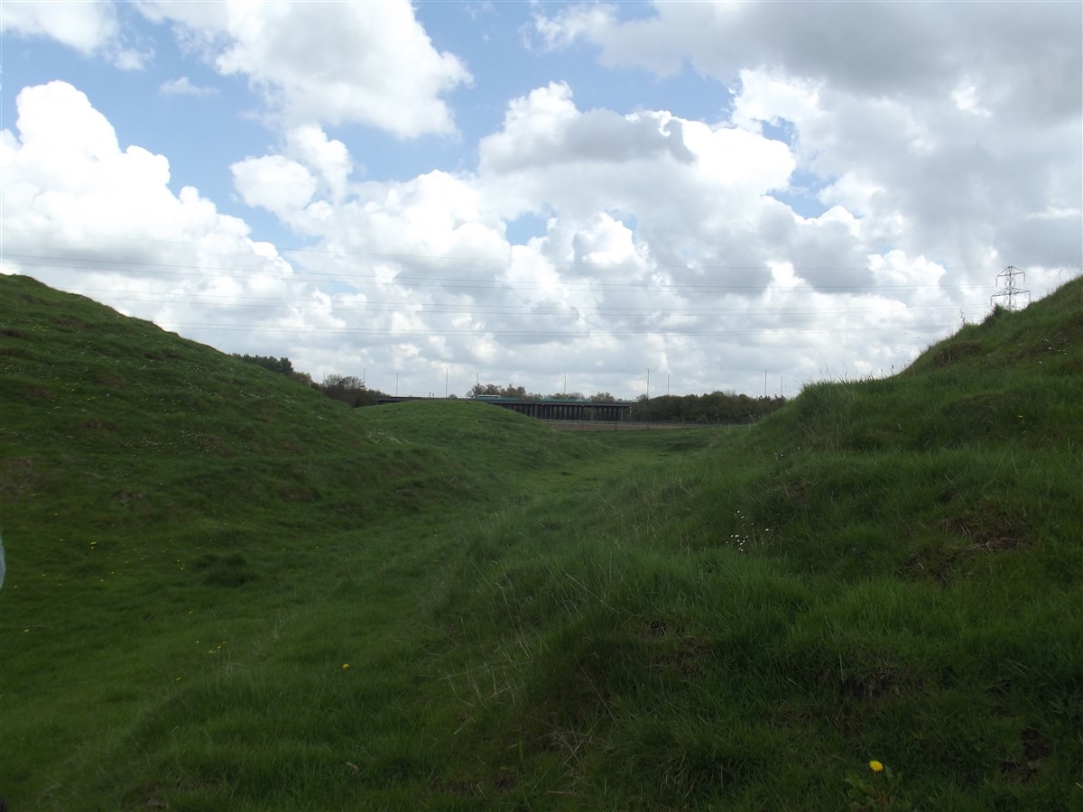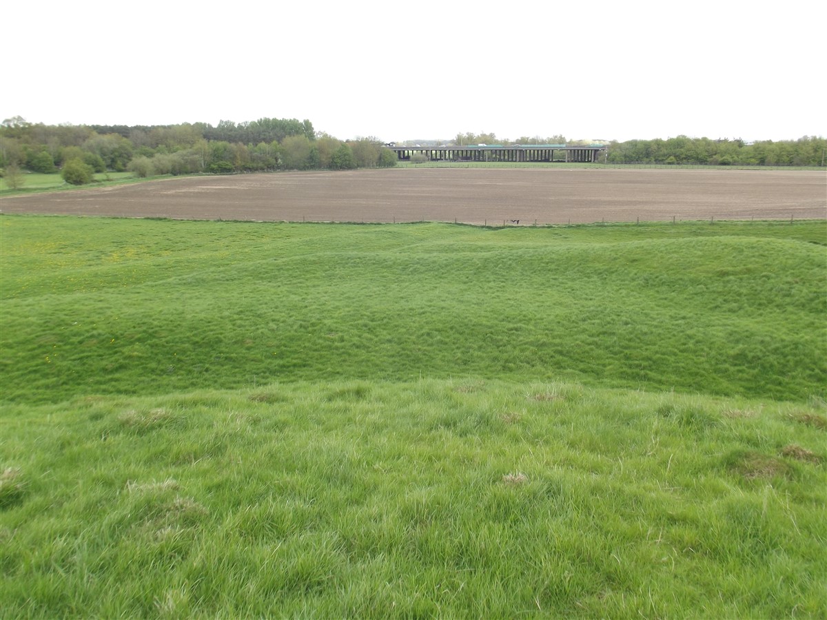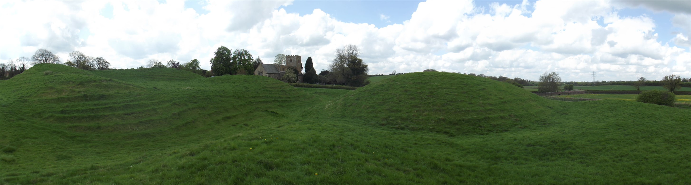 To the N.E. of the later bailey and immediately S.E. of the fishpond is a small circular mound only 0.25 m. high. It may overlie ridge-and-furrow, but this is not certain. Its purpose is unknown. To the E. and S. of the site is a series of ditched and embanked enclosures, many with ridge-and-furrow within them, that extend S. and form part of the settlement remains (3). A number of hollowed trackways approach and skirt the site but their relationship to it is not clear (air photographs in NMR; RAF VAP 106G/UK/636, 4160–1; CUAP, AGU82, AKP62, AWQ5; Arch. J., 35 (1878), 117–8; 90 (1933), 380; plans and sections, 1842, in Dryden Collection, Northampton Central Library).