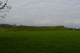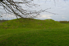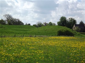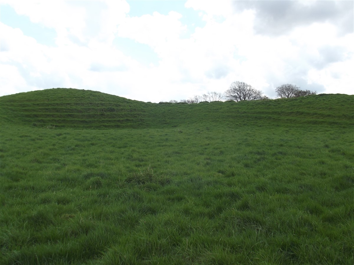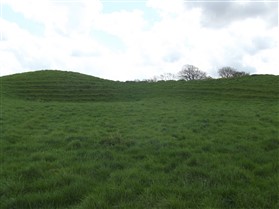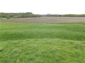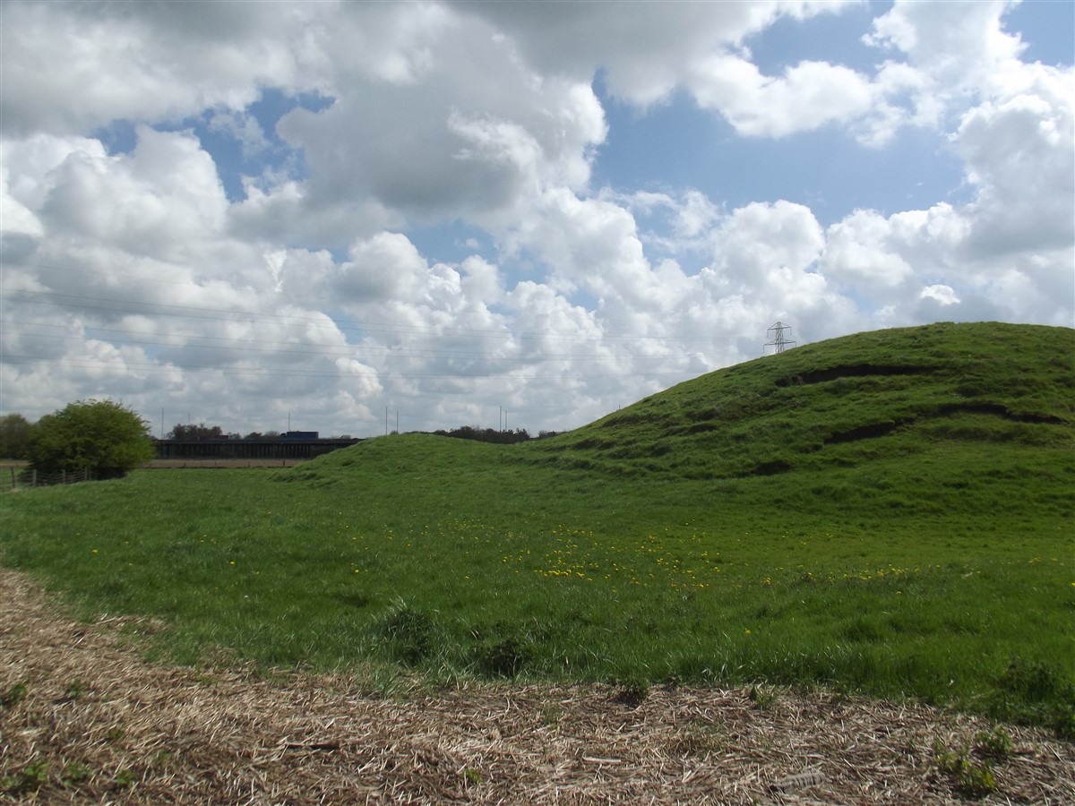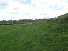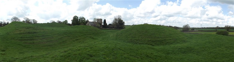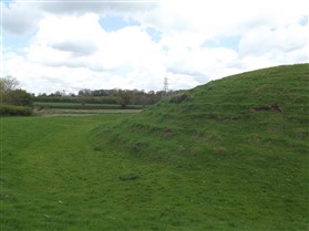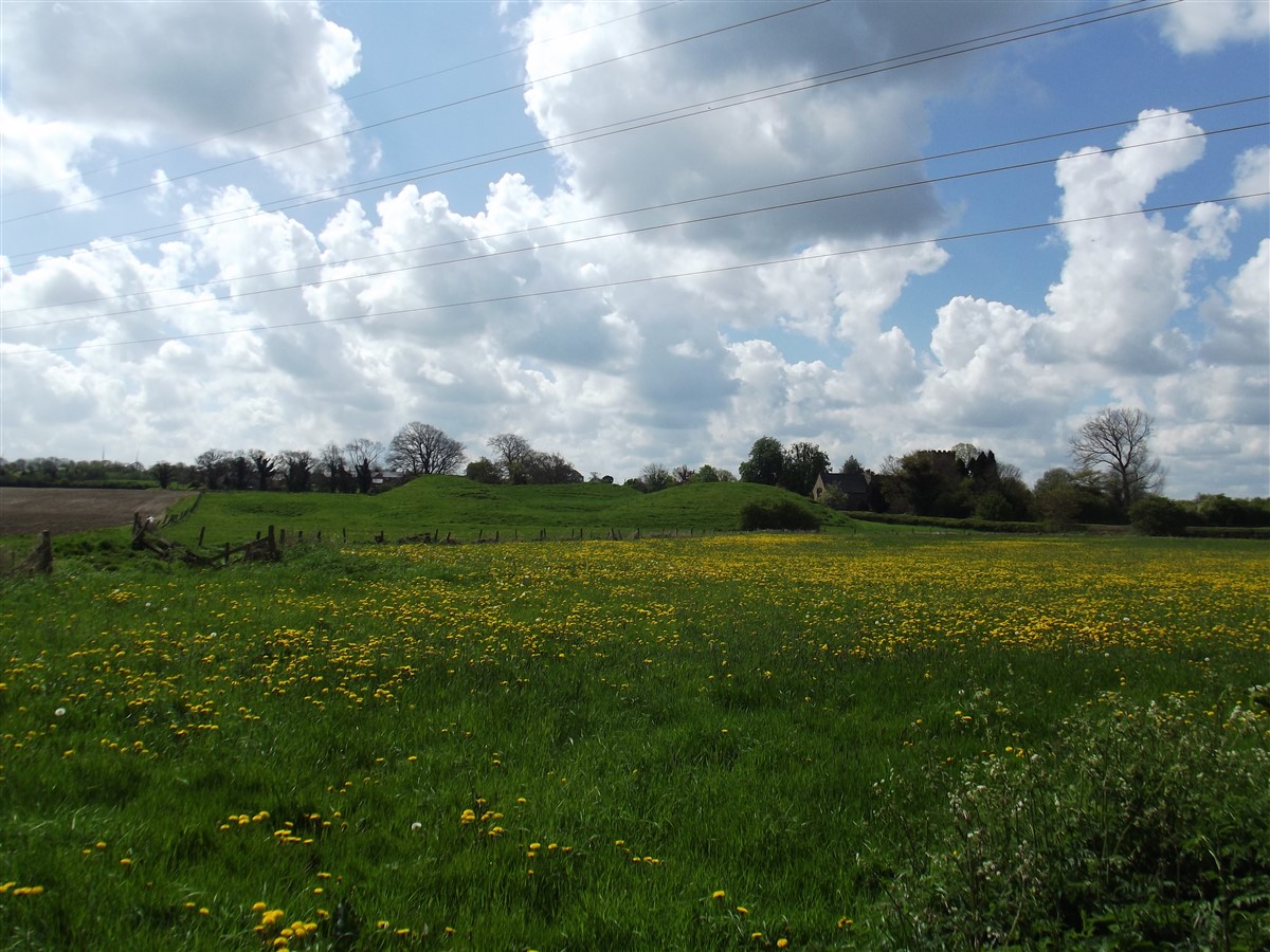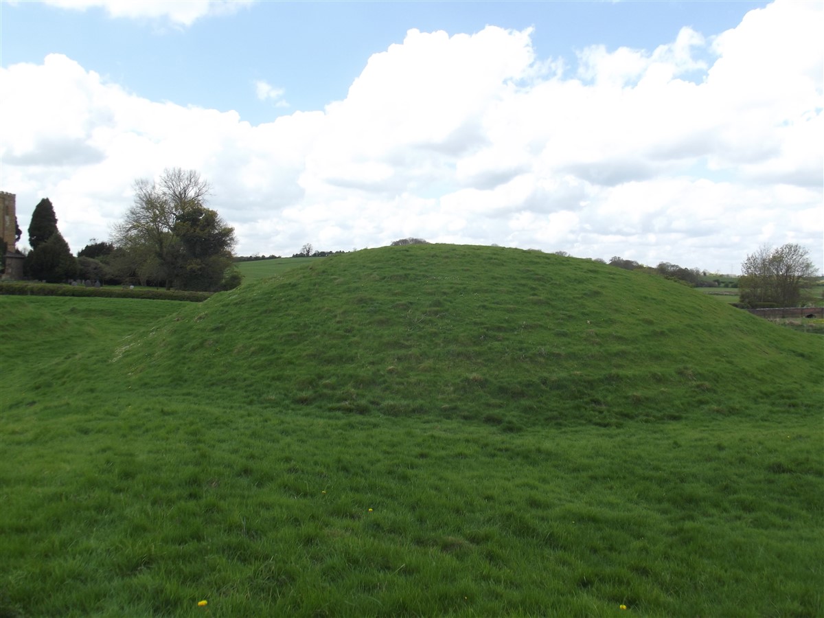 Lilbourne motte and bailey castle lies just to the north of Lilbourne village, close to All Saints Church. The castle is located just south of the River Avon beside a crossing point of the river. The earthworks of the motte and bailey castle cover an area measuring approximately 140m x 100m. The motte is a round conical mound about 10m high, which is surrounded by a ditch 2m deep on the north, south and east sides. To the south east of the motte lies a substantial peripheral bailey, about 35m square. The bailey has banks up to 3m high around its inner edge on all but the north side, and is surrounded by a ditch up to 5m wide. A further bank, about 1m high, lies on the outer edge of the south side of the bailey. To the north east of the motte mound is sited the remains of a second smaller peripheral bailey area, oval in shape. This bailey is surrounded by a ditch and has a slight inner bank on the south east side. Lying outside the motte and bailey to the north east is a small rectangular fishpond which was associated with the castle and was connected by a water channel to the ditches of the bailey. The castle is located 800m to the north east of a second motte and bailey at Lilbourne Gorse. (Scheduling Report)