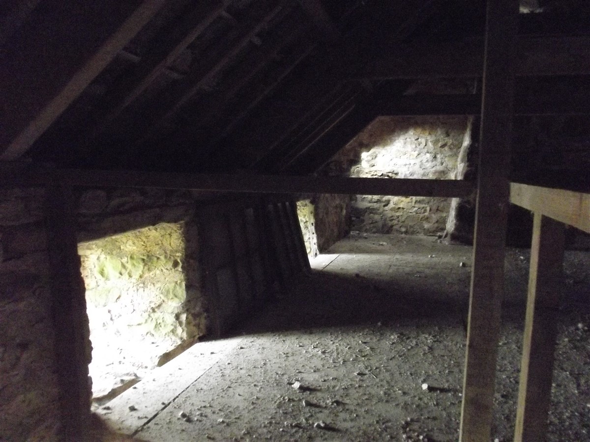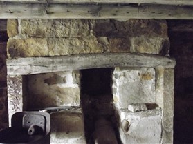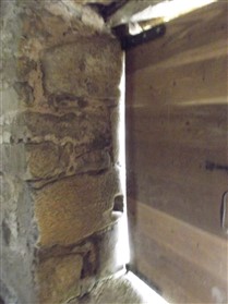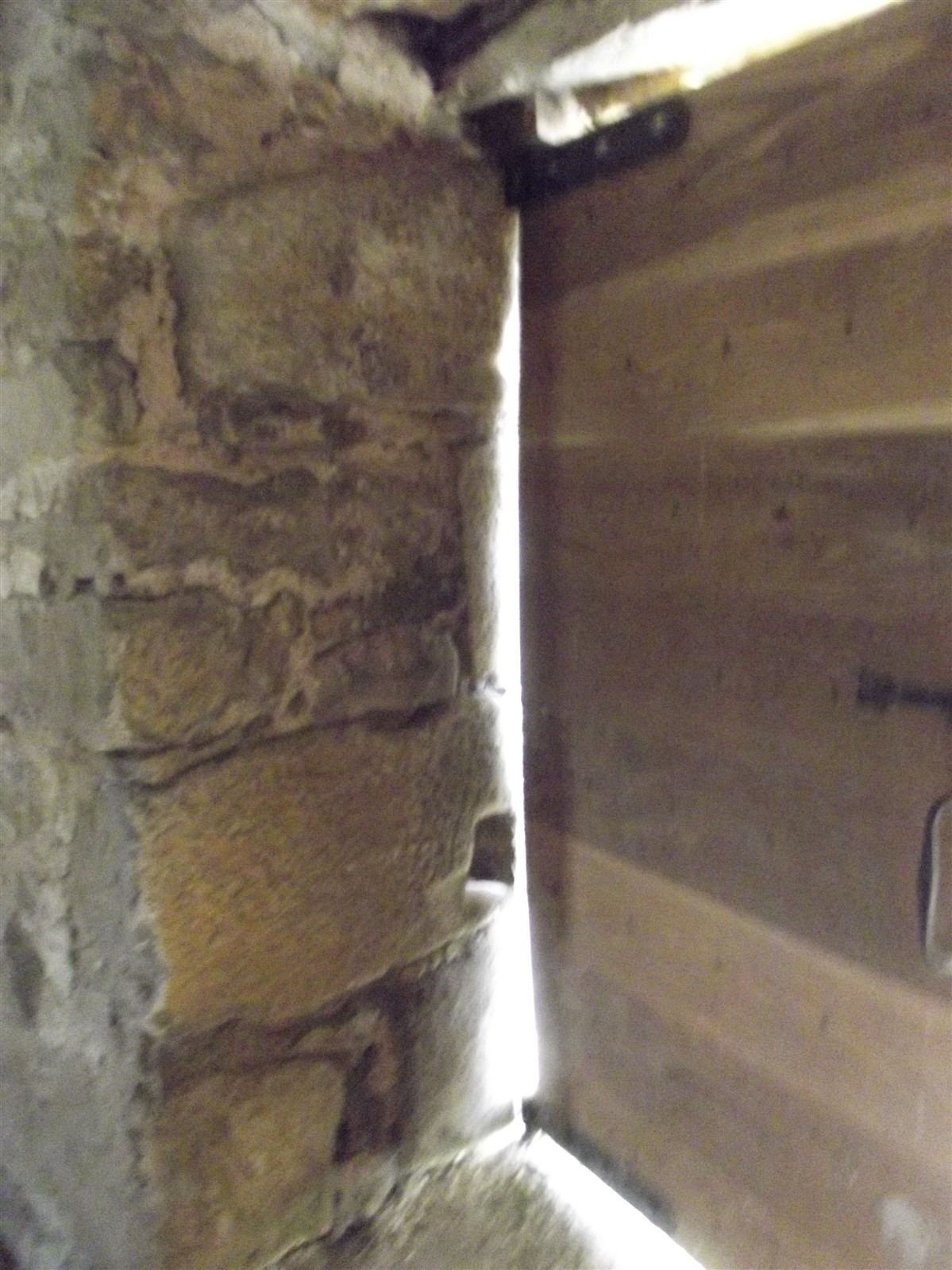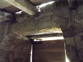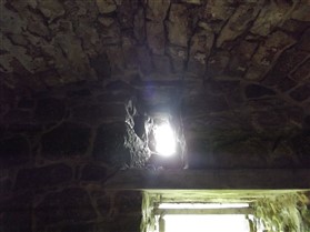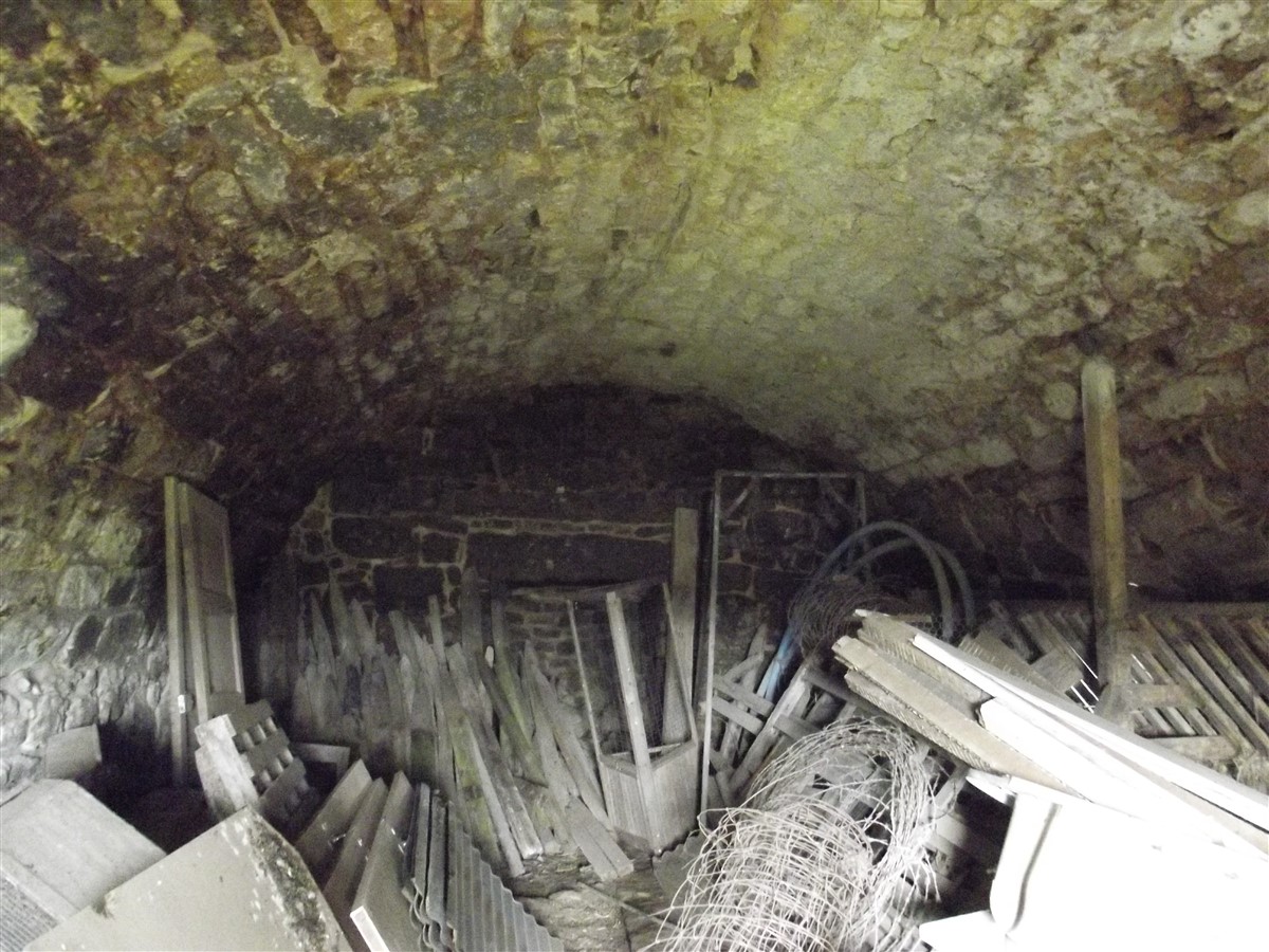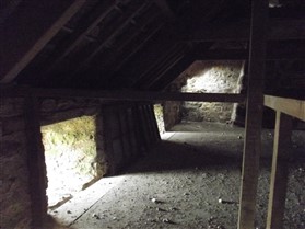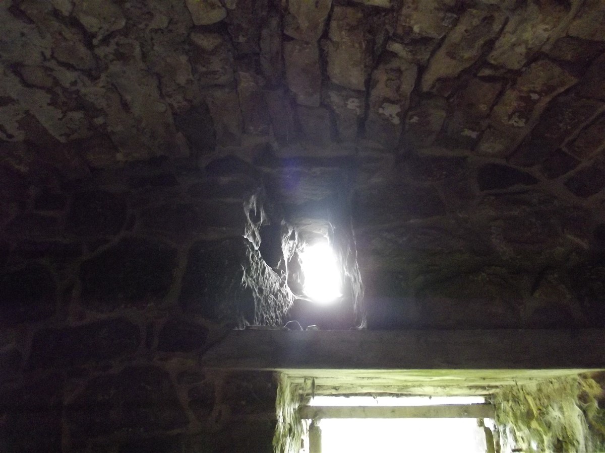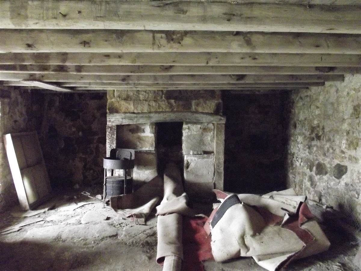 Interior has barrel-vaulted ground floor with narrow ladder-hole to 1st floor. Fireplace on 1st floor has timber lintel and square recess to right. Rustic wood stair to attic. (Listed Building Report)