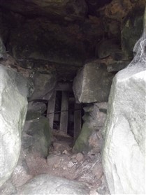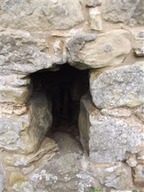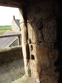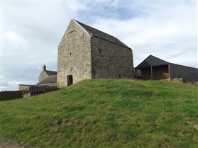 The first floor was also reached by an external stone stair leading up to a platform surrounded by a parapet wall on the south wall of the bastle. The upper doorway is placed at the eastern end of the front wall; it has a chamfered stone surround and a drawbar tunnel. Two windows, one each side of the doorway, are 19th century additions but original windows are visible in the east wall and at the east end of the north wall. Inside the bastle at first floor level there are wall cupboards against each gable and a fireplace on the western side. A stone stair, in the south east corner, gives access to an attic storey. The attic has two square windows in the south wall and on the east gable there are five pigeon holes. The monument is a Grade II-star Listed Building. The bastle partly stands on a round cairn in which a Bronze Age stone coffin or cist was discovered in 1972. The cist is still in its original position 2.5m north of the north wall of the bastle. The cairn is 9m in diameter and protrudes from underneath the bastle at the north east and north west sides. (Scheduling Report)