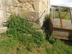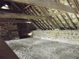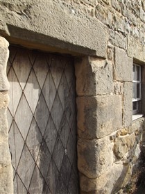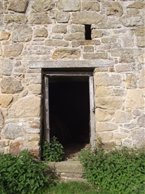 Bastles show some variations, but on the whole they are remarkably uniform. The typical bastle is rectangular on plan with external dimensions c.35 x 25 feet. It is of two full storeys and has quite steeply pitched gables. The walls are built of stone in large blocks of irregular shape, the gaps between the blocks being packed with small stone chippings set in a weak mortar with very little lime, about 4 feet thick on the ground floor, thinning to c.3-1/2 feet at first floor level. The ground floor has a single narrow doorway set in the middle of one of the gable walls. There are no windows on this floor, only ventilation slits. The upper floor is entered by a doorway set towards one end of the long wall approached by an external stone stair which, not being bonded to the main wall is a replacement, probably of a movable ladder. No original bastle roof survives, all present roofs have slate covering, but it is clear that some, at least, were originally covered with thatch, presumably of heather.