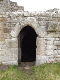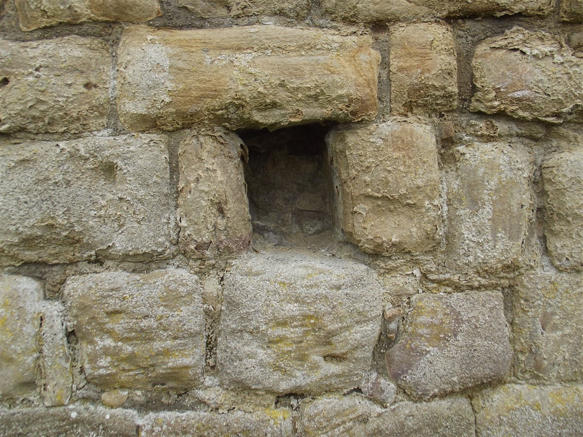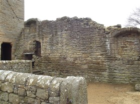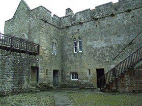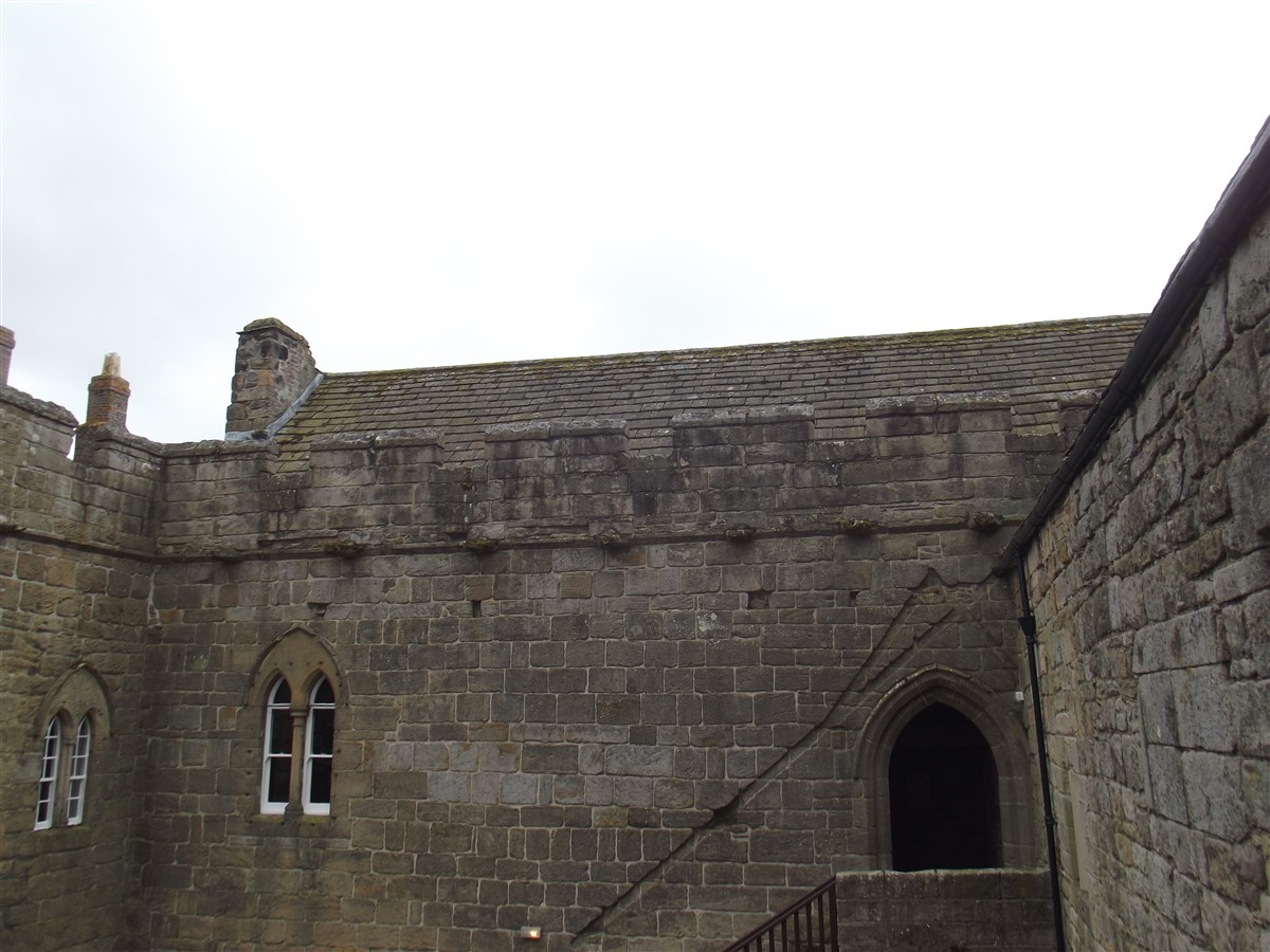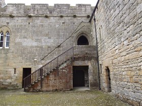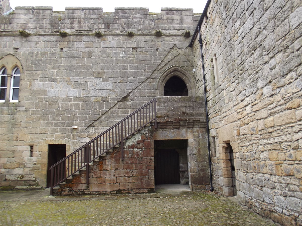 Courtyard wall has segmental-pointed gateway and crenellated parapet with arrow loops in merlons; square-headed doorway in north-west range gives access to wall walk.