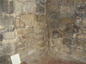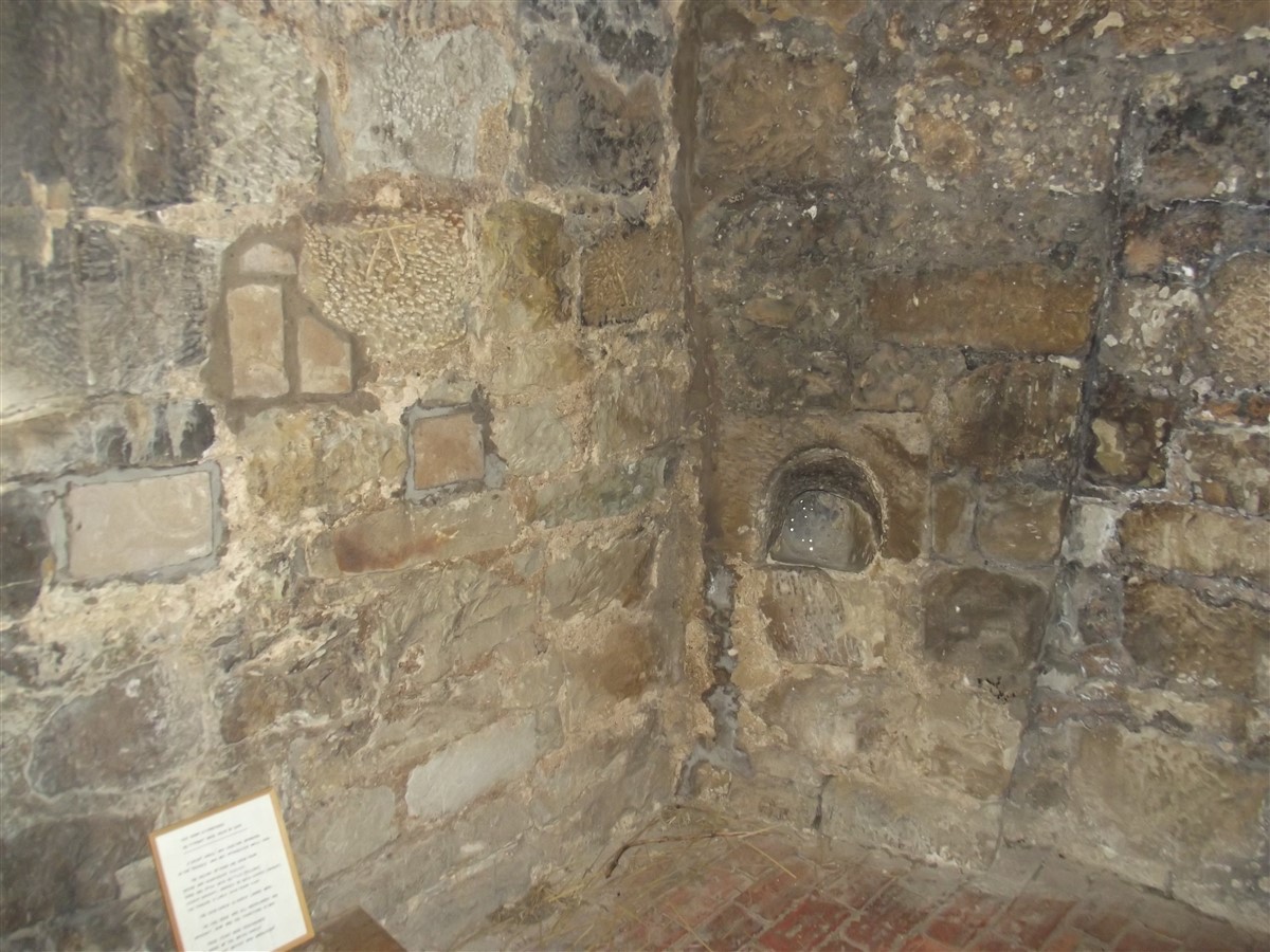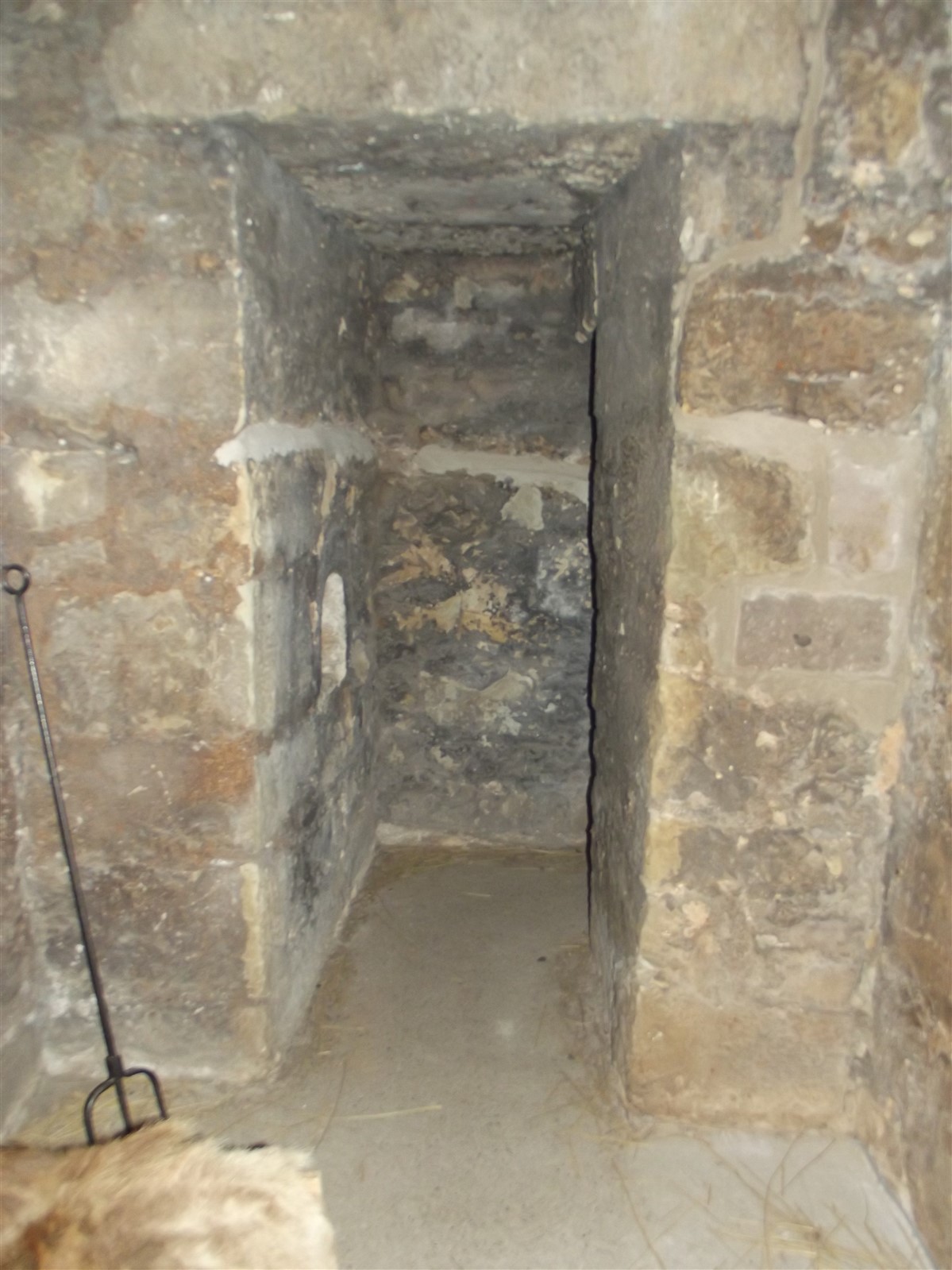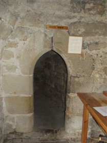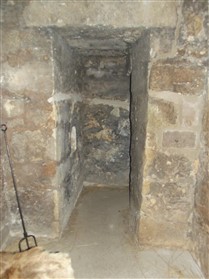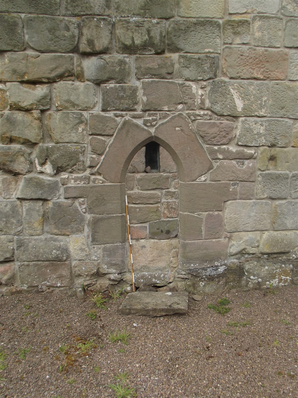 An entrance to the tower is at present afforded by a plain doorway, cut through the base of the south front, probably at the end of the seventeenth century. The basement of the south-east turret is entered through a pointed door, only 4 feet 9 inches high, set back like most of those in the building, in a recess under a half-arch. The rough pointed vaulting of the basement rises to a height of 7 feet, and the dimensions of the vault are 8 feet 9 inches from east to west, by 4 feet 7 inches from north to south. There is a slit, opening through the wall, at the east end. A similar vault in the south-west turret has a contrary direction, being about 8 feet 6 inches long from north to south, and 5 feet 6 inches wide from east to west. In this turret a slit, now blocked up, pierces the wall at the south end ; and in the west wall an opening has been made, which was doubtless in connection with the cottages that are shown built up against the tower in Mr. Archer's sketch of it, made in 1862.