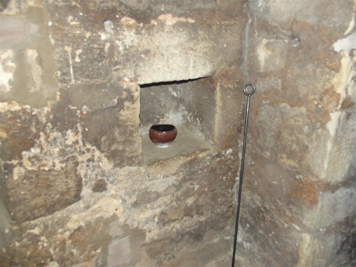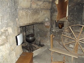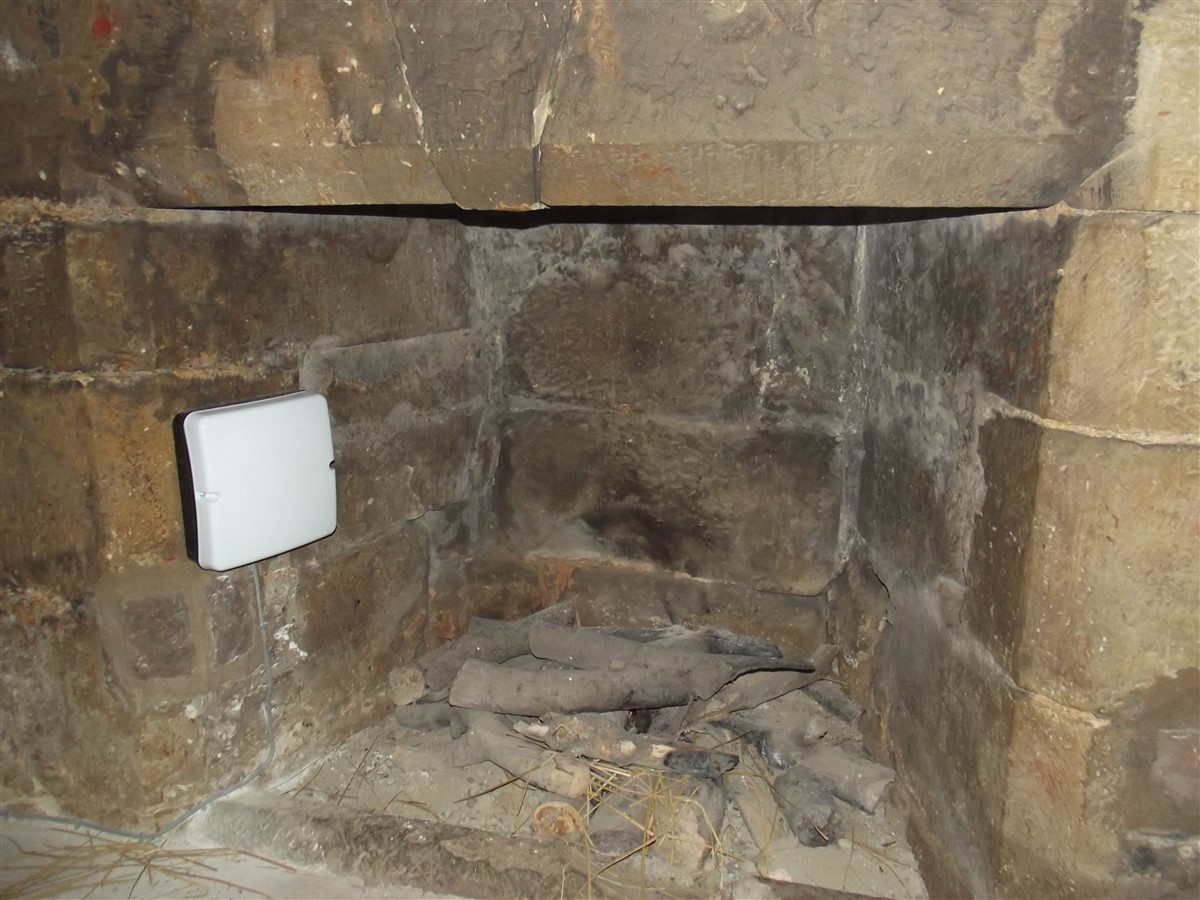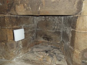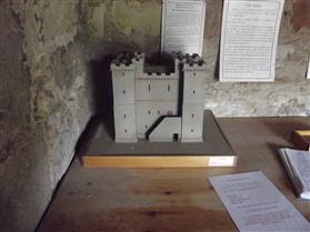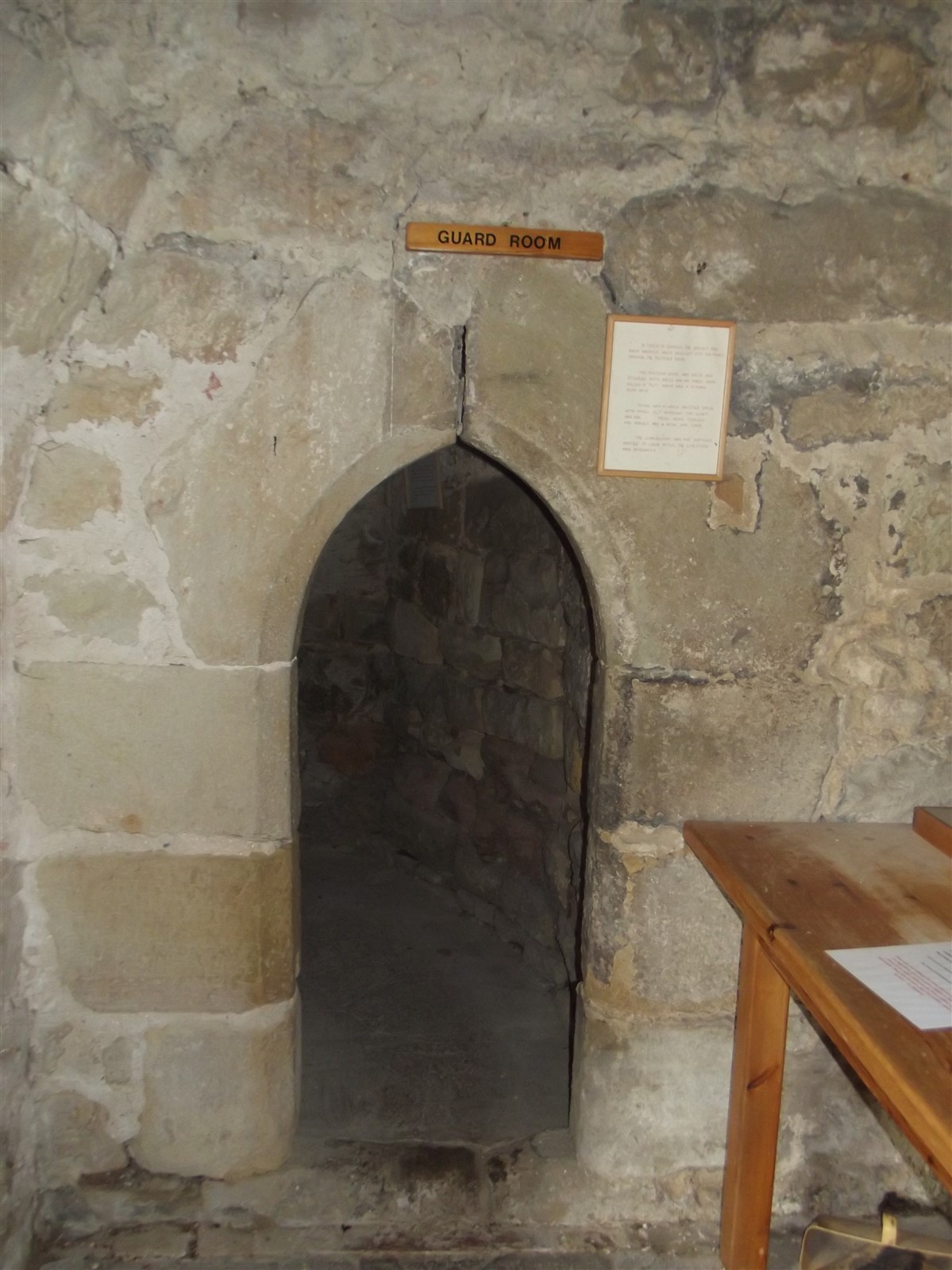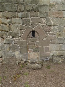 The vaulted rooms on the first floor of the turrets are provided with fire- places. A water-tank now nearly fills the vault in the south-west turret, but there is a good plain fire-place still intact in the east wall. The fire-places on the second floor have both fallen away. A moulding has been worked on the east jamb of the fire-place in the south-west turret. At the top of the south-east turret is a room about 8 feet square inside, with rubble walls, probably of the sixteenth century. A similar room in the south-west turret contains the bell on which the clock strikes. The roof of this room has been removed for the purpose of obtaining a better view from the battlements. At the south end of the second floor of the main block is a fine window recess, like some in Warkworth donjon, 5 feet 2 inches in width and 7 feet in height to the springers of the the low arch. The recess is now filled with the clock face, but is said to have formerly contained a square-headed transomed window of two cusped lights. (Bateson 1895)