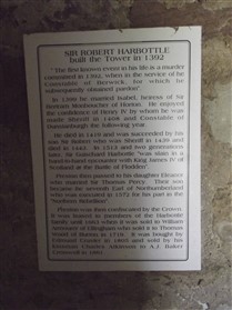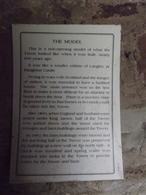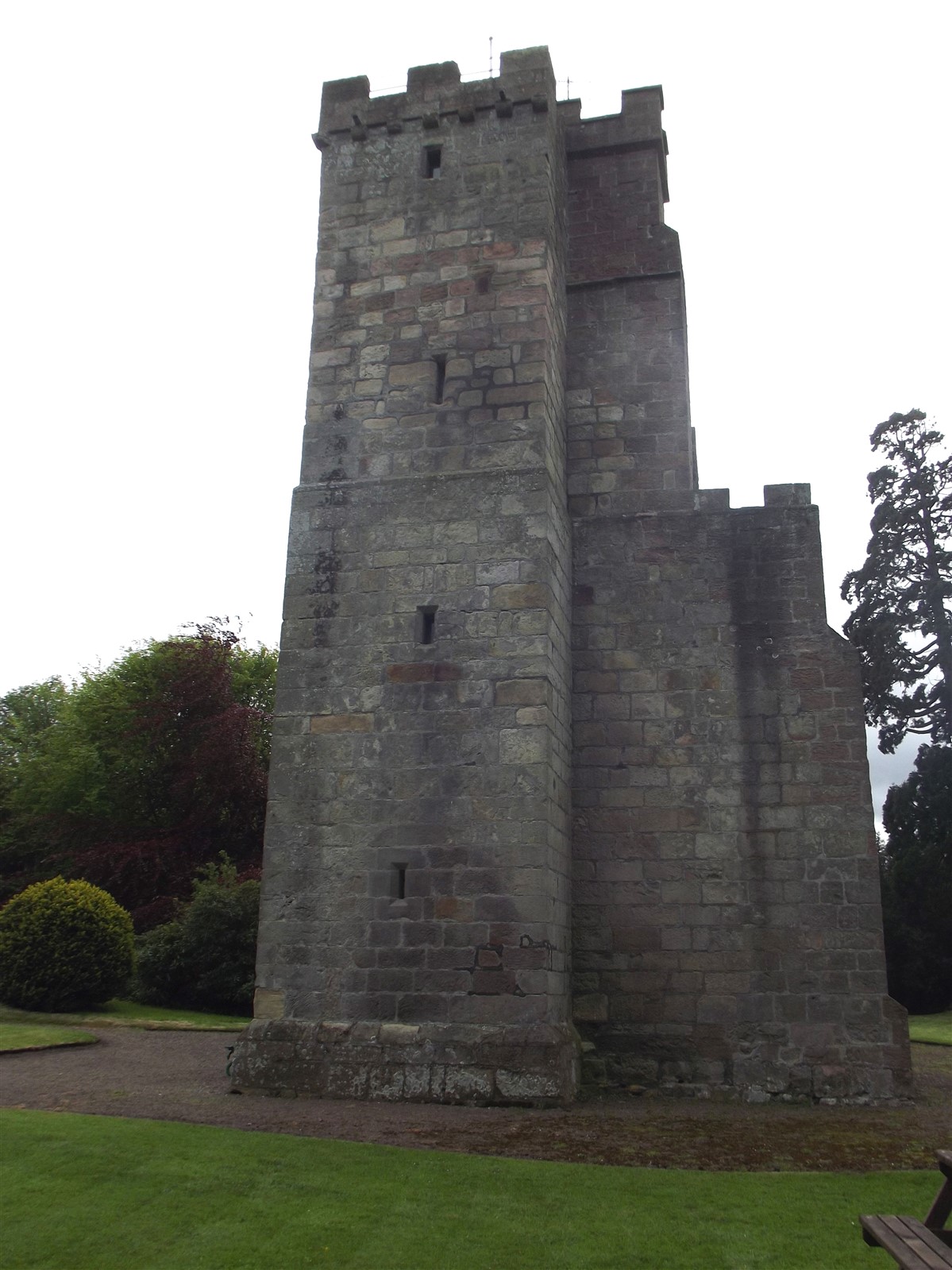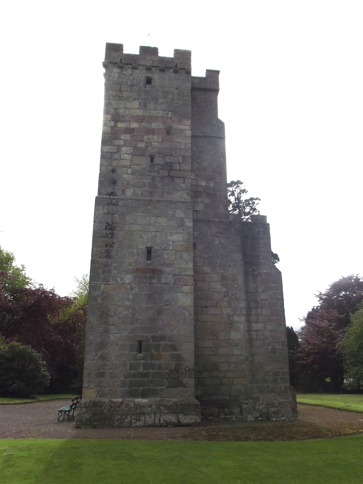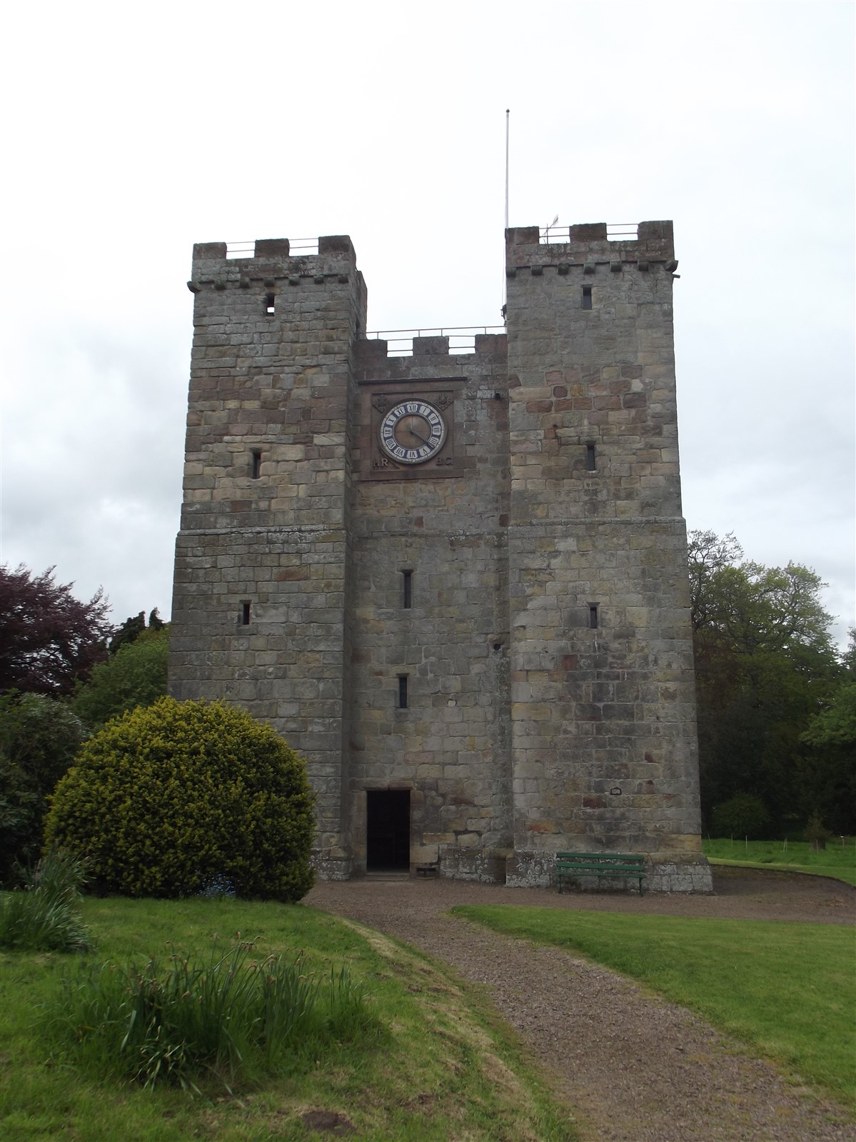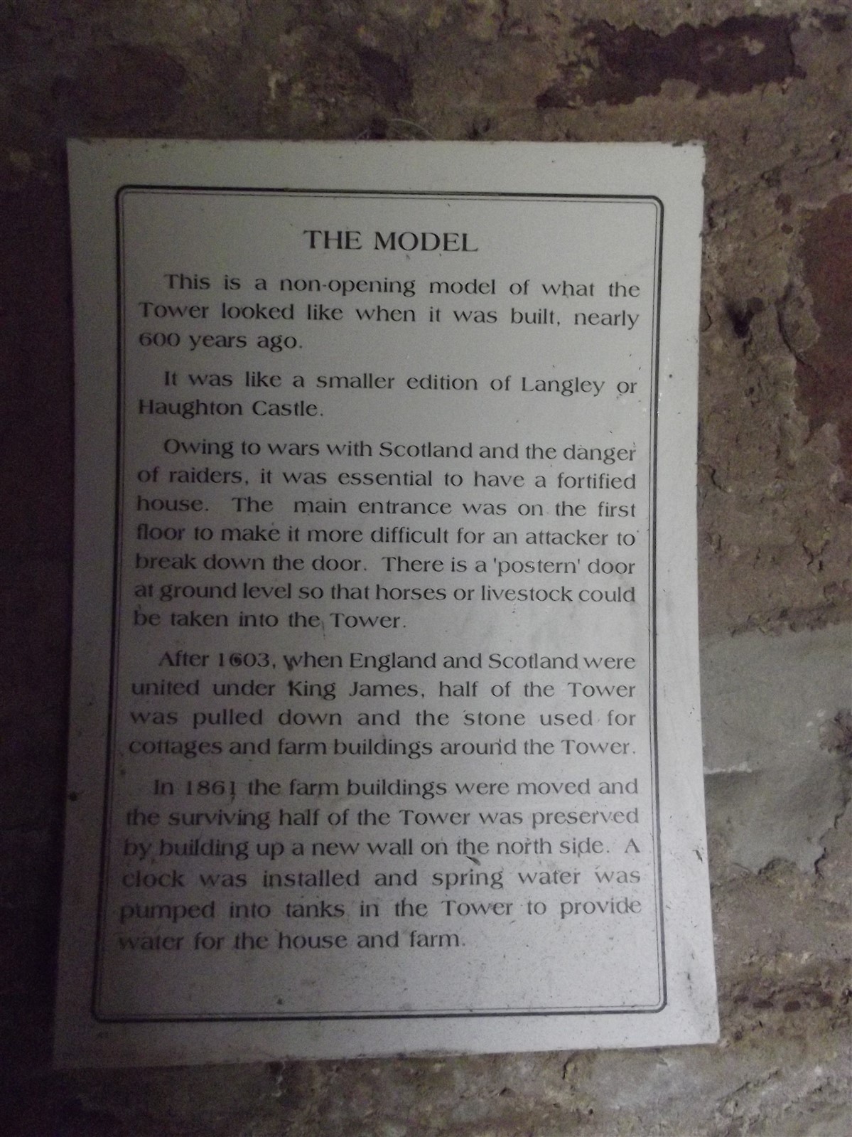 It is probable that the tower, when it was complete, closely resembled Haughton castle, though on a smaller scale. It was perhaps built by Robert Harbottle about the year 1415, and was originally a long building with turrets at the four angles. All that now remains of it is the south front, with the south-east and south-west corner turrets, and portions of the side walls, running north from them. The interior of the main building was 16 feet 7 inches wide, and the side walls are 6 feet 9 inches thick. The south-west turret is about 13 feet 6 inches square externally, and is slightly larger than the south-east one. The height of the tower is 49 feet 9 inches to the top of the battlements