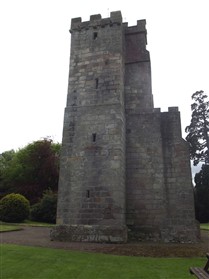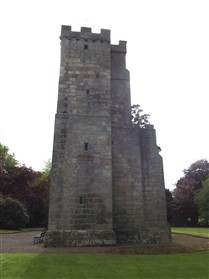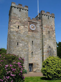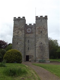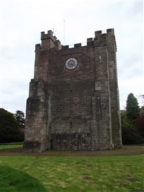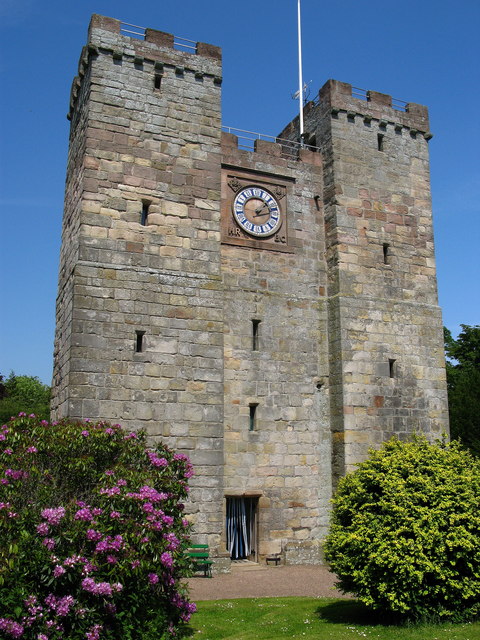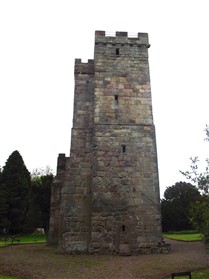 Part of tower house. C14 restored 1864 by Henry Robert Baker Cresswell. Squared stone with Welsh slate roof. The remains include the south wall and 2 southern corner turrets of a larger hall-type tower house with 4 towers (cf. Haughton Castle and Langley Castle). The rear wall is of 1864. 3 storeys. Chamfered plinth. Recessed centre flanked by projecting turrets. In the centre a boarded door in C16, or C17 chamfered surround. 2 slit windows with chamfered surrounds above door. 4 similar windows in turret to left, 3 in turret to right. On 2nd floor in centre, a large clock with ceramic face inscribed H R B C for the restorer. Embattled parapet. Higher turrets have rounded corbels below parapets. On left return a blocked, low, narrow C14 doorway with pointed arch and chamfered surround. To rear, similar clock face dated 1864. Interior: springing of ground-floor vault visible. The turrets have pointed tunnel-vaulted chambers on each floor. Also in turrets 3 C16 or C17 fireplaces with chamfered surrounds; one has a lintel, with keystone. Many mason's marks. C14 doorways into turret rooms have pointed arches and chamfered surrounds. (Listed Building Report)