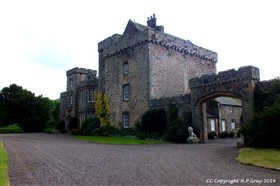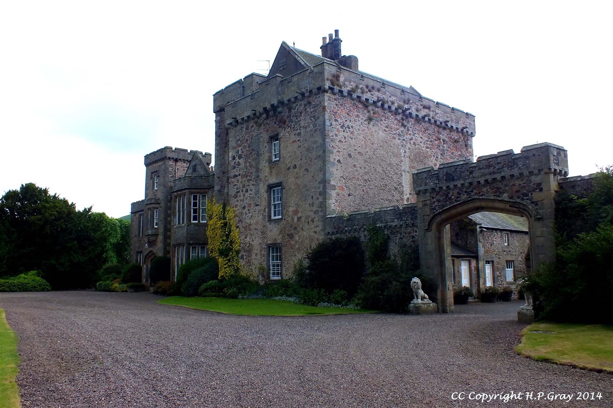 Country house. C16, C17, C18 and 1820-25. Random rubble including massive porphyry blocks, partly roughcast. Ashlar dressings and Scottish slate roofs.