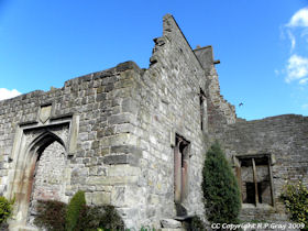 2-bay entrance block incorporates medieval fabric especially in east will: 4-centred moulded doorway (in square frame with foliage-carved spandrels under hoodmould) and 3-light window on front. 2-bay agent's house has window with re-set cable-moulded surround on front and projecting bay window on east return. 2-storey occupied house at west has one-bay front and 2-bay returns: 2-light first-floor-oriel window on front; embattled parapets; medieval fabric (including ground-floor room with rubble ceiling and external wall footings) at north-west corner. Wall enclosing yard has central round archway and incorporates re-set carved Roman and medieval fragments. 2-storey, 6-bay north range with 2-bay rear elevation of agent's house at east: 2- and 3-light windows and embattled parapet on 6-bay section; 3-light windows with arched heads on agent's house. Archway and former stable block (now restaurant) on west return of occupied house are not of special interest. Apart from the occupied house and north range, the remains are in a derelict condition