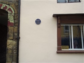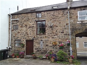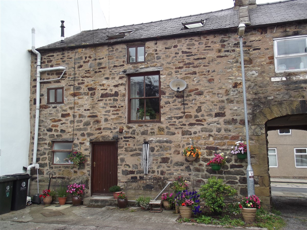 Converted bastle house now business premises. Late C16-early C17, altered 1740 (dated door lintel) and late C19. Rubble (rendered on front), Welsh slate roof and stone chimney stack. 2-storey, 2-window street front. Low rendered plinth. Off-centre, partly-glazed 4-panel door in chamfered stone surround. Door lintel has sunk shaped panel with raised letters: WBE 1740. Small boarded window to right (possibly a fire window). Early C19 4-pane shop window to left has plain pilaster surround, projecting sill and fascia with bracketed hood. 2 replaced casements above in deep reveals. Roof has coped left gable and left end stack with water table and top ledge. Blocked gable-end doorway, with massive roughly-shaped alternating jambs and lintel, through archway on left return. Tall boulder plinth and scattered openings on rear. Interior: fragment of partly-rebuilt wood winder stair against rear wall; first-floor room has wany ceiling beams (probably re-used rafters from the original roof). (Listed Building Report)