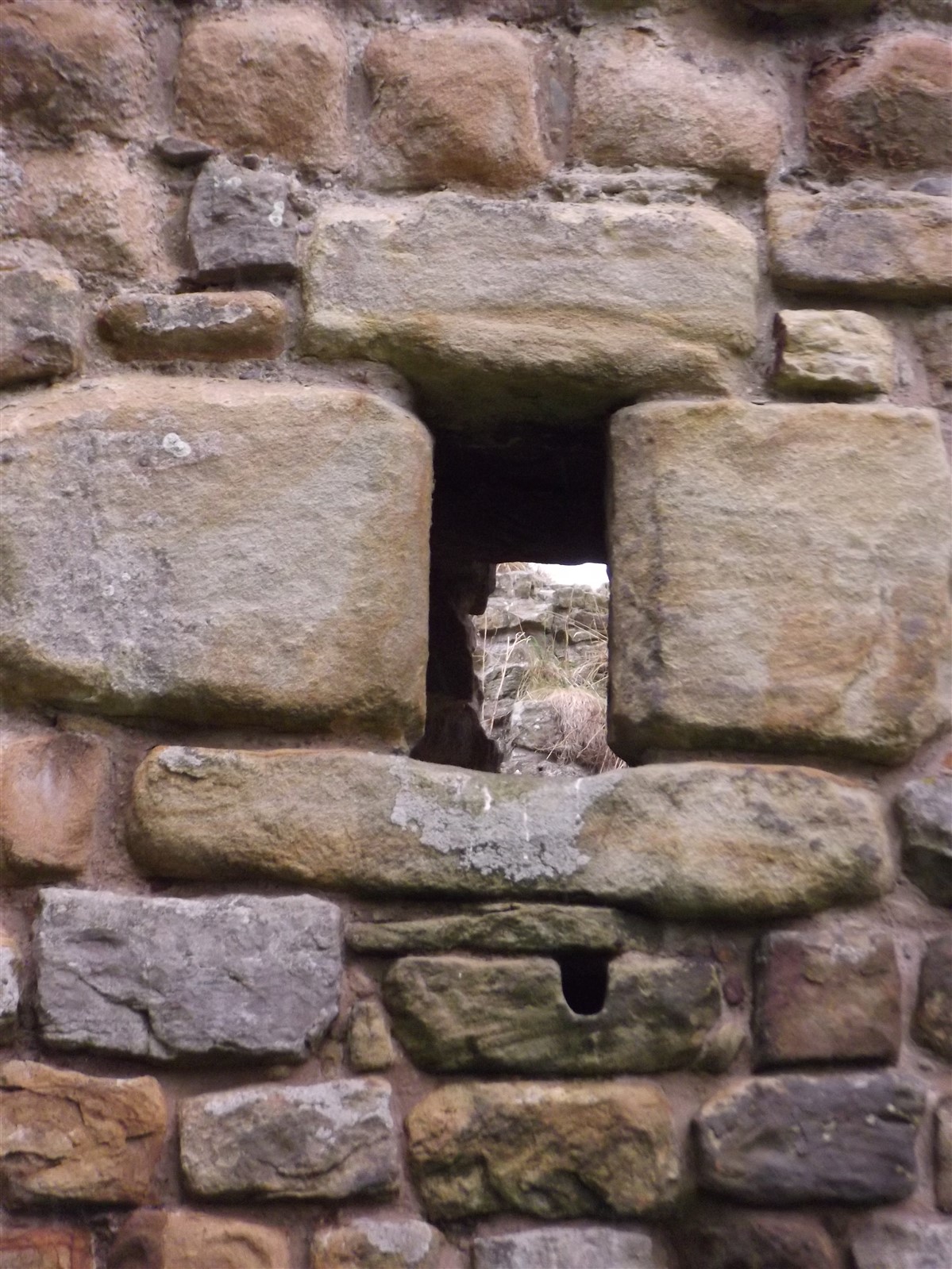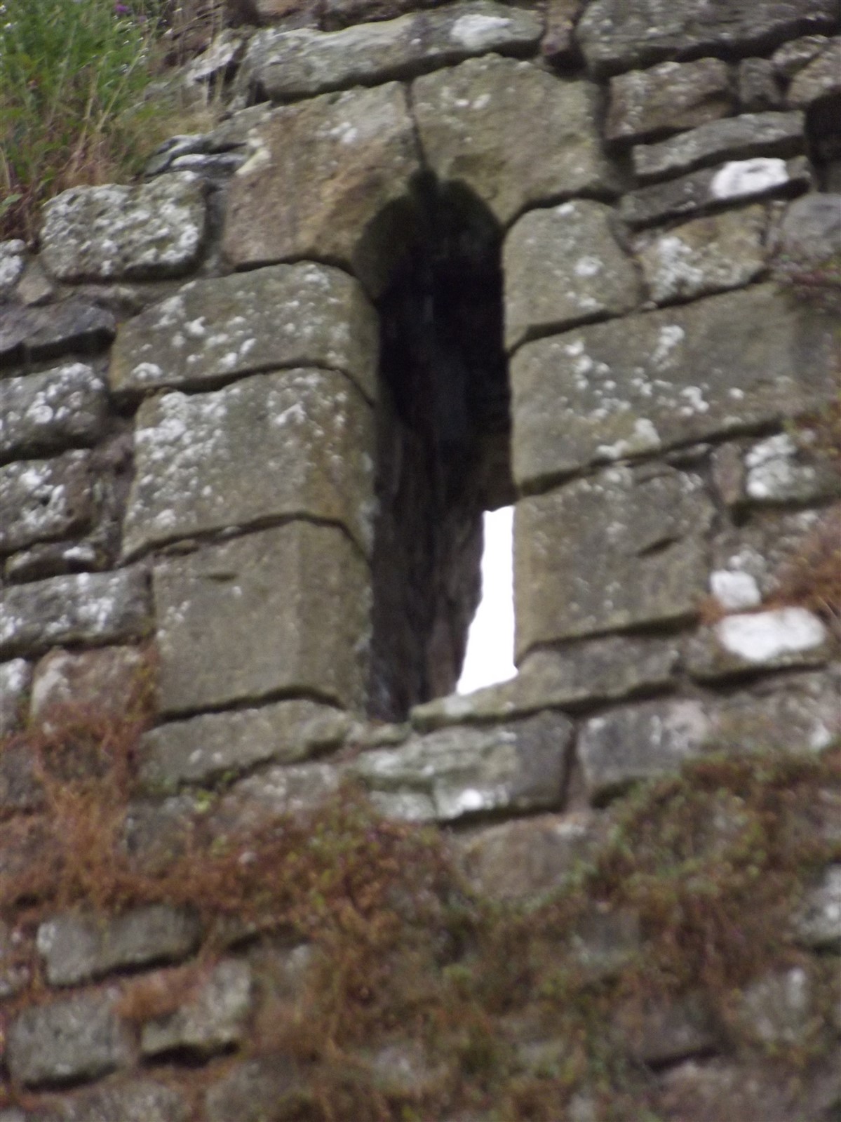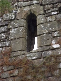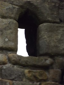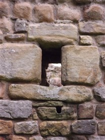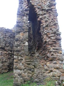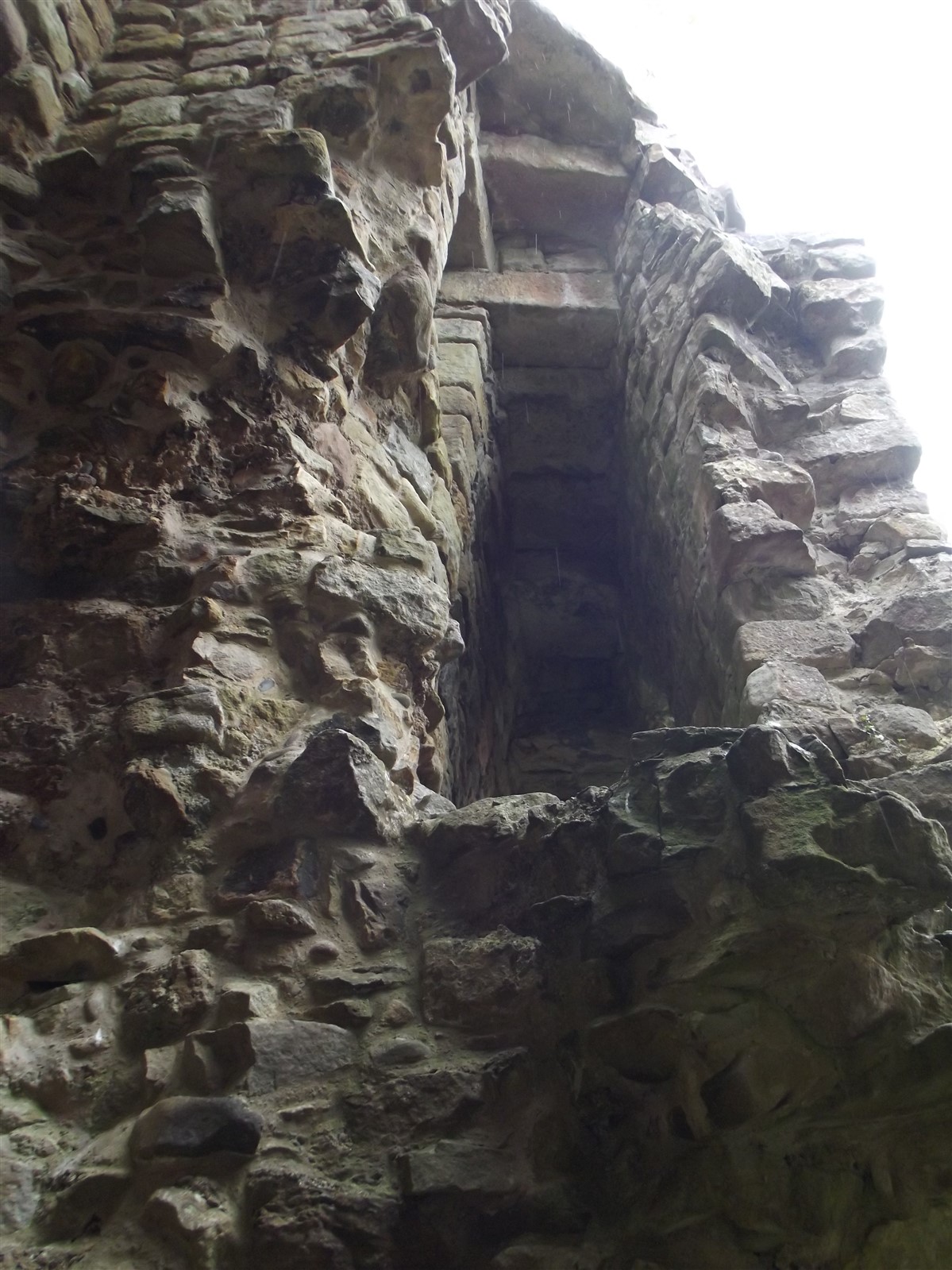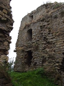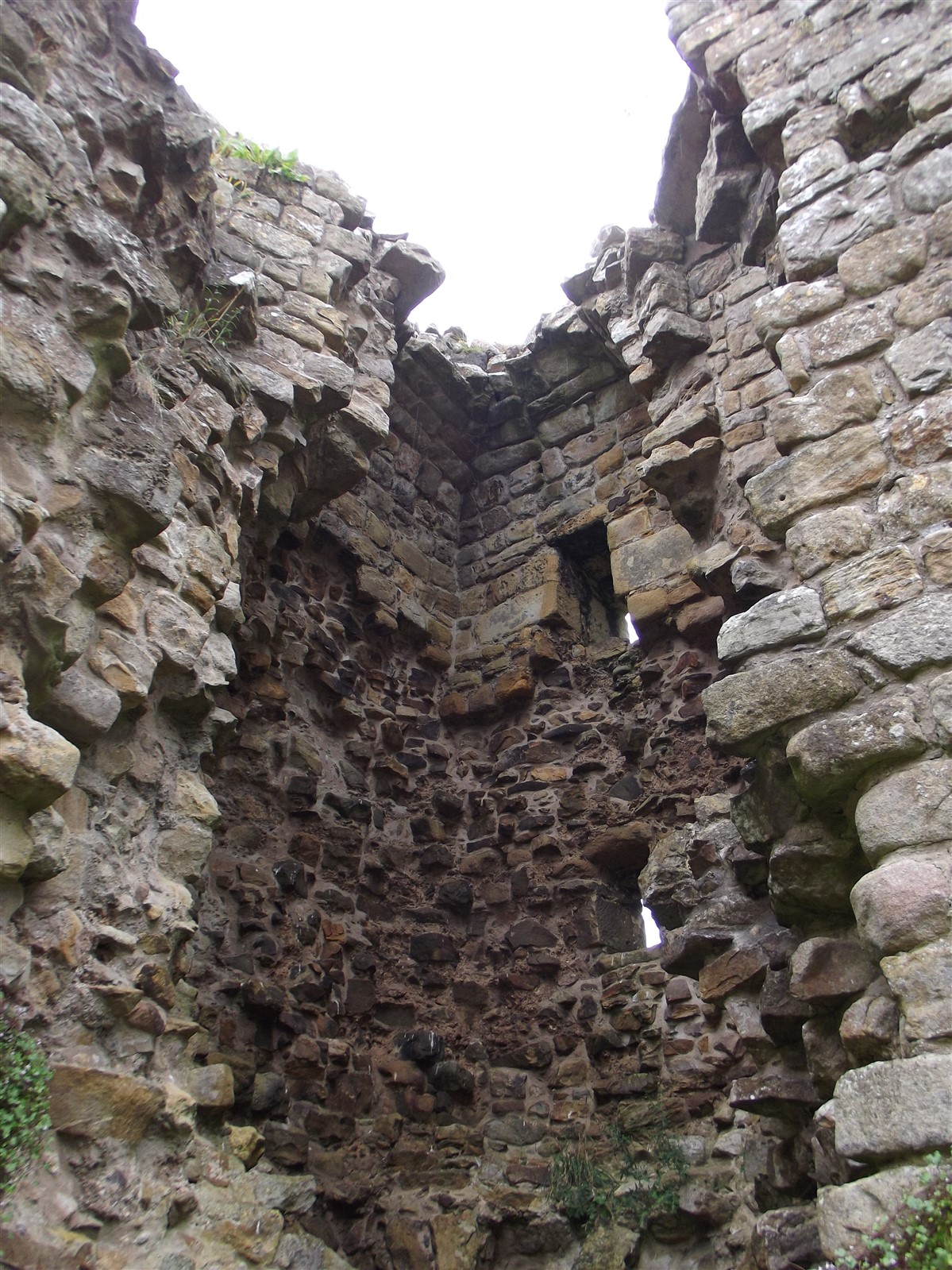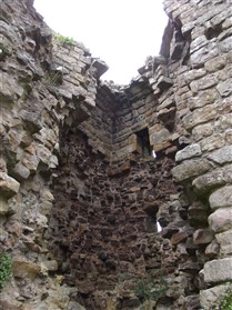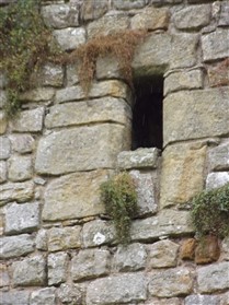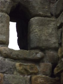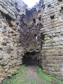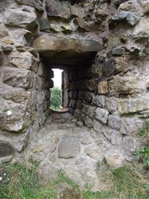 THE FIRST FLOOR: The first floor timbers of the main block were carried by an offset of 0.35m on each long wall; the first floor apartment, or apartments were very poorly lit; there is a single very narrow square headed loop in the south wall (with a chamfer to its external jambs but not its lintel), and a similar but more badly robbed loop midway along east and west walls. At the north end was a doorway into a mural stair rising to the second floor, roofed by overlapping slabs and lit by a small square headed loop. There was presumably a doorway into the small chamber in the north west turret, but this and the internal wall faces (and vault) of the turret have been almost entirely robbed away at this level; one fragment of surviving facing suggests that the chamber was approached through a lobby or angled passage.