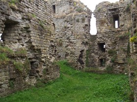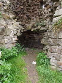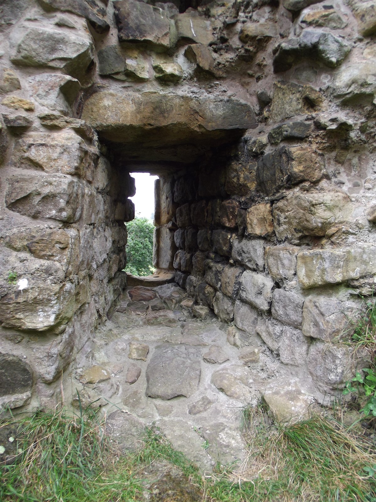 THE BASEMENT: The castle was entered by a doorway near the north end of the east wall; all that remains of this is part of the facing of the internal east jamb (set at right angles to the wall face), with a substantial drawbar tunnel. In the 1760s this doorway was complete, and Wallis found part of an iron gate still in place.