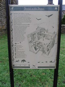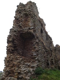 The castle is largely built of reused Roman stones, with larger well shaped sandstone quoins and dressings; there has been a continuous external chamfered plinth (now largely buried on the west, and robbed away on the east). Most of the facing has been robbed away from the lower sections of the walls. At re-entrant angles the coursing ends on a vertical joint, with only the occasional course being carried on to key in with the adjacent wall. This to other profile is well seen at the east end of the north wall, where the facing of the wall remains largely intact whereas the north east turret, into which it was keyed, has been completely removed.