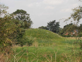Medieval motte and bailey, later used as a prospect mound, with associated moated fishponds, a hollow way and ridge and furrow, surviving as earthworks. The Motte is 16ft high, but the south east part has been mutilated by ballast digging. (PastScape)