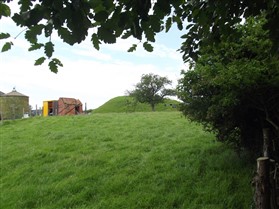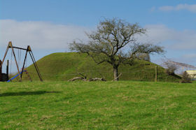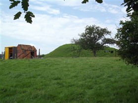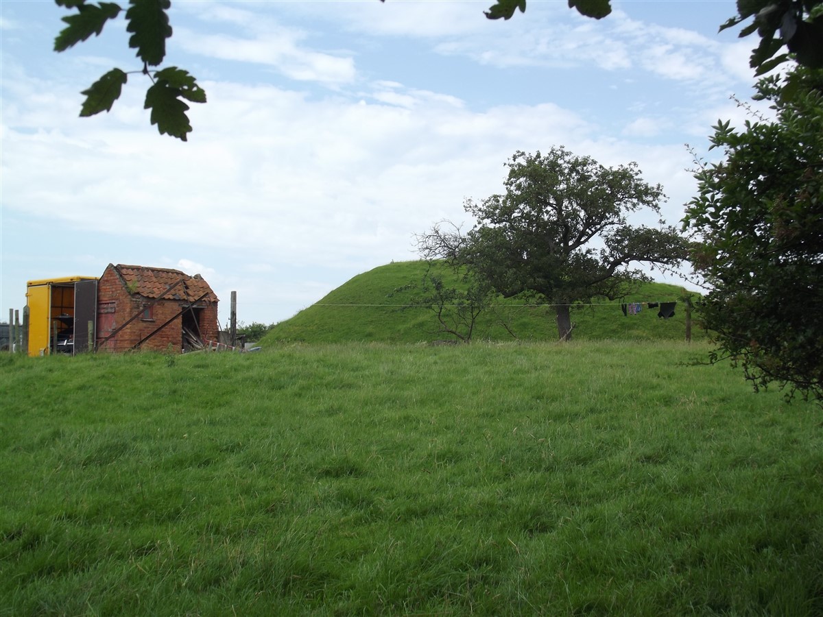 Medieval motte and bailey castle, in quite good condition although both the motte and the bailey have been damaged by animal tread particularly the bailey. The Motte is 460ft in circumference at the base and 198ft at the top, with an escarpment of 50ft slope at its highest. A probable entrance to the bailey exists to the north. (PastScape)