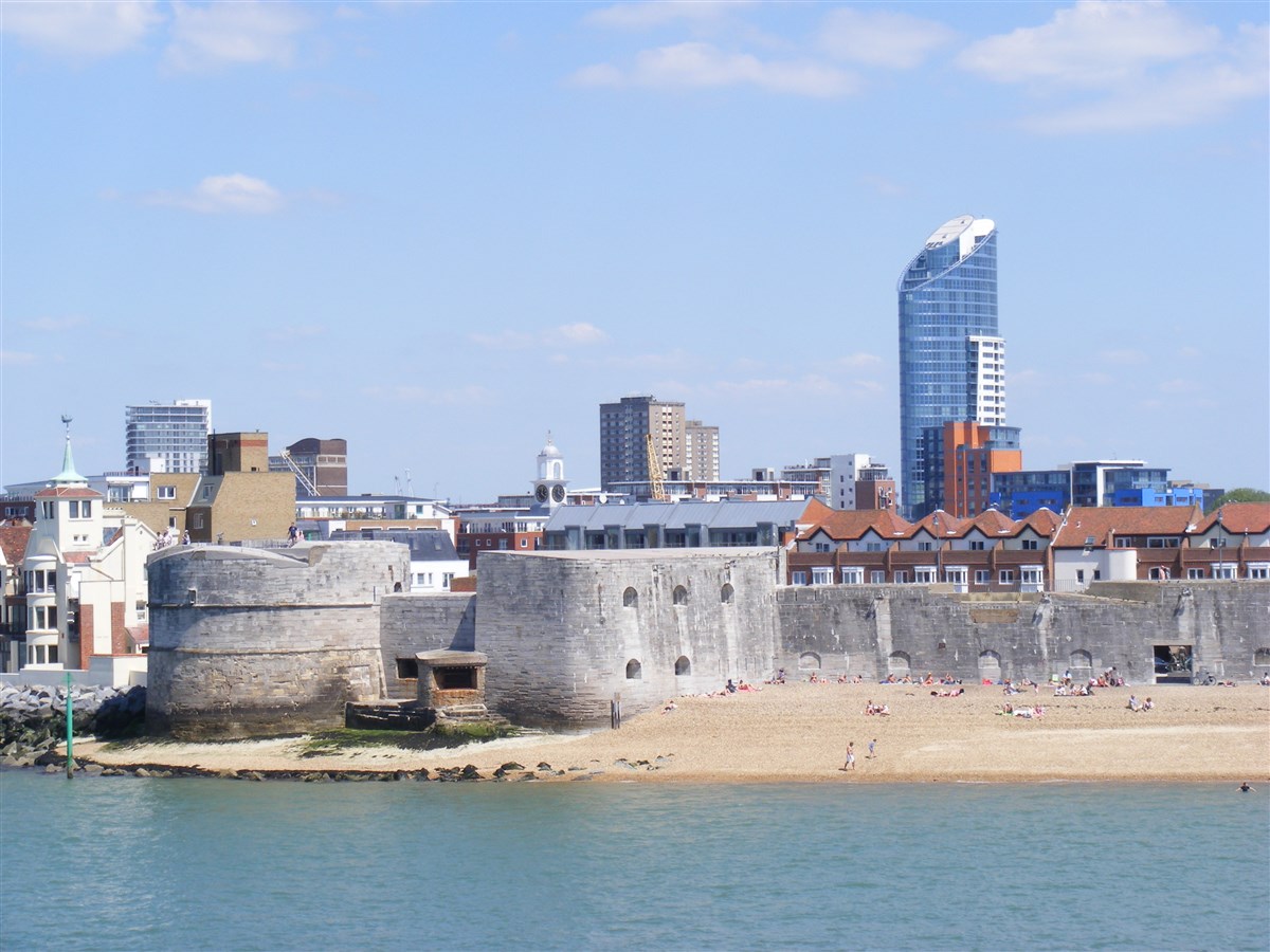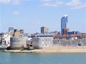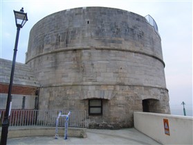 The Square Tower, King's Stairs, Sally Port, Eighteen Gun Battery, Round Tower, Flanking battery, Walls. The Square Tower stands at the south-west end of the High Street, part of the sea defences first constructed 1494, but repaired and reconstructed since. Once residence of the Governor of Portsmouth, then a powder magazine. Plain massive square ashlar tower. Ashlar wall to north-west connects tower to King's Stairs, and the Sally Port. From the Sally Port the Eighteen Gun Battery extends northwards to the Round Tower with a return section at right angles known as the Flanking Battery. The Round Tower is probably the earliest of the stone built defences, circa 1415. It is cylindrical with string courses dividing the three storeys. The ground floor circa 1538-40 gun ports of this period mostly blocked. Upper storeys probably part of Sir Bernard de Gomme's reconstruction, but largely rebuilt in early C.19, when the interior was recast with massive brickwork vaulting, casements behind the gun ports. Top reconstruction circa 1847-50 and adapted as gun platform