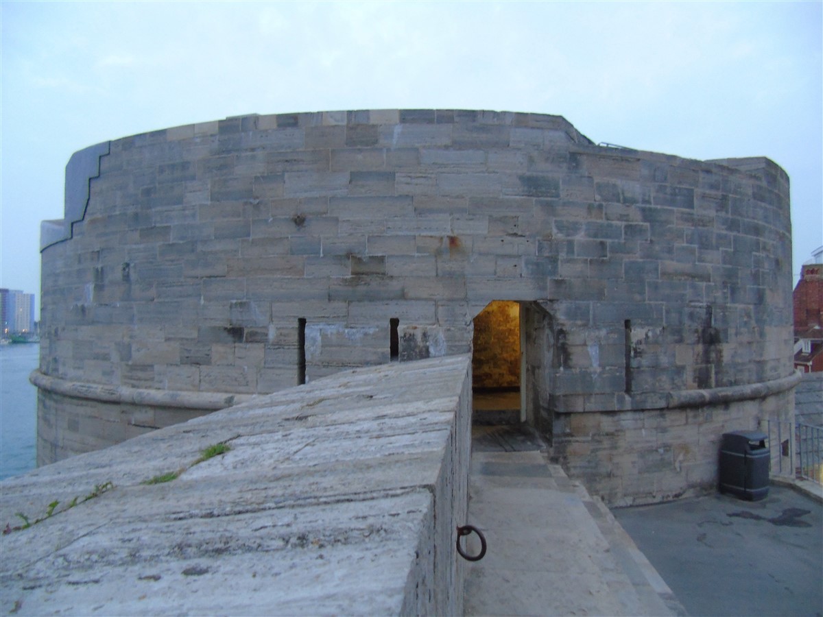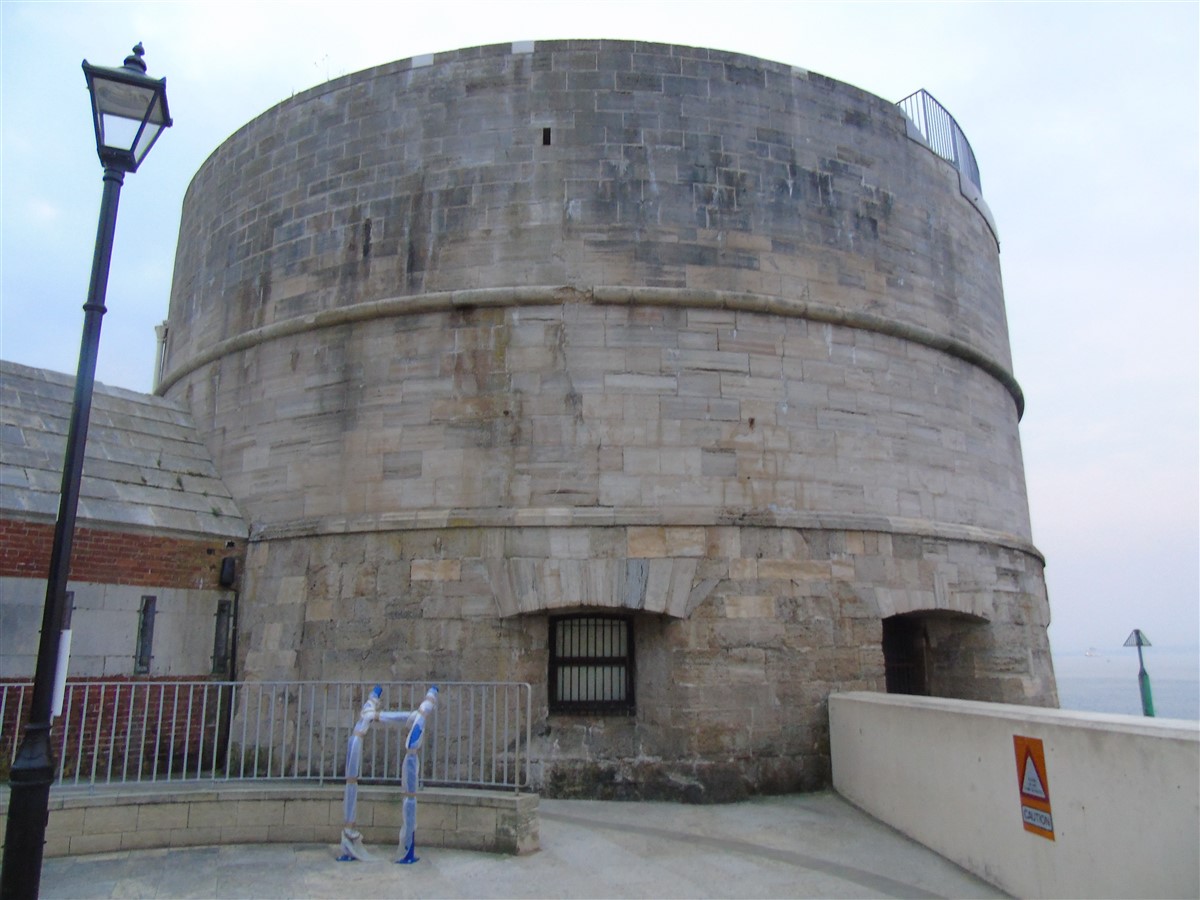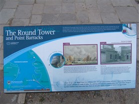 The Round Tower is probably the earliest of the stone built defences, circa 1415. It is cylindrical with string courses dividing the three storeys. The ground floor circa 1538-40 gun ports of this period mostly blocked. Upper storeys probably part of Sir Bernard de Gomme's reconstruction, but largely rebuilt in early C.19, when the interior was recast with massive brickwork vaulting, casements behind the gun ports. Top reconstruction circa 1847-50 and adapted as gun platform. Held west end of chain across harbour mouth, east end held by Fort Blockhouse, Gosport