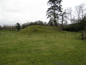 Mutilated remains of a small motte within a meadow, has a base diameter of about 28.0m and a present maximum height of 3.2m, but the mound has been quarried into extensively on the E and S sides. On the E side are traces of what may have been a ditch, 10.0m in width, 0.3m in depth, which connects with a stream on the S side (F1 ASP 15-OCT-73). (PastScape)