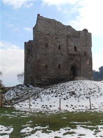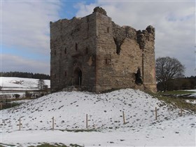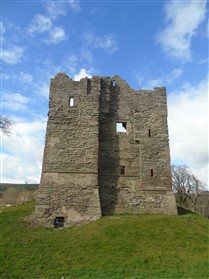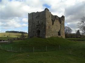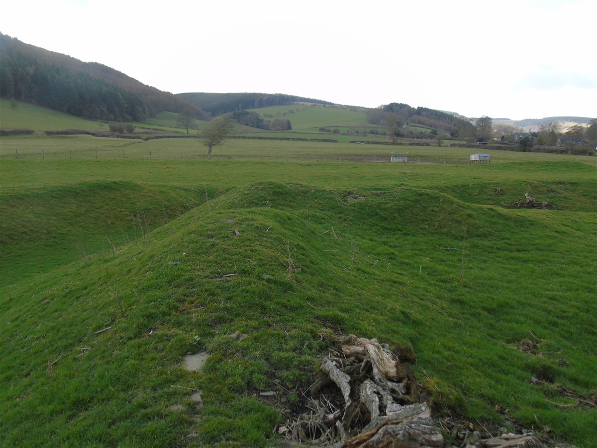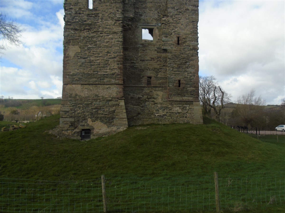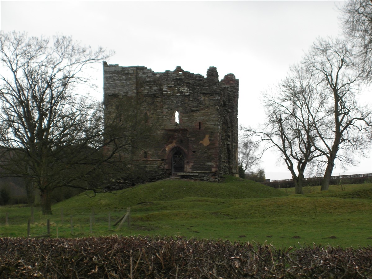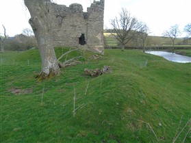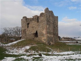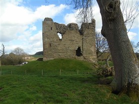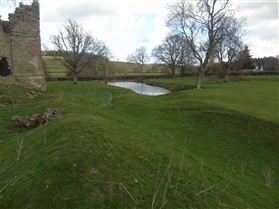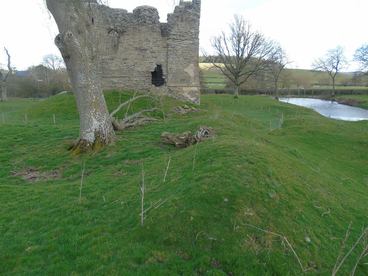 The remains of a causeway project into the motte ditch below the west door, this may represent the site of a drawbridge. A ditch up to 8m wide and 1m deep surrounds the motte and remains visible as an earthwork throughout most of its circuit. A section some 20m long around the north east side has been largely eroded away, probably as a result of periodic flooding by the stream to the north. A well defined scarp averaging 1m in height separates the site from this stream, creating a flat raised area between the motte and the stream. The remains of a building, comprising a circular platform 10m in diameter with its centre hollowed to a depth of 0.5m, lies in the south east corner of this level area. There are two bailey enclosures attached to the motte, these being designed to contain and protect the domestic buildings associated with the castle. The roughly rectangular inner bailey lies immediately to the west of the motte and has maximum internal dimensions of 40m north to south by 30m east to west. It is bounded on all sides by a well defined scarp falling to a ditch 12m wide and 2.6m deep. A concentration of stone around the upper edge of the bailey scarp suggests that it was originally surmounted by a curtain wall. A 6m square embanked hollow, positioned at the south west corner of the bailey is believed to represent the site of a tower or turret. In the north east quadrant of the bailey are two rectangular hollows; they lie parallel to each other and are orientated roughly east to west. The more northerly has dimensions of 16m long by 6m wide, the southerly, which has the remains of a foundation wall visible in its north side, is 15m long by 8m wide. Both are believed to represent the remains of rectangular domestic buildings associated with the occupation of the castle. A second, outer bailey, lies to the south and west of the motte and inner bailey, strengthening the defences around these sides. It is a raised platform 1.5m high, roughly L-shaped in plan which wraps around the motte and inner bailey. The longest arm is 130m east to west flanked along its south side by a substantial outer ditch 12m wide and between 1.7m and 2m deep. This ditch continues around the east end of the bailey, turning around the north side to separate the bailey from the motte and platform to the north. Here the ditch is widened to create a rectangular water-filled fishpond 50m east to west by 17m wide and averaging 2m in depth. This is linked at its western end by a channel 18m long and 6m wide to the ditch of the motte and inner bailey. The shorter arm of the outer bailey extends north for 70m from the west end of the longer arm and has no visible trace of an outer ditch. (Scheduling Report)
