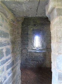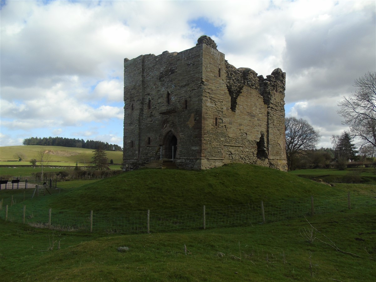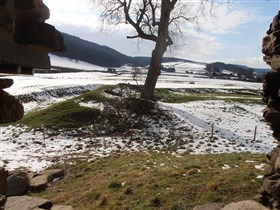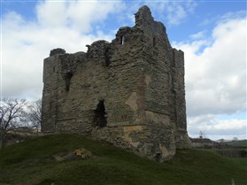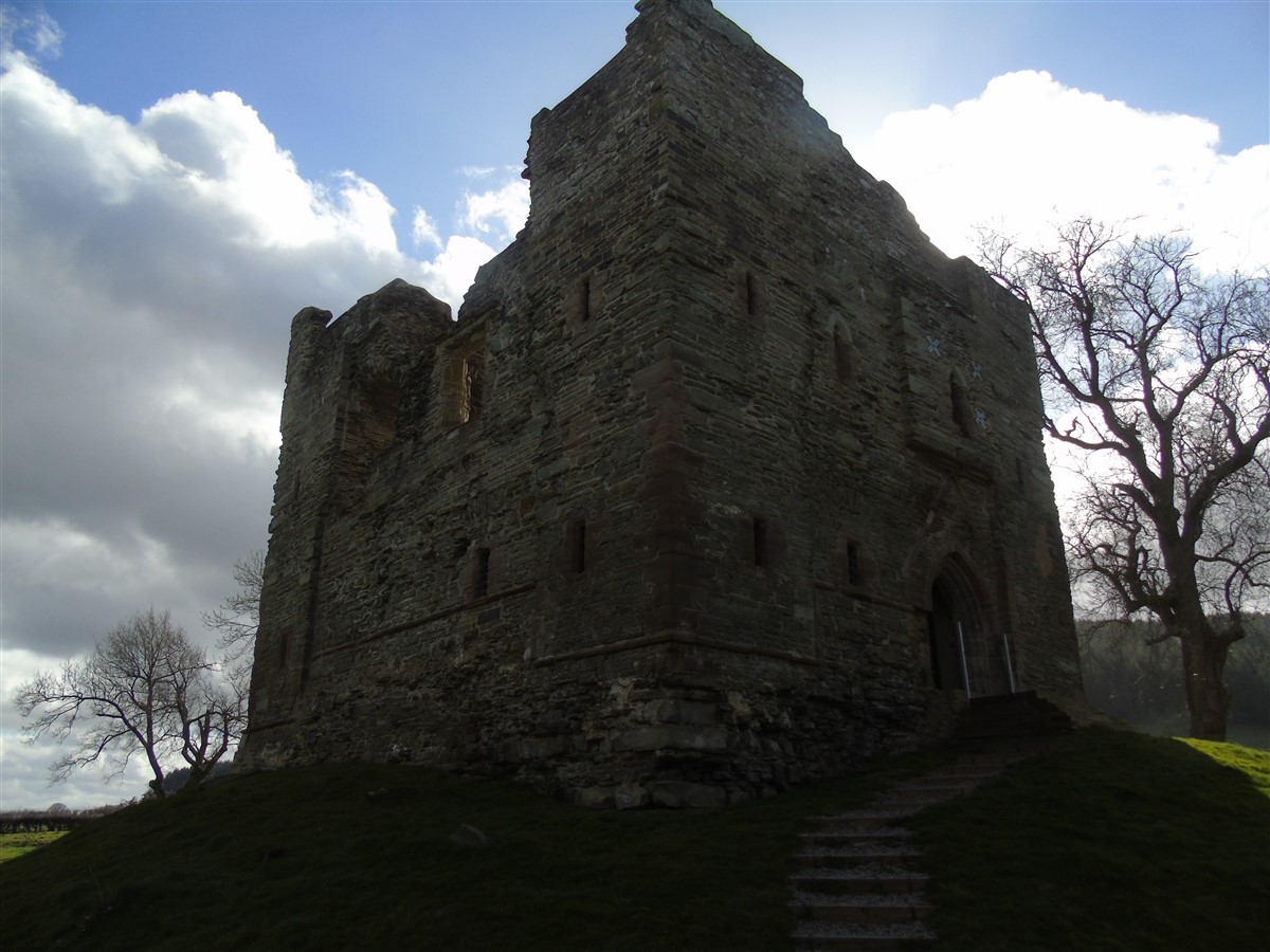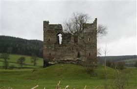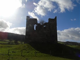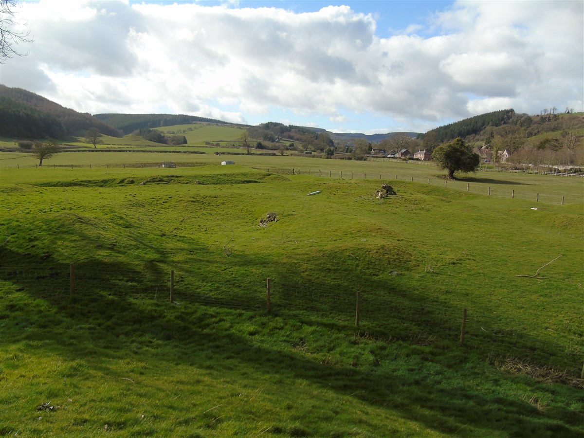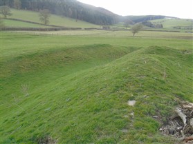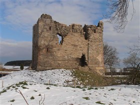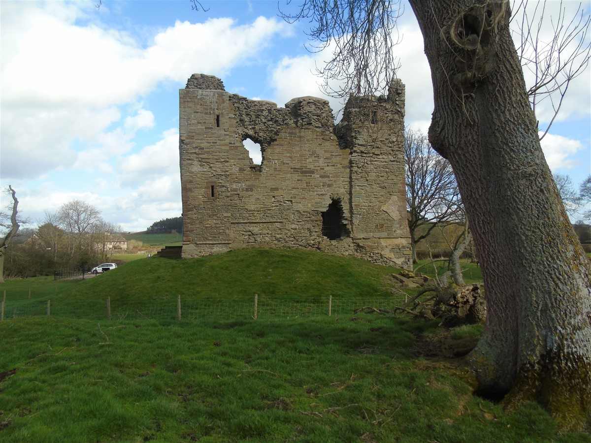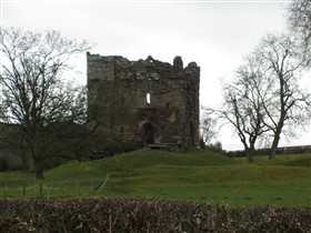 The remains of a causeway project into the motte ditch below the west door, this may represent the site of a drawbridge. A ditch up to 8m wide and 1m deep surrounds the motte and remains visible as an earthwork throughout most of its circuit. A section some 20m long around the north east side has been largely eroded away, probably as a result of periodic flooding by the stream to the north. A well defined scarp averaging 1m in height separates the site from this stream, creating a flat raised area between the motte and the stream. The remains of a building, comprising a circular platform 10m in diameter with its centre hollowed to a depth of 0.5m, lies in the south east corner of this level area. There are two bailey enclosures attached to the motte, these being designed to contain and protect the domestic buildings associated with the castle. The roughly rectangular inner bailey lies immediately to the west of the motte and has maximum internal dimensions of 40m north to south by 30m east to west. It is bounded on all sides by a well defined scarp falling to a ditch 12m wide and 2.6m deep. A concentration of stone around the upper edge of the bailey scarp suggests that it was originally surmounted by a curtain wall. A 6m square embanked hollow, positioned at the south west corner of the bailey is believed to represent the site of a tower or turret. In the north east quadrant of the bailey are two rectangular hollows; they lie parallel to each other and are orientated roughly east to west. The more northerly has dimensions of 16m long by 6m wide, the southerly, which has the remains of a foundation wall visible in its north side, is 15m long by 8m wide. Both are believed to represent the remains of rectangular domestic buildings associated with the occupation of the castle. A second, outer bailey, lies to the south and west of the motte and inner bailey, strengthening the defences around these sides. It is a raised platform 1.5m high, roughly L-shaped in plan which wraps around the motte and inner bailey. The longest arm is 130m east to west flanked along its south side by a substantial outer ditch 12m wide and between 1.7m and 2m deep. This ditch continues around the east end of the bailey, turning around the north side to separate the bailey from the motte and platform to the north. Here the ditch is widened to create a rectangular water-filled fishpond 50m east to west by 17m wide and averaging 2m in depth. This is linked at its western end by a channel 18m long and 6m wide to the ditch of the motte and inner bailey. The shorter arm of the outer bailey extends north for 70m from the west end of the longer arm and has no visible trace of an outer ditch. (Scheduling Report)