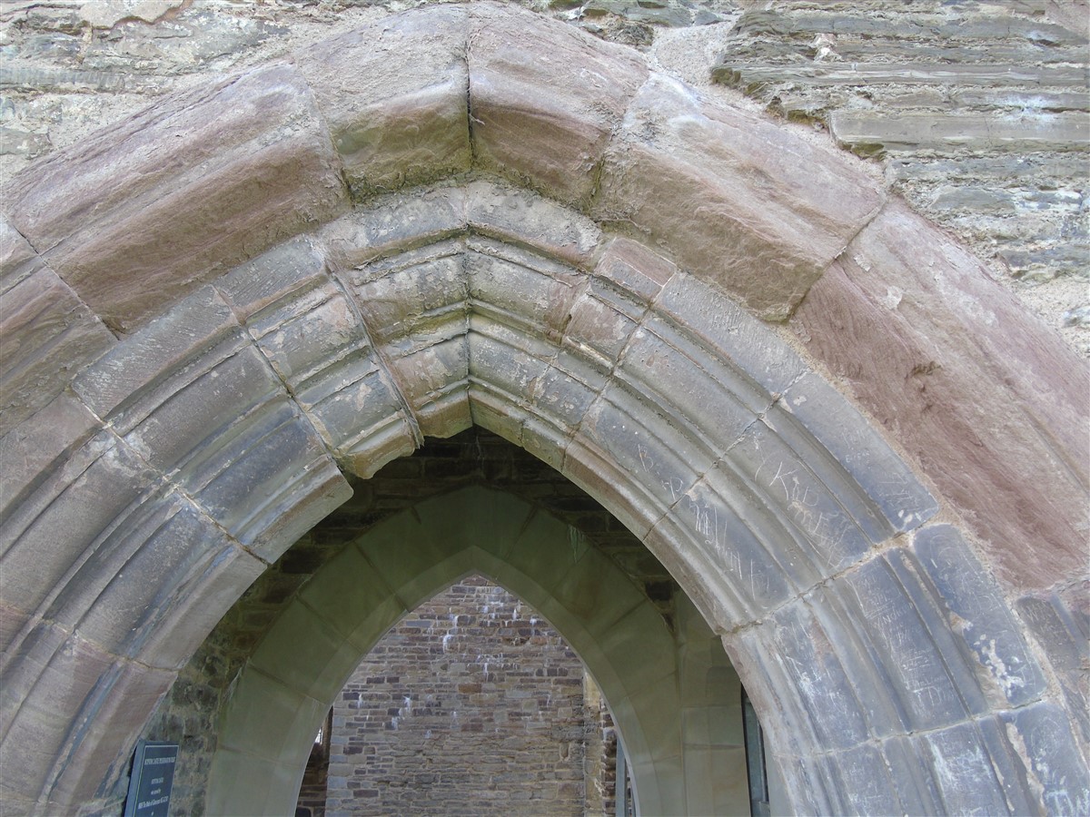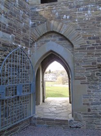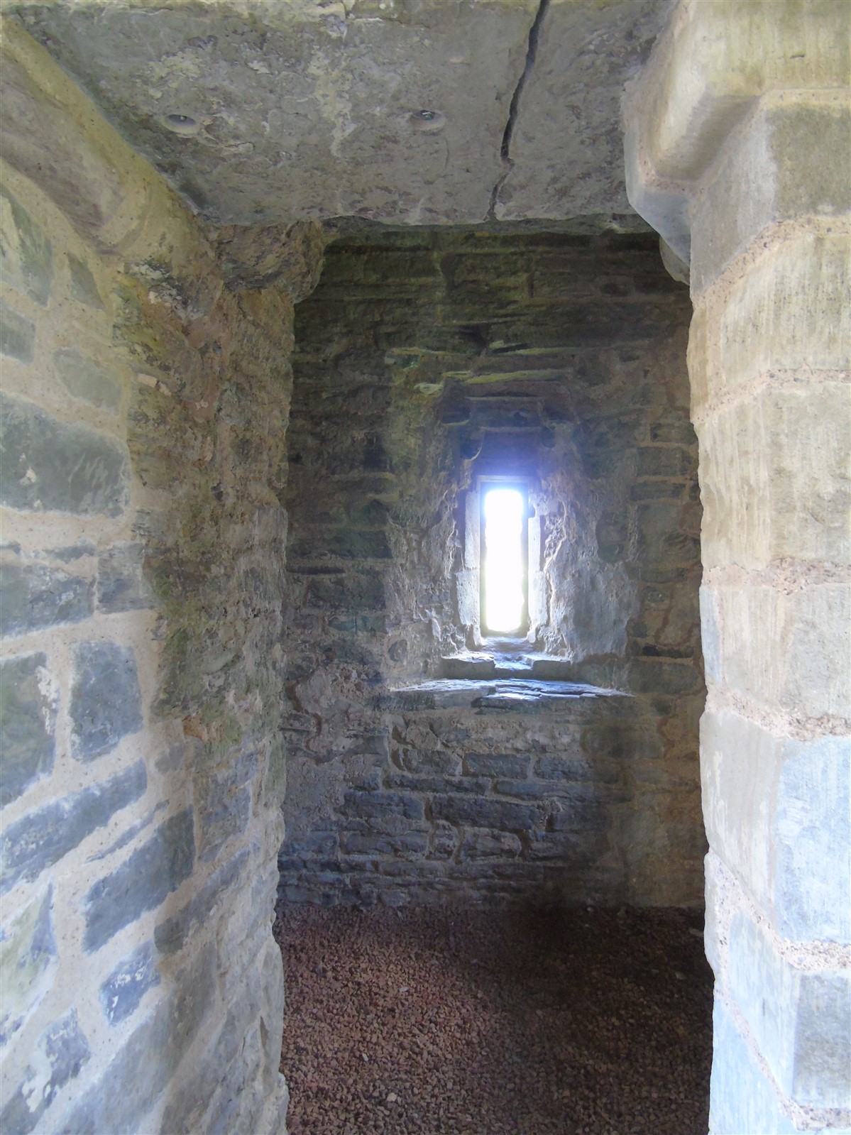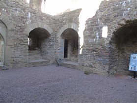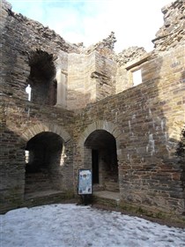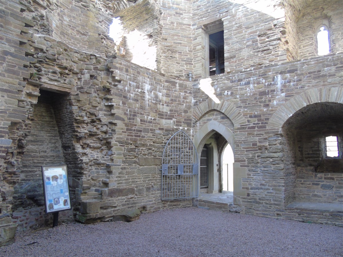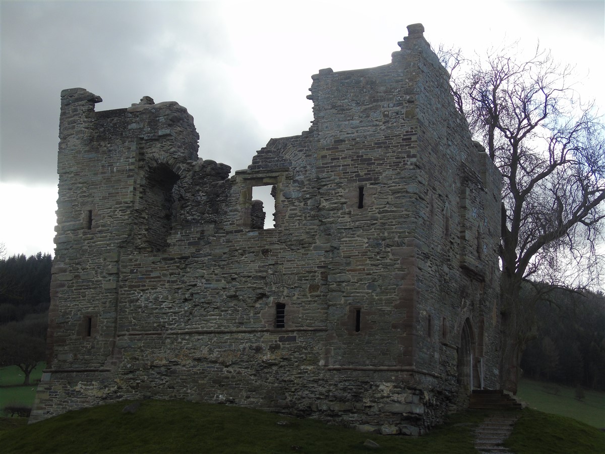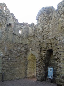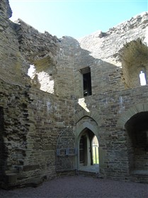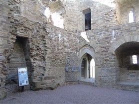 The remains of a causeway project into the motte ditch below the west door, this may represent the site of a drawbridge. A ditch up to 8m wide and 1m deep surrounds the motte and remains visible as an earthwork throughout most of its circuit. A section some 20m long around the north east side has been largely eroded away, probably as a result of periodic flooding by the stream to the north. A well defined scarp averaging 1m in height separates the site from this stream, creating a flat raised area between the motte and the stream. The remains of a building, comprising a circular platform 10m in diameter with its centre hollowed to a depth of 0.5m, lies in the south east corner of this level area. There are two bailey enclosures attached to the motte, these being designed to contain and protect the domestic buildings associated with the castle. The roughly rectangular inner bailey lies immediately to the west of the motte and has maximum internal dimensions of 40m north to south by 30m east to west. It is bounded on all sides by a well defined scarp falling to a ditch 12m wide and 2.6m deep. A concentration of stone around the upper edge of the bailey scarp suggests that it was originally surmounted by a curtain wall. A 6m square embanked hollow, positioned at the south west corner of the bailey is believed to represent the site of a tower or turret. In the north east quadrant of the bailey are two rectangular hollows; they lie parallel to each other and are orientated roughly east to west. The more northerly has dimensions of 16m long by 6m wide, the southerly, which has the remains of a foundation wall visible in its north side, is 15m long by 8m wide. Both are believed to represent the remains of rectangular domestic buildings associated with the occupation of the castle. A second, outer bailey, lies to the south and west of the motte and inner bailey, strengthening the defences around these sides. It is a raised platform 1.5m high, roughly L-shaped in plan which wraps around the motte and inner bailey. The longest arm is 130m east to west flanked along its south side by a substantial outer ditch 12m wide and between 1.7m and 2m deep. This ditch continues around the east end of the bailey, turning around the north side to separate the bailey from the motte and platform to the north. Here the ditch is widened to create a rectangular water-filled fishpond 50m east to west by 17m wide and averaging 2m in depth. This is linked at its western end by a channel 18m long and 6m wide to the ditch of the motte and inner bailey. The shorter arm of the outer bailey extends north for 70m from the west end of the longer arm and has no visible trace of an outer ditch. (Scheduling Report)