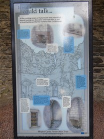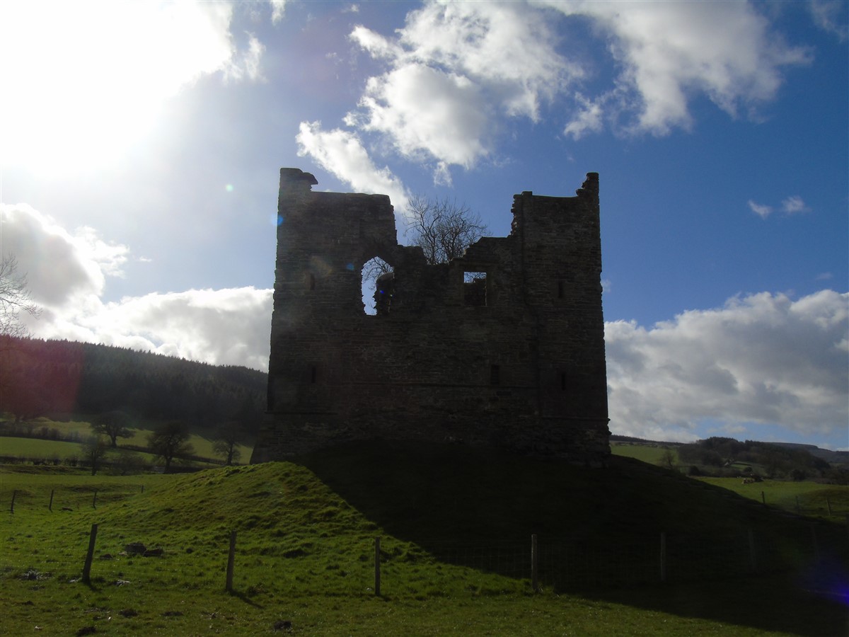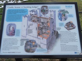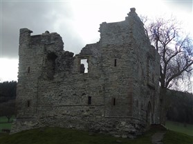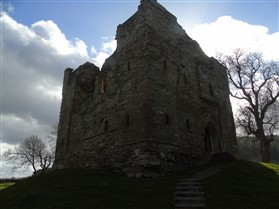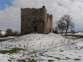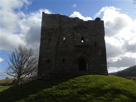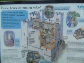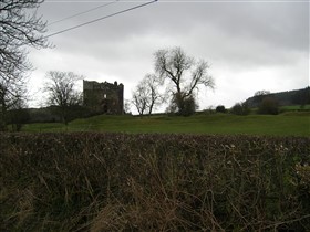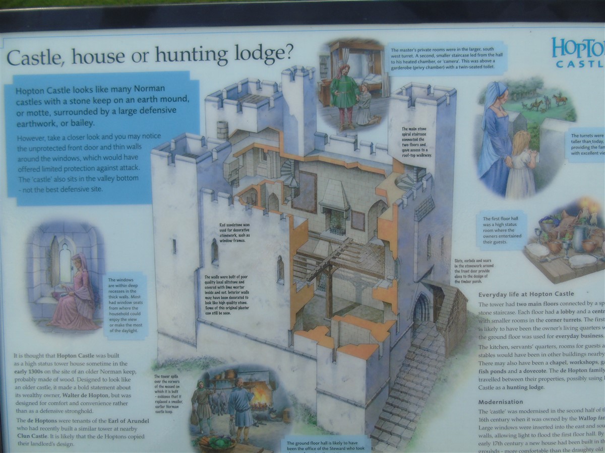 Hopton was a quite small manor when recorded in Domesday, one of many held as overloard by Picot de Say. The original motte represents the home of a knight owing castle-guard to Clun Castle. The tenant took the name Hopton as the family name and the tenancy was held for the quite considerable service of two knights-fee including a permanently resident soldier at Clun. The Hopton's were tenants of Broadward and Coston, Hopton Castle was their caput and it's relative large size represents this status. The important and military status of the family was later expressed in the building of, what in effect is, a modest tower house in the form of a Norman great tower on the motte. Some of the earthworks around the tower are of C17 Civil War date. Some appear to be the result of collapsed earth-filled wicker gabions