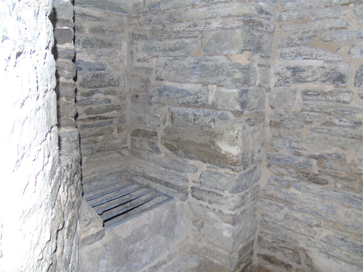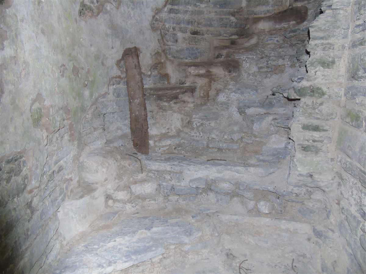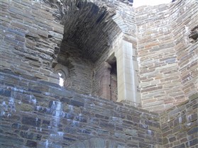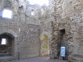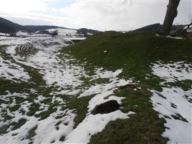 Heavy scatters of stone around the perimeter suggest the bailey to have been enclosed with a curtain wall and at the SW corner is the site of a tower or turret, indicated by an embanked hollow, 6.0m square. The enclosing ditch is 12.0m in width and is up to 2.7m in depth.