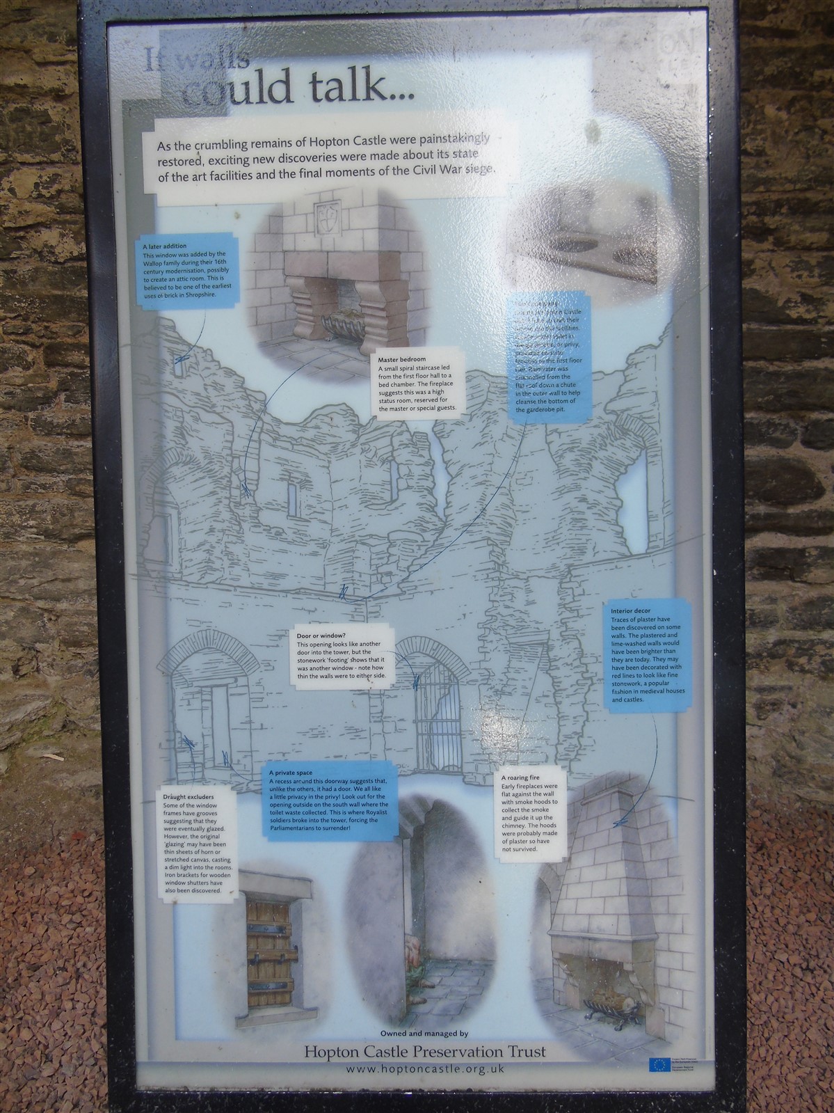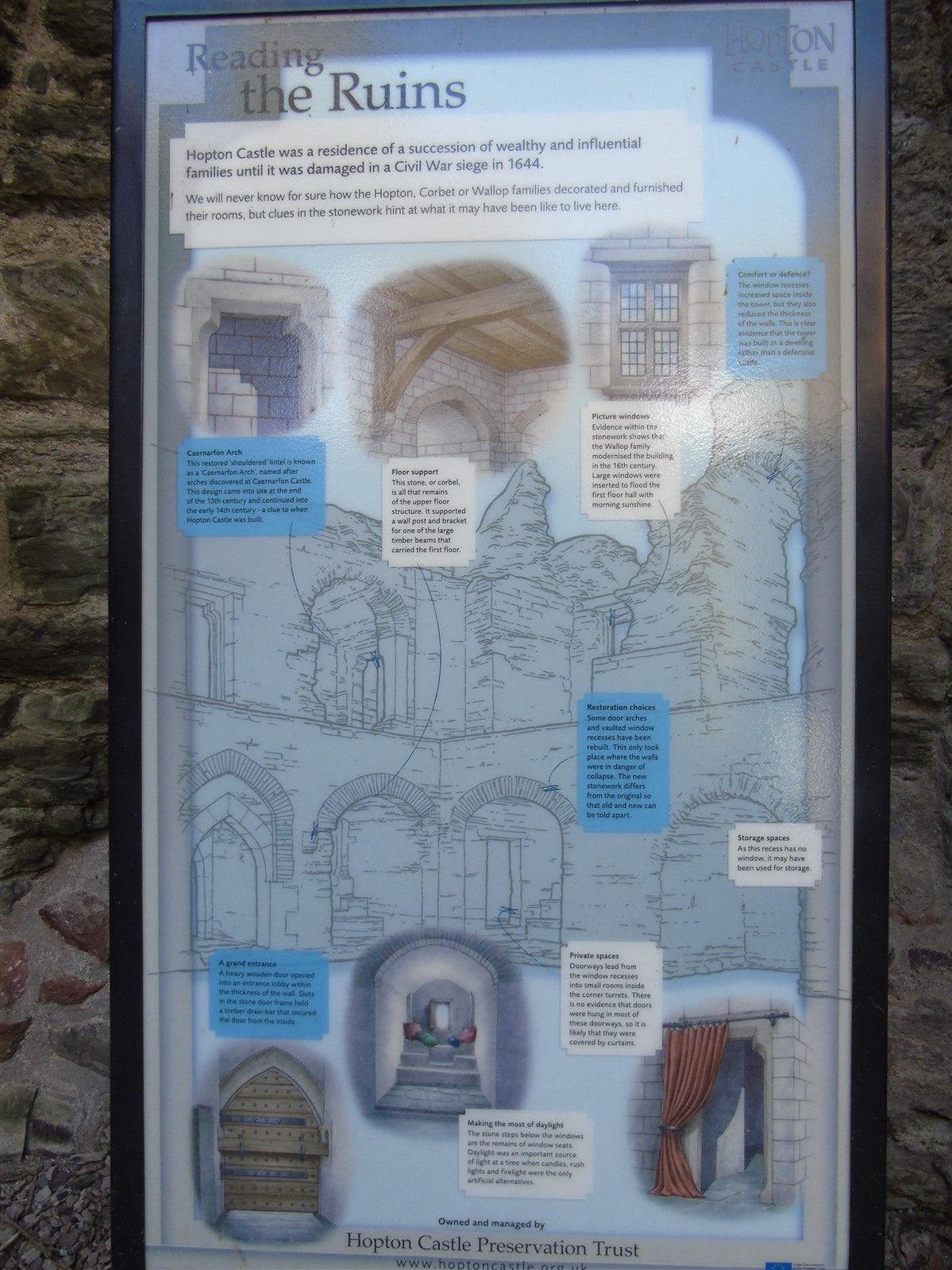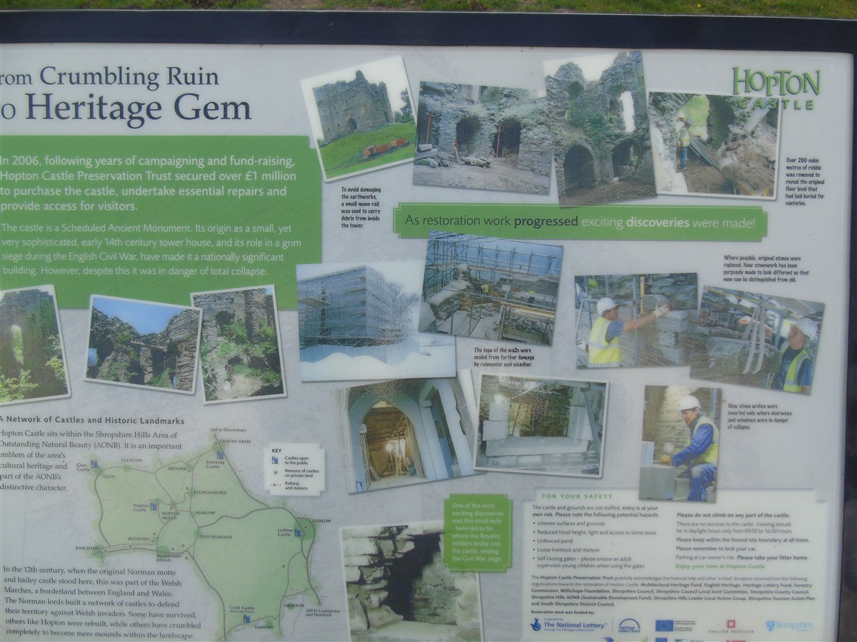 Hopton Castle tower keep castle survives well, is well documented and represents one of the finest examples of its class in the county. The motte and bailey earthworks remain largely undisturbed and will contain stratified archaeological information concerning both their method and date of construction and evidence of occupation on the site. The keep, although in ruinous condition, is a valuable example of 14th century castle architecture. The foundations of the domestic buildings associated with the occupation of the castle, together with evidence of the various processes carried out within the castle confines, will survive within the interior of the baileys. Environmental evidence relating to the landscape in which the monument was constructed will be preserved in the fill of the various ditches and on the old land surfaces sealed beneath the motte and the various ramparts. Organic material may survive in the wet areas of the bailey ditch and fishpond. Such complex motte and bailey castles contribute valuable information concerning the rural settlement pattern, economy, social organisation and military technology of the medieval period.