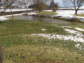 The outer bailey is L-shaped and lies to the W and S of the inner bailey. The W side is 70.0m in length, the S side is 130.0m in length. The bailey contains no visible features. A ditch on the S side is cut into a gentle N-facing slope and is 12.0m in width, and from 1.7 to 2.0m in depth. It continues around the E end of the bailey and is partly waterfilled on the N side, where it possibly served as a fishpond, the depression being rectangular, 50.0m in length, 17.0m in width, 2.0m in depth. At the W end of this depression, it links up with the motte and inner bailey ditches. A line of low scarps along the N and E sides of the site were probably constructed to minimise flooding by the stream, though it would probably have been directed by leats into the ditches. There is nothing to be seen at the site of chapel noted by VCH on their plan (F1 ASP 19-OCT-73). (PastScape)