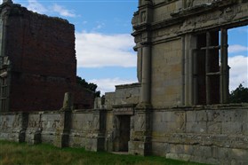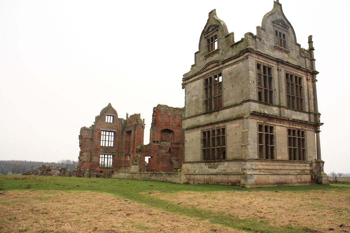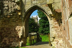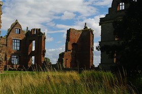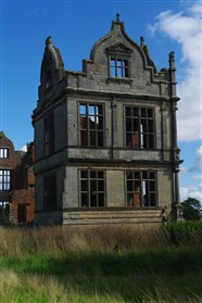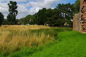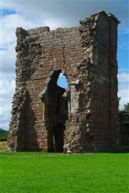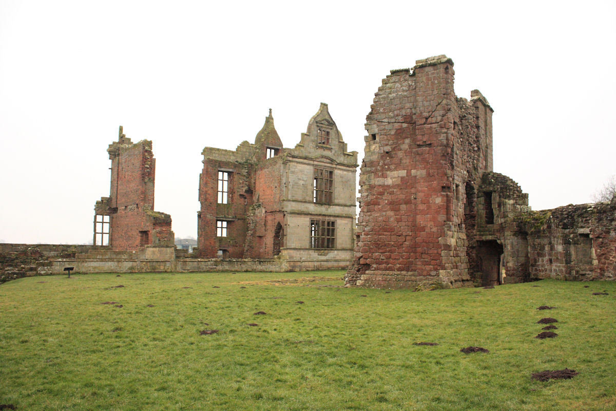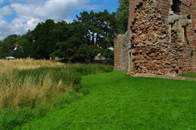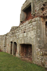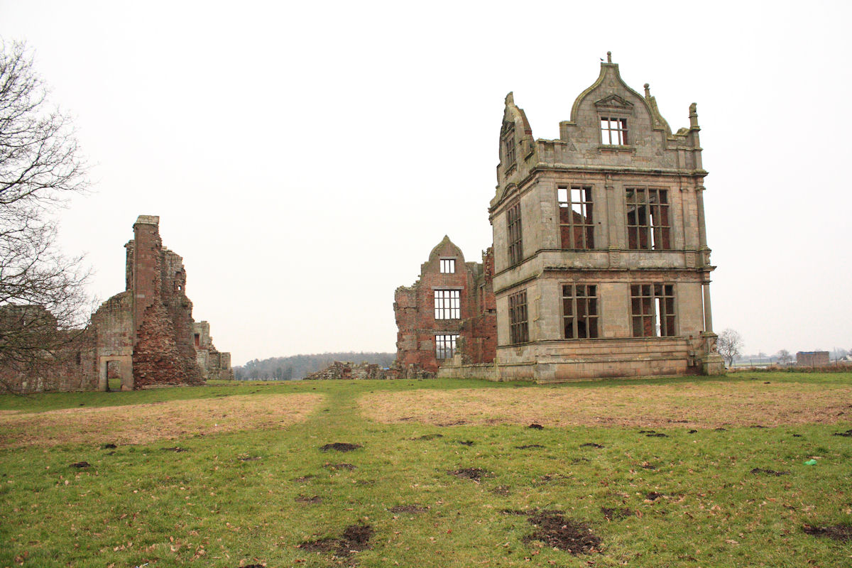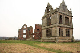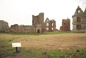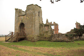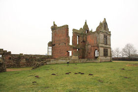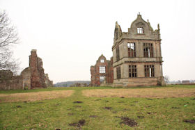 The monument includes the earthwork, ruined and buried remains of the medieval enclosure castle at Moreton Corbet, the ruined and buried remains of the country house to which it was converted in the 16th century, and the earthwork and buried remains of its formal gardens protected within three separate areas. Moreton Corbet is situated on low-lying ground on the west side of the Roden Valley, 12km north east of Shrewsbury. The medieval castle was established by the Toret family, probably in the 12th century, and was then known as Moreton Toret. It consisted of a small keep on the west side of a moated platform, and was probably surrounded by a timber stockade. The property passed by marriage to the Corbets of Wattlesborough, who provided the castle with a stone curtain wall with a gatehouse in its north east angle. A medieval settlement is known to have grown up around the castle and was still inhabited in 1503, but appears to have been deserted when the castle was rebuilt soon after this date. Its remains will have been modified by the construction of post-medieval buildings and roads, and the aerodrome to the south, and they are not included in the scheduling. The 16th century remodelling of the castle took place in two phases. The first has not been precisely dated, however the style of the remains suggests it was underway during the 1560s, under the ownership of Sir Andrew Corbet, who was several times Sheriff of Salop. During this phase the gatehouse was extensively refaced and part of the curtain wall between it and the keep was rebuilt. A new east range was constructed, along a different alignment from the curtain wall, with a great hall at its southern end which encroached on the earlier moat. The second phase of remodelling involved the construction of an L-shaped south range, arranged around a courtyard and incorporating the recently rebuilt east range. The south range is dated 1579 and, although begun in Sir Andrew's lifetime, it was almost certainly inspired if not designed by his eldest son Robert. Robert Corbet was a courtier and diplomat who travelled extensively in Europe and, according to Camden, 'carried away with the affectionate delight of Architecture, began to build in a barraine place a most gorgeous and stately house, after the Italian model ...'. The south range, which housed a suite of large chambers, obliterated the medieval defences and was built over a section of the infilled moat. Its southern facade still shows the ostentatious nature of its classical theme, which incorporates Doric and Ionic columns in a symmetrical design. South of the new house extensive formal gardens were created to complement its grandeur and symmetry. A contemporary document refers to 'a garden with an orchard adjoining it .... divers solars (solaria) cut into one rock, and .... divers covered walks and arbours'. Robert Corbet died in 1583 leaving his house unfinished, and during the Civil War it was damaged and subsequently set on fire by the Parliamentarian forces. Later sold by Sir Vincent Corbet to pay off his Civil War debts, the house was redeemed by Andrew Corbet in 1743; however plans for its repair were never carried out, and the Corbets' preferred residence in the 18th century was Shawbury Park. By 1776 the south range was roofless, and early 19th century drawings by Buckler show the buildings in almost the ruinous state in which they stand today. Moreton Corbet castle remains in the ownership of the Corbet family, and in the care of the Secretary of State and is Listed Grade I. St Bartholomew's Church, which is not included in the scheduling, to the north of the castle contains several monuments to the Corbet family. The remains of the medieval castle are constructed of coursed dressed sandstone blocks. The north wall and parts of the east and west walls of the keep stand to the height of the wall-walk, with parts of the parapet wall remaining. Originally rectangular in plan, the keep measured 12m x 10m externally, and has pilaster buttresses at its angles. It is divided internally into three stages, the second floor chamber probably being a later insertion, and the north wall retains a fireplace at first floor level, with the remains of a stone hood and polygonal shafts with foliate carved capitals. The 14th century curtain wall extends north eastwards from the north west angle of the keep and appears to have enclosed a roughly triangular area. Its southern extent has been obscured by later developments, however evidence for the original layout of the curtain wall will survive below ground. Two medieval sections stand between the keep and two-storey gatehouse, which retains some medieval fabric despite extensive 16th century remodelling. The gatehouse, now approached by a modern wooden staircase, has a chamfered plinth and central chamfered archway with the remains of a 16th century window above it. Rectangular windows light the first floor at either side. A carved elephant and castle decorate the datestone above the entrance which is inscribed 'SAC 1579', recording Sir Andrew Corbet's 16th century modifications to the medieval structure of the castle. The outer wall of his east range survives as standing ruin; an old drawing shows that the upper end of the great hall, the south end of the range, was formerly lit by a large mullioned and transomed bay window. The south range is also dated 1579, on a shield on the south west corner, and in the form 'ER21' at the south east corner. It is constructed of brick on a plinth of coursed sandstone blocks, and is faced in ashlar. Originally L-shaped in plan, the west face, parts of the north and east faces, and much of the south face stand to their full height. The five-bay design housed two main storeys and an attic, and had a moulded pediment and cornice. The grandeur and symmetry of the original design can still be appreciated from the remains of the south face, whose two intermediate bays are lit by three-light mullioned and tr