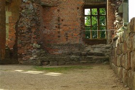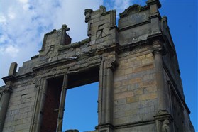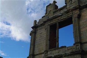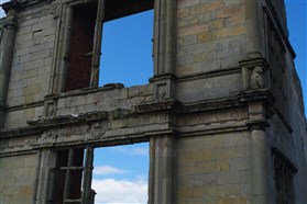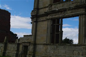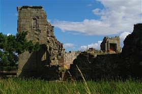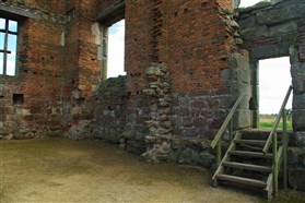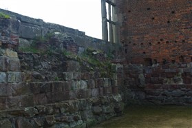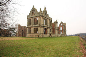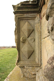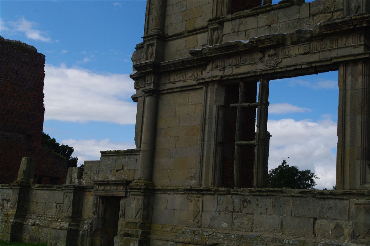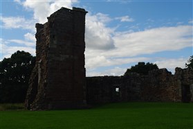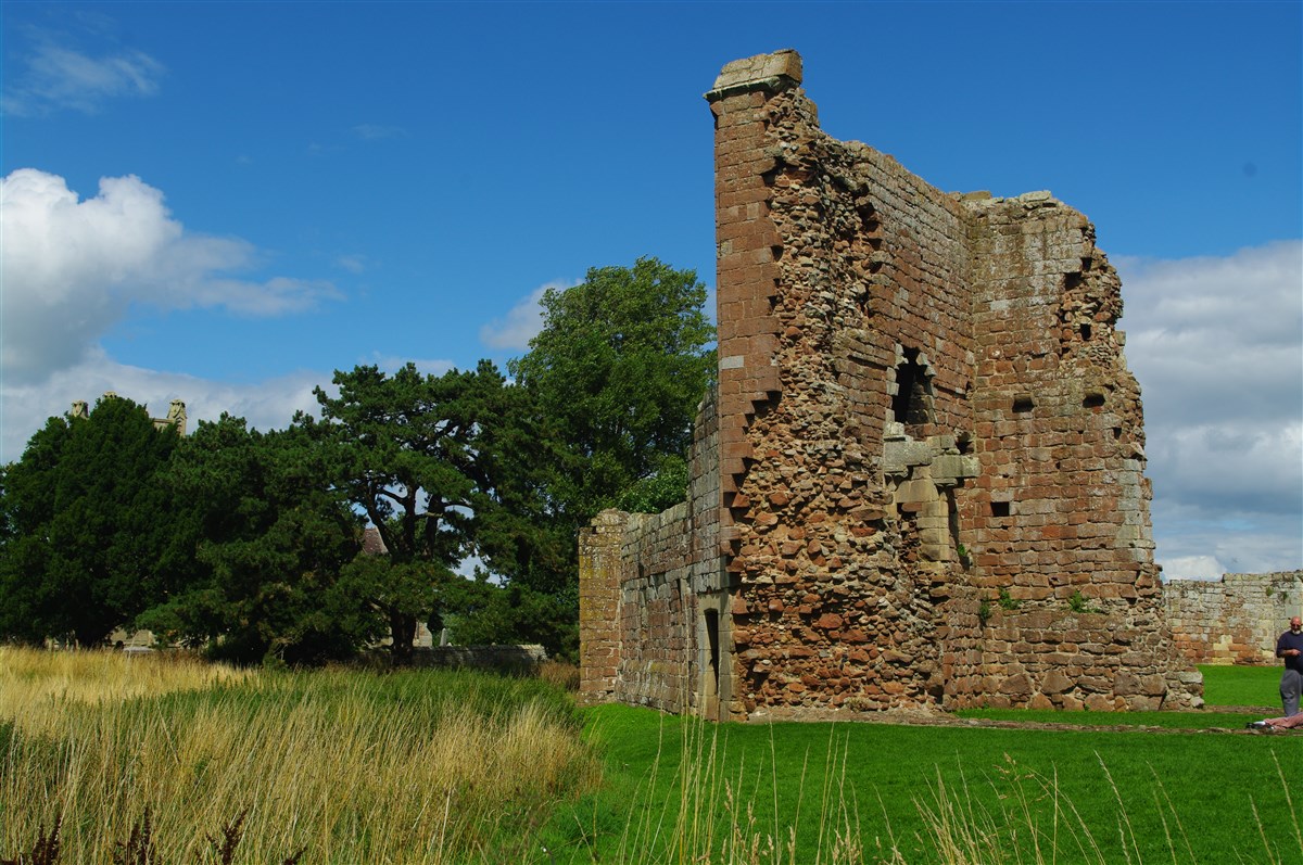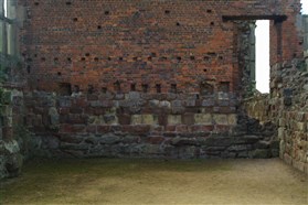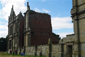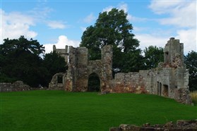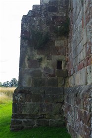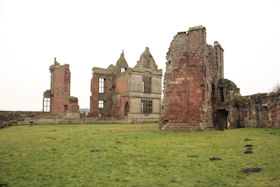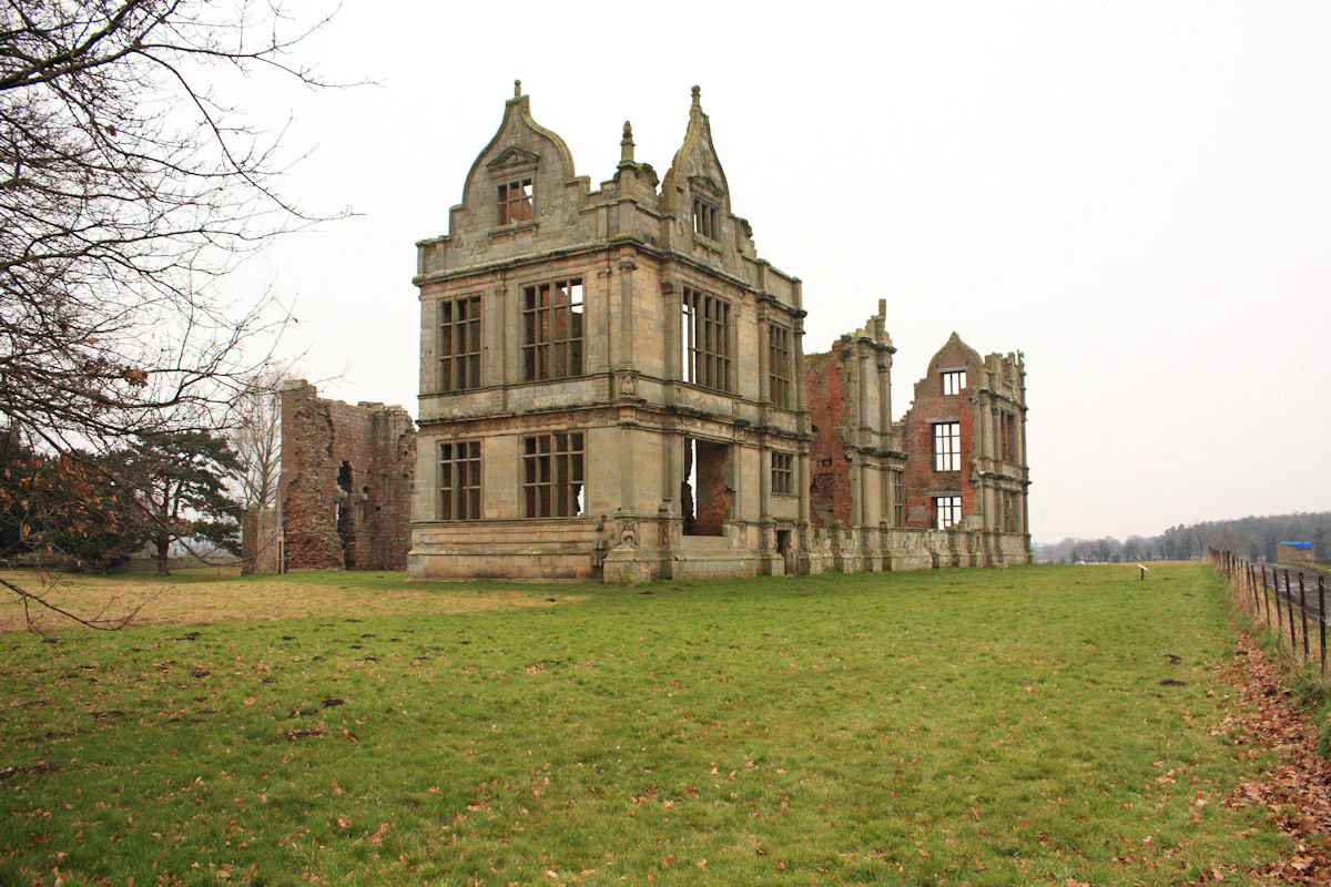 The monument includes the earthwork, ruined and buried remains of the medieval enclosure castle at Moreton Corbet, the ruined and buried remains of the country house to which it was converted in the 16th century, and the earthwork and buried remains of its formal gardens protected within three separate areas. Moreton Corbet is situated on low-lying ground on the west side of the Roden Valley, 12km north east of Shrewsbury. The medieval castle was established by the Toret family, probably in the 12th century, and was then known as Moreton Toret. It consisted of a small keep on the west side of a moated platform, and was probably surrounded by a timber stockade. The property passed by marriage to the Corbets of Wattlesborough, who provided the castle with a stone curtain wall with a gatehouse in its north east angle. A medieval settlement is known to have grown up around the castle and was still inhabited in 1503, but appears to have been deserted when the castle was rebuilt soon after this date. Its remains will have been modified by the construction of post-medieval buildings and roads, and the aerodrome to the south, and they are not included in the scheduling. The 16th century remodelling of the castle took place in two phases. The first has not been precisely dated, however the style of the remains suggests it was underway during the 1560s, under the ownership of Sir Andrew Corbet, who was several times Sheriff of Salop. During this phase the gatehouse was extensively refaced and part of the curtain wall between it and the keep was rebuilt. A new east range was constructed, along a different alignment from the curtain wall, with a great hall at its southern end which encroached on the earlier moat. The second phase of remodelling involved the construction of an L-shaped south range, arranged around a courtyard and incorporating the recently rebuilt east range. The south range is dated 1579 and, although begun in Sir Andrew's lifetime, it was almost certainly inspired if not designed by his eldest son Robert. Robert Corbet was a courtier and diplomat who travelled extensively in Europe and, according to Camden, 'carried away with the affectionate delight of Architecture, began to build in a barraine place a most gorgeous and stately house, after the Italian model ...'. The south range, which housed a suite of large chambers, obliterated the medieval defences and was built over a section of the infilled moat. Its southern facade still shows the ostentatious nature of its classical theme, which incorporates Doric and Ionic columns in a symmetrical design. South of the new house extensive formal gardens were created to complement its grandeur and symmetry. A contemporary document refers to 'a garden with an orchard adjoining it .... divers solars (solaria) cut into one rock, and .... divers covered walks and arbours'. Robert Corbet died in 1583 leaving his house unfinished, and during the Civil War it was damaged and subsequently set on fire by the Parliamentarian forces. Later sold by Sir Vincent Corbet to pay off his Civil War debts, the house was redeemed by Andrew Corbet in 1743; however plans for its repair were never carried out, and the Corbets' preferred residence in the 18th century was Shawbury Park. By 1776 the south range was roofless, and early 19th century drawings by Buckler show the buildings in almost the ruinous state in which they stand today. Moreton Corbet castle remains in the ownership of the Corbet family, and in the care of the Secretary of State and is Listed Grade I. St Bartholomew's Church, which is not included in the scheduling, to the north of the castle contains several monuments to the Corbet family. The remains of the medieval castle are constructed of coursed dressed sandstone blocks. The north wall and parts of the east and west walls of the keep stand to the height of the wall-walk, with parts of the parapet wall remaining. Originally rectangular in plan, the keep measured 12m x 10m externally, and has pilaster buttresses at its angles. It is divided internally into three stages, the second floor chamber probably being a later insertion, and the north wall retains a fireplace at first floor level, with the remains of a stone hood and polygonal shafts with foliate carved capitals. The 14th century curtain wall extends north eastwards from the north west angle of the keep and appears to have enclosed a roughly triangular area. Its southern extent has been obscured by later developments, however evidence for the original layout of the curtain wall will survive below ground. Two medieval sections stand between the keep and two-storey gatehouse, which retains some medieval fabric despite extensive 16th century remodelling. The gatehouse, now approached by a modern wooden staircase, has a chamfered plinth and central chamfered archway with the remains of a 16th century window above it. Rectangular windows light the first floor at either side. A carved elephant and castle decorate the datestone above the entrance which is inscribed 'SAC 1579', recording Sir Andrew Corbet's 16th century modifications to the medieval structure of the castle. The outer wall of his east range survives as standing ruin; an old drawing shows that the upper end of the great hall, the south end of the range, was formerly lit by a large mullioned and transomed bay window. The south range is also dated 1579, on a shield on the south west corner, and in the form 'ER21' at the south east corner. It is constructed of brick on a plinth of coursed sandstone blocks, and is faced in ashlar. Originally L-shaped in plan, the west face, parts of the north and east faces, and much of the south face stand to their full height. The five-bay design housed two main storeys and an attic, and had a moulded pediment and cornice. The grandeur and symmetry of the original design can still be appreciated from the remains of the south face, whose two intermediate bays are lit by three-light mullioned and tr