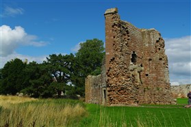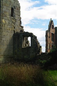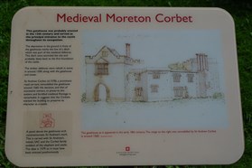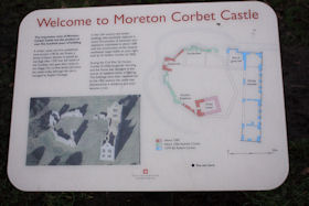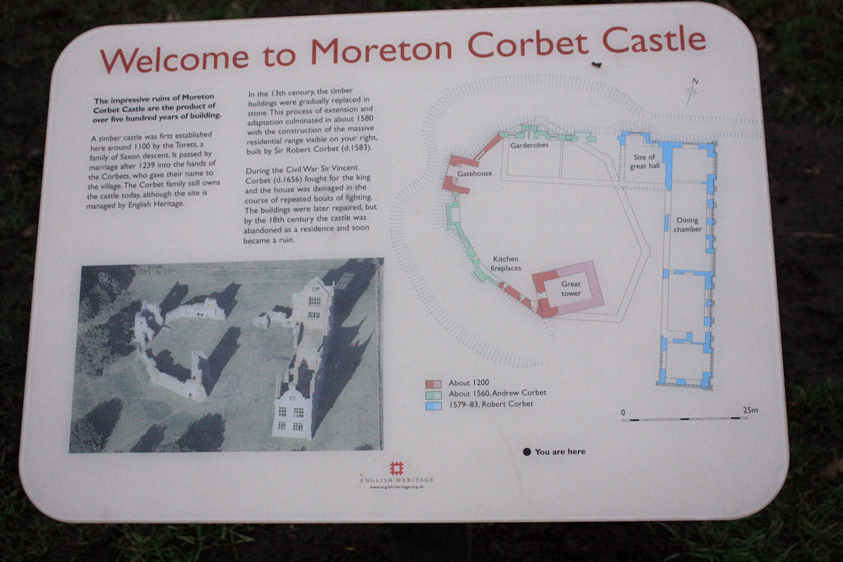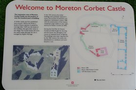 Moreton Corbet is first mentioned in Domesday of 1086 when 2 lords, Hunning and Wulfgeat, were living there, possibly in the first castle. The manor then passed to the Verleys who subinfeudated Toret. His great grandson, Bartholomew Toret, left an heiress who married Richard Corbet who thereby inherited the castle in 1235. The castle remained in Corbet hands till shortly after the civil war when it was sold to cover war costs. The casle remained occupied until c.1730 when it fell into ruins and was then repurchased by the Corbets. It was not burned in the civil war as is often stated. (Paul Martin Remfry 1999)