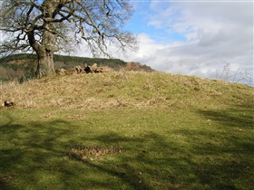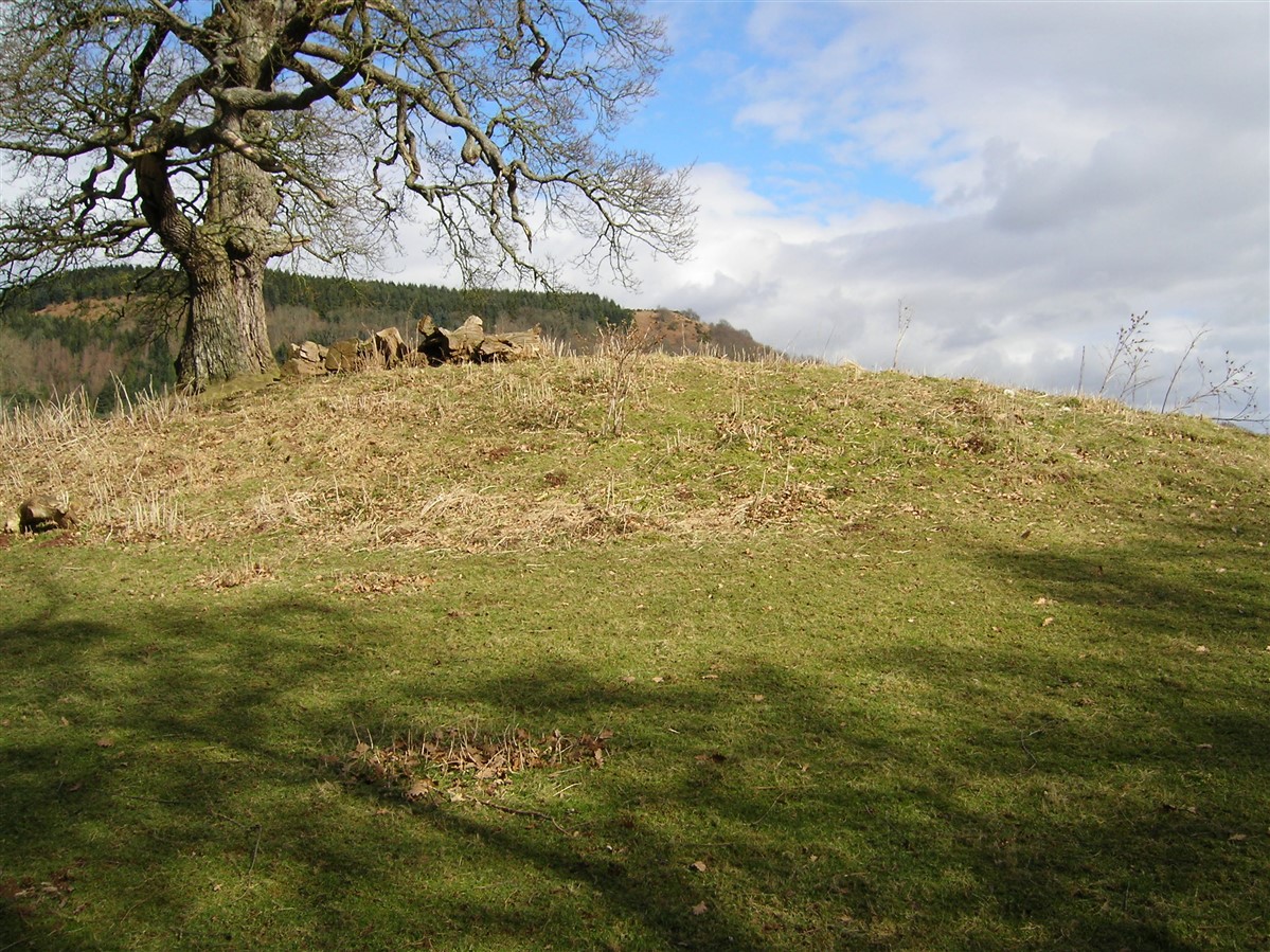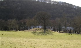 A motte (also suggested as a possible round barrow) situated in the flood plain of the River Clun, close to the river. It measures apx 40m in diameter at its base and is about 2.5m high. Ploughing has spread and reduced the height of this mound. There are no visible indications of the surrounding ditch. It lies within an unimproved pasture field and is surmounted by an old oak tree. It is possibly associated with the motte and bailey castle at Clun, also occupying a position next to the river about 5.5km to the south east (Reid 1999). (Shropshire HER)